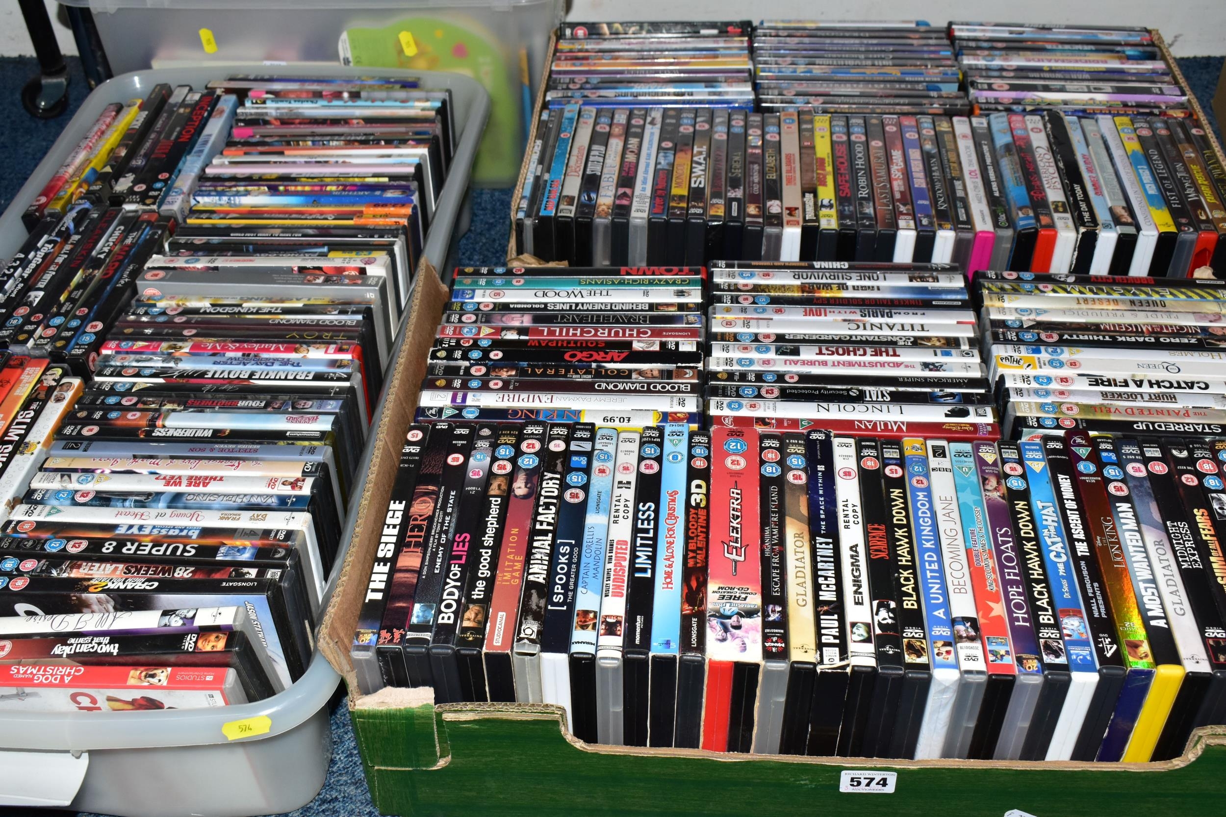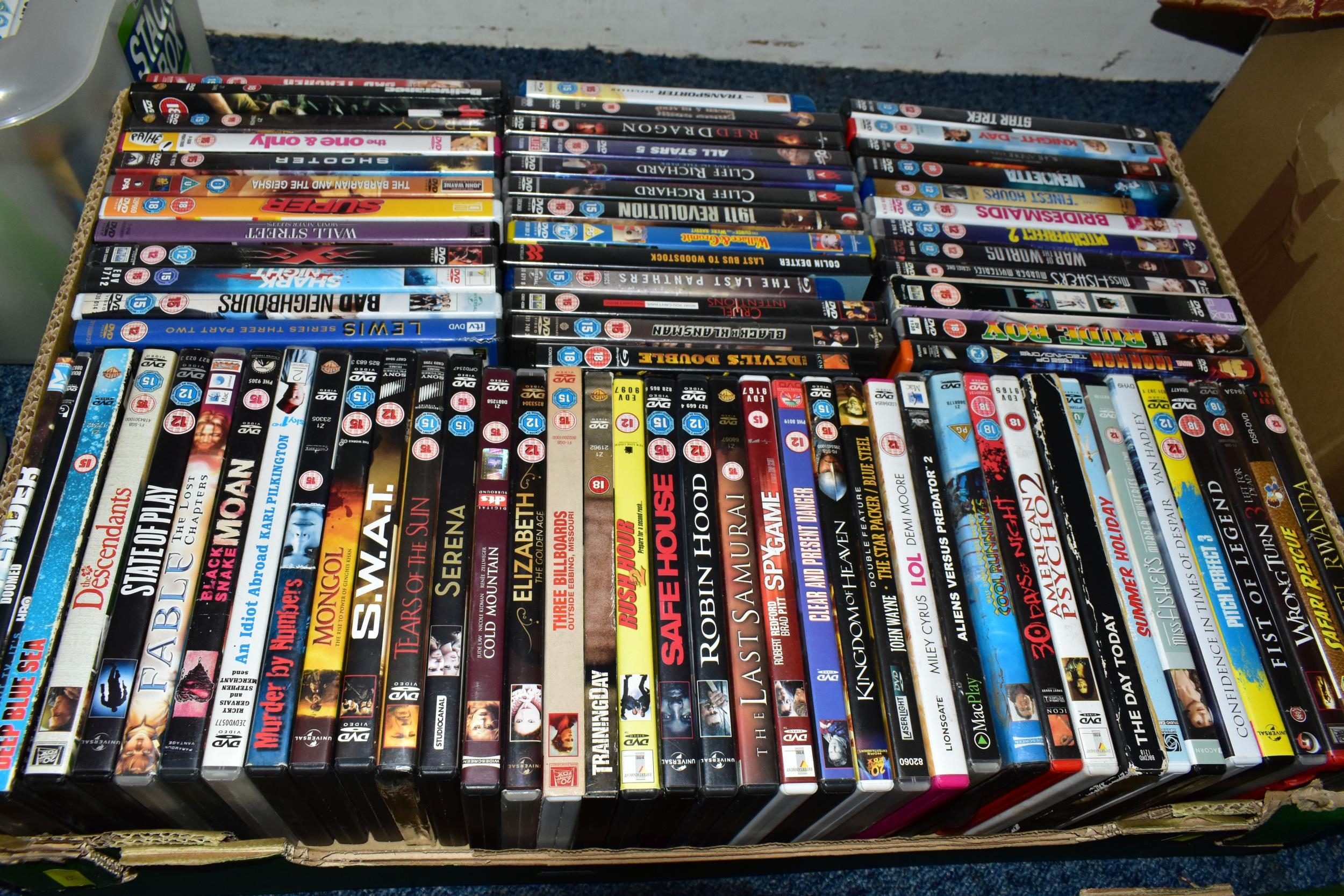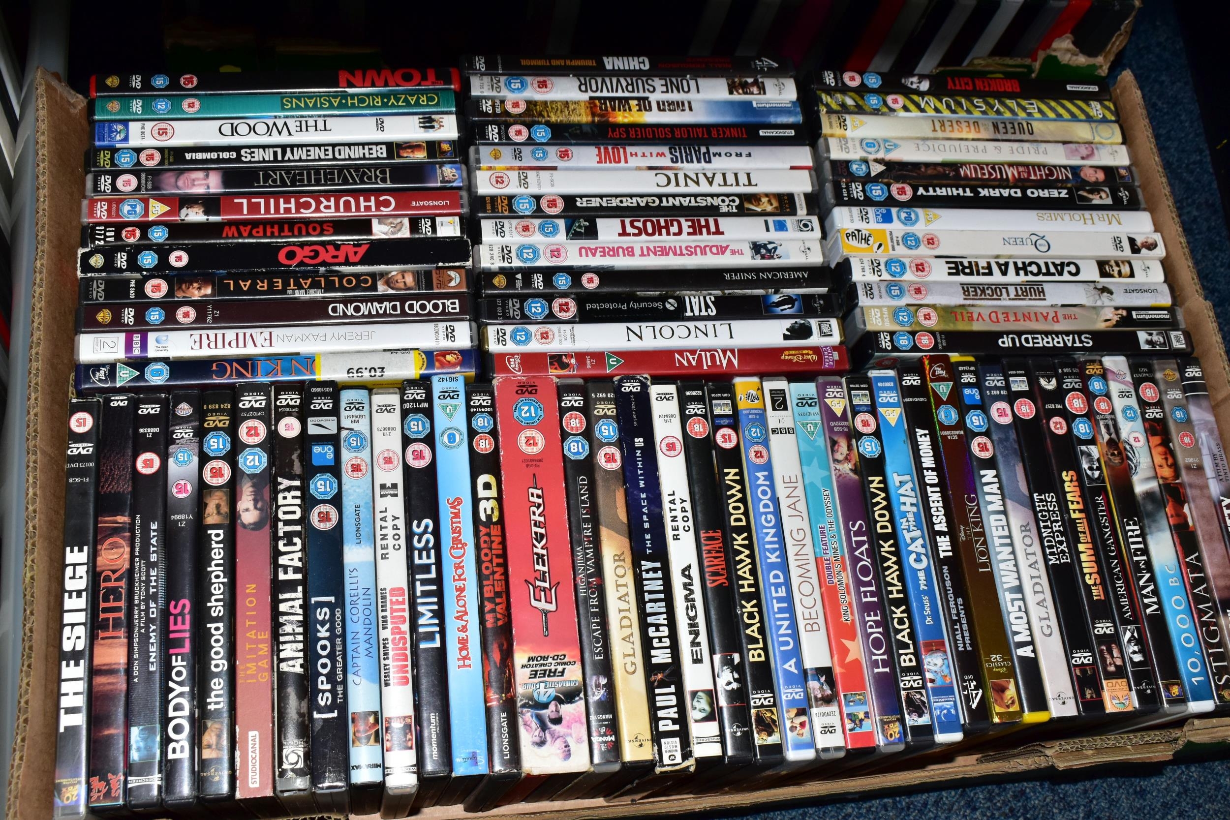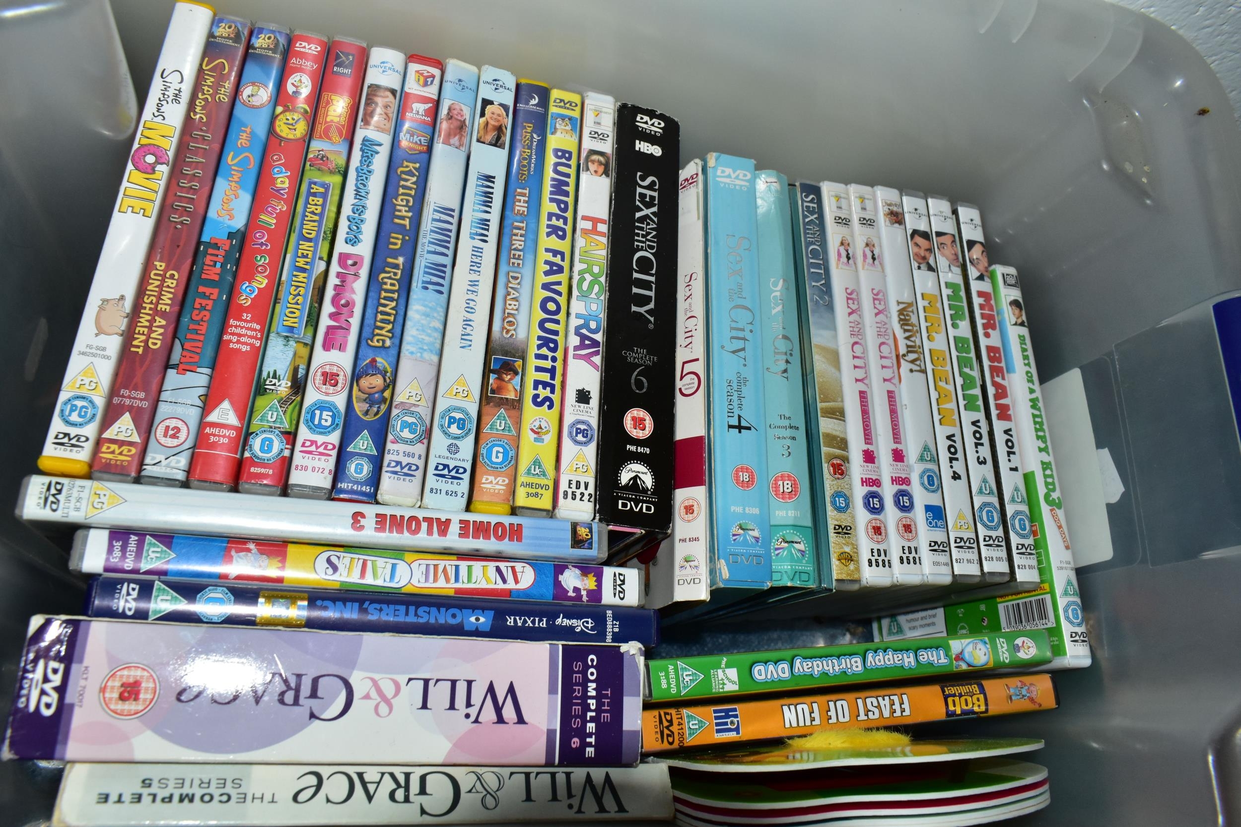 FOUR BOXES OF DVDS, approximately one hundred and eighty DVDs, mainly feature films, with some TV boxsets, comedy and children's films (4 boxes)