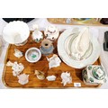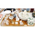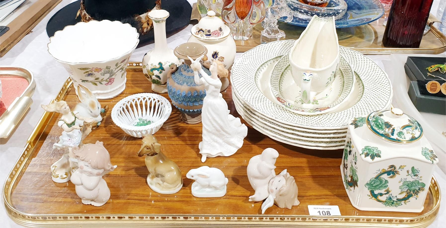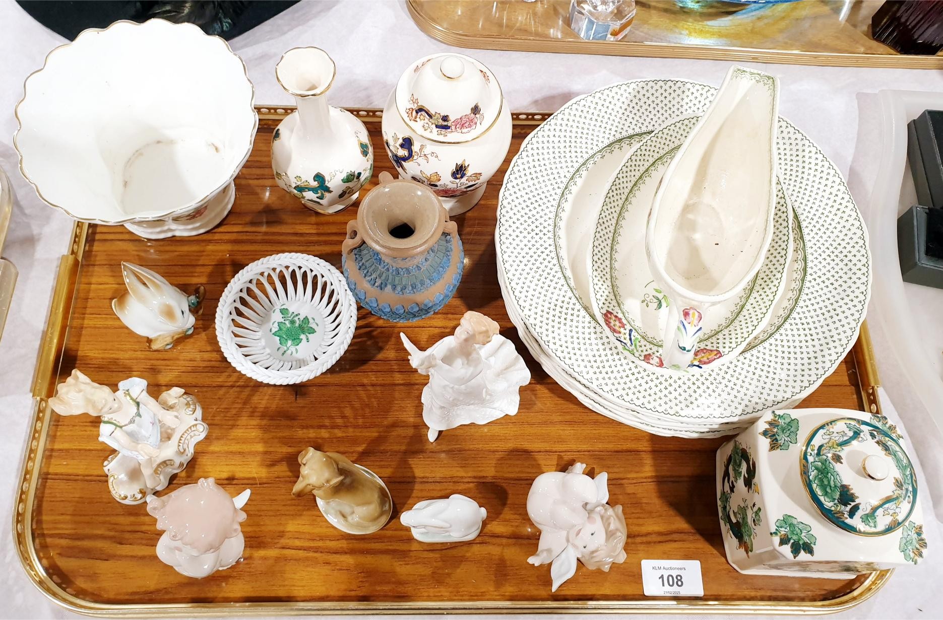 A tray of ceramics including a Royal Crown Derby figure "Springtime", Royal Doulton, Nao and Mason's. No shipping. Arrange collection or your own packer and shipper, please. Electricals are sold as scrap.