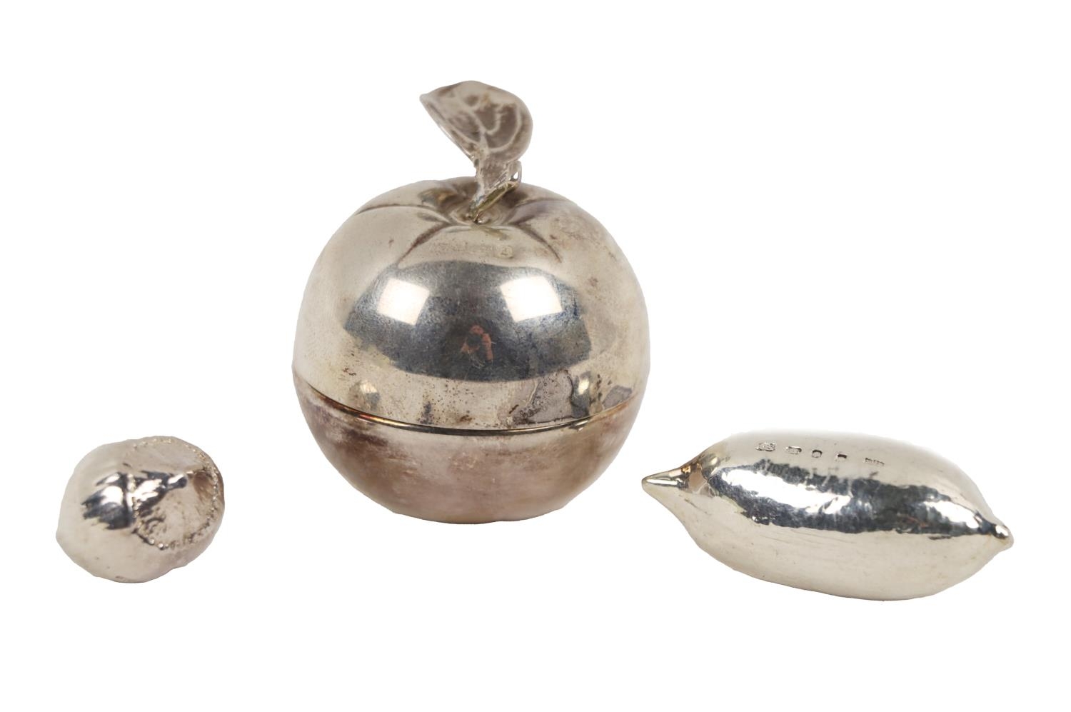 An attractive silver Pill Box, modelled as an apple, hallmarked Birmingham by Victoria Silverware Ltd., also a silver Nut and Pea Pod (filled), hallmarked C.S. as curiosities. (3)