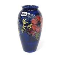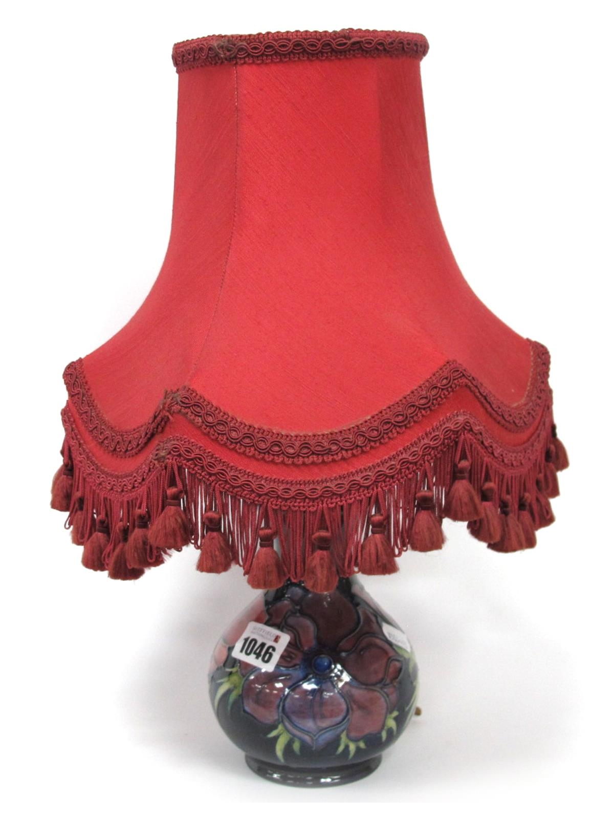 A Moorcroft Pottery Table Lamp, painted in the 'Anemone' pattern with pink and purple flowers against a dark blue ground, impressed and painted marks, 16cm high.