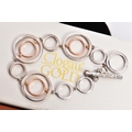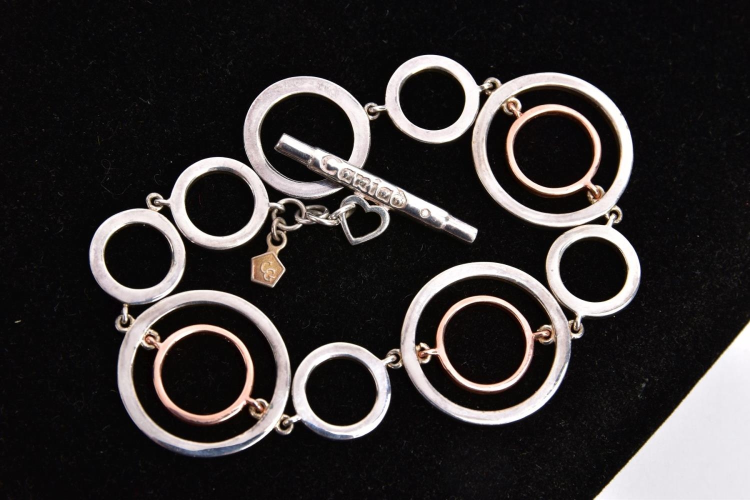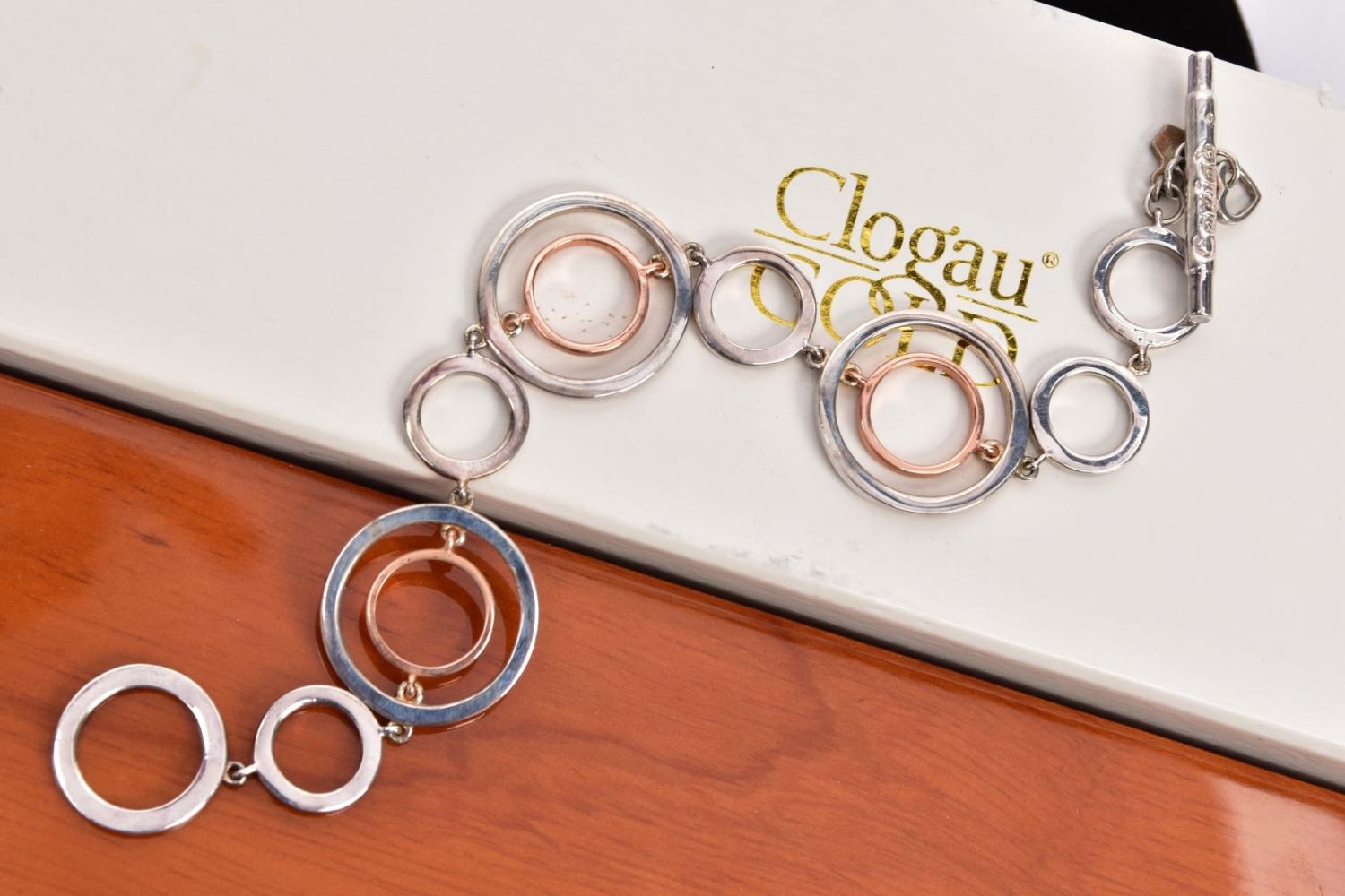 A CLOGAU SILVER AND GOLD BRACELET, openwork rose gold and silver circular links, fitted with a signed 'Clogau' toggle clasp, hallmarked silver Edinburgh, length 200mm, approximate gross weight 23.9 grams, together with a signed 'Clogau gold' fitted box with an outer box (condition report: general light wear, overall condition good)