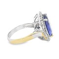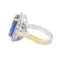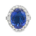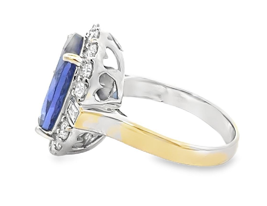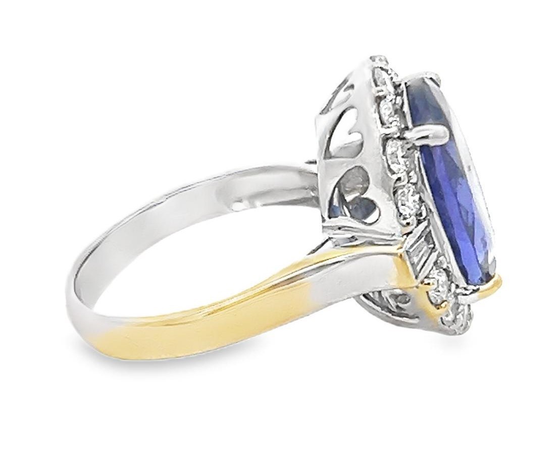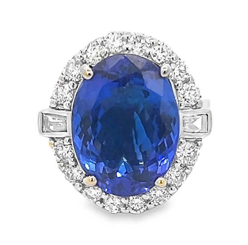 A stunning tanzanite and diamond 18ct white gold ring. The oval tanzanite of good colour and approx 7.35ct, surrounded by approx 0.88ct of round brilliant cut and tapered baguette diamonds. Weight 8.1g.