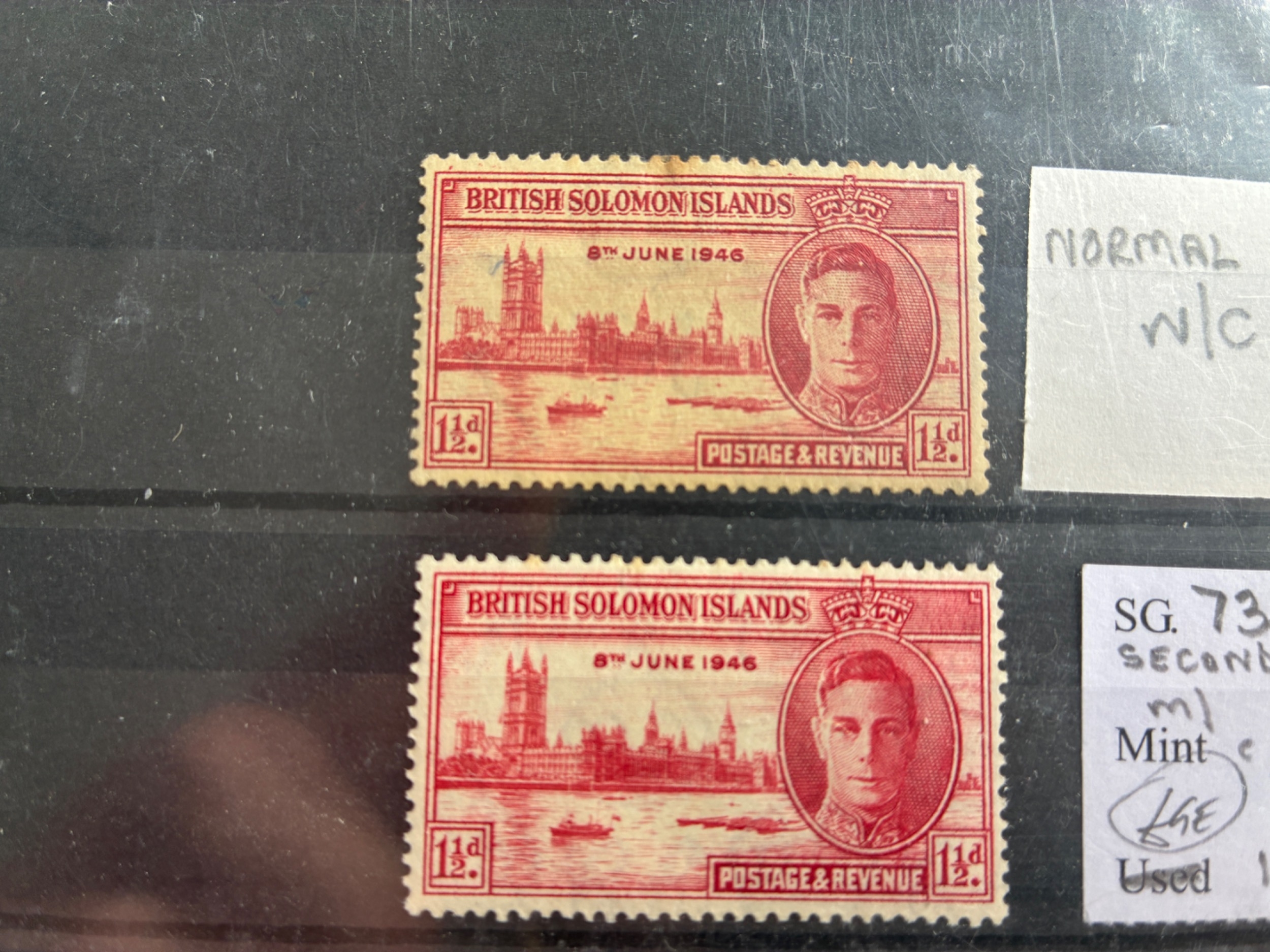 British Solomon Islands 1946 1.5d Victory stamp showing “second flag” variety, m/m. (SG 73a). Cat £40