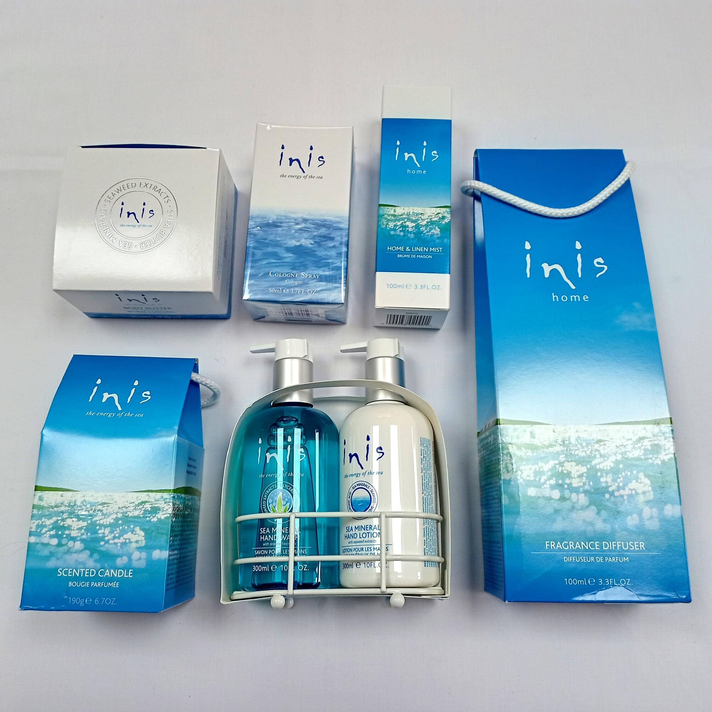 Box of cosmetic products from Inis - Inis products from Fragrances of Ireland capture the fresh, clean essence of the Irish coastline. Inspired by the sea, each fragrance evokes a sense of tranquility and nature, offering invigorating scents through luxurious body care, candles, and perfumes.