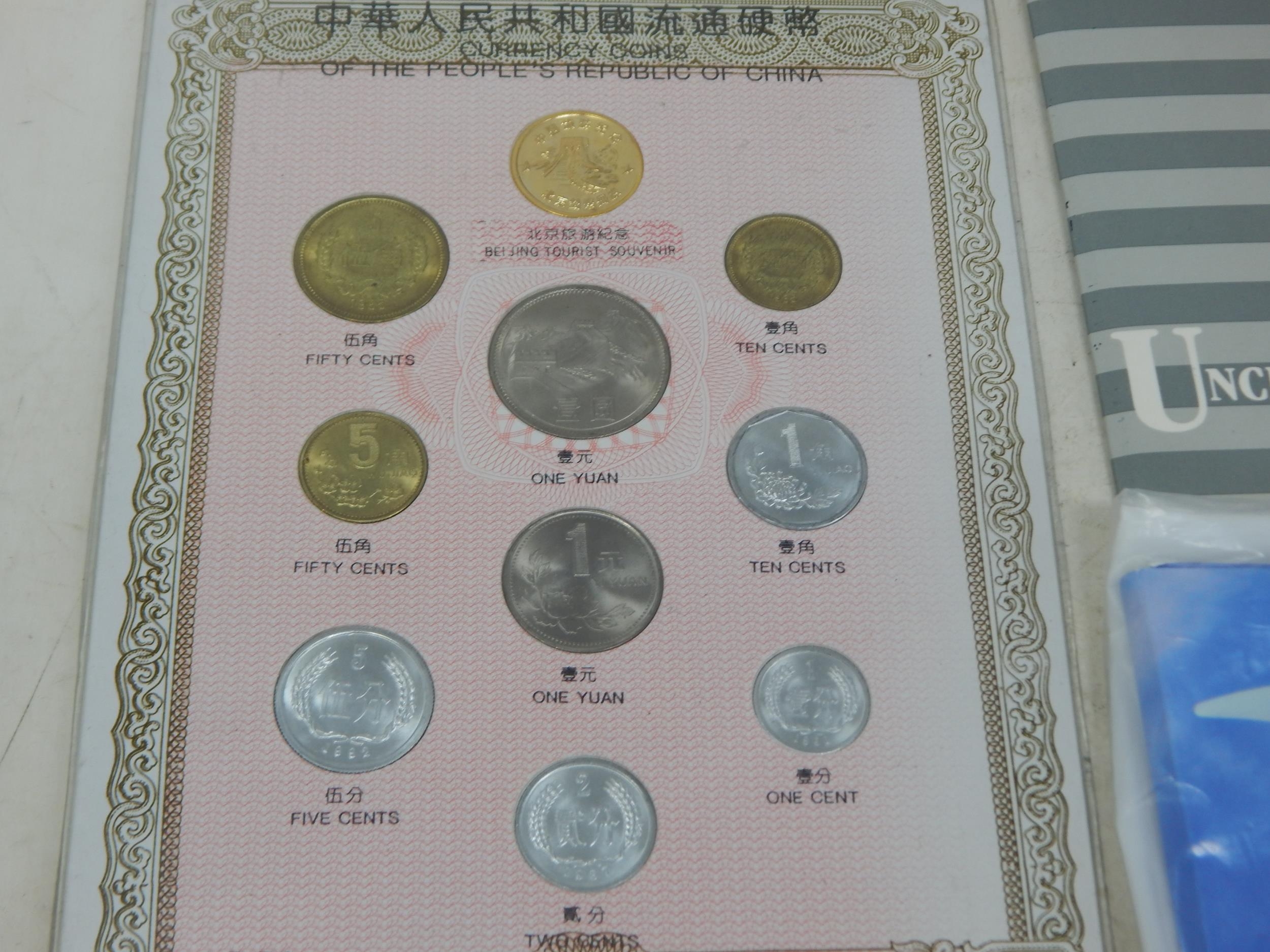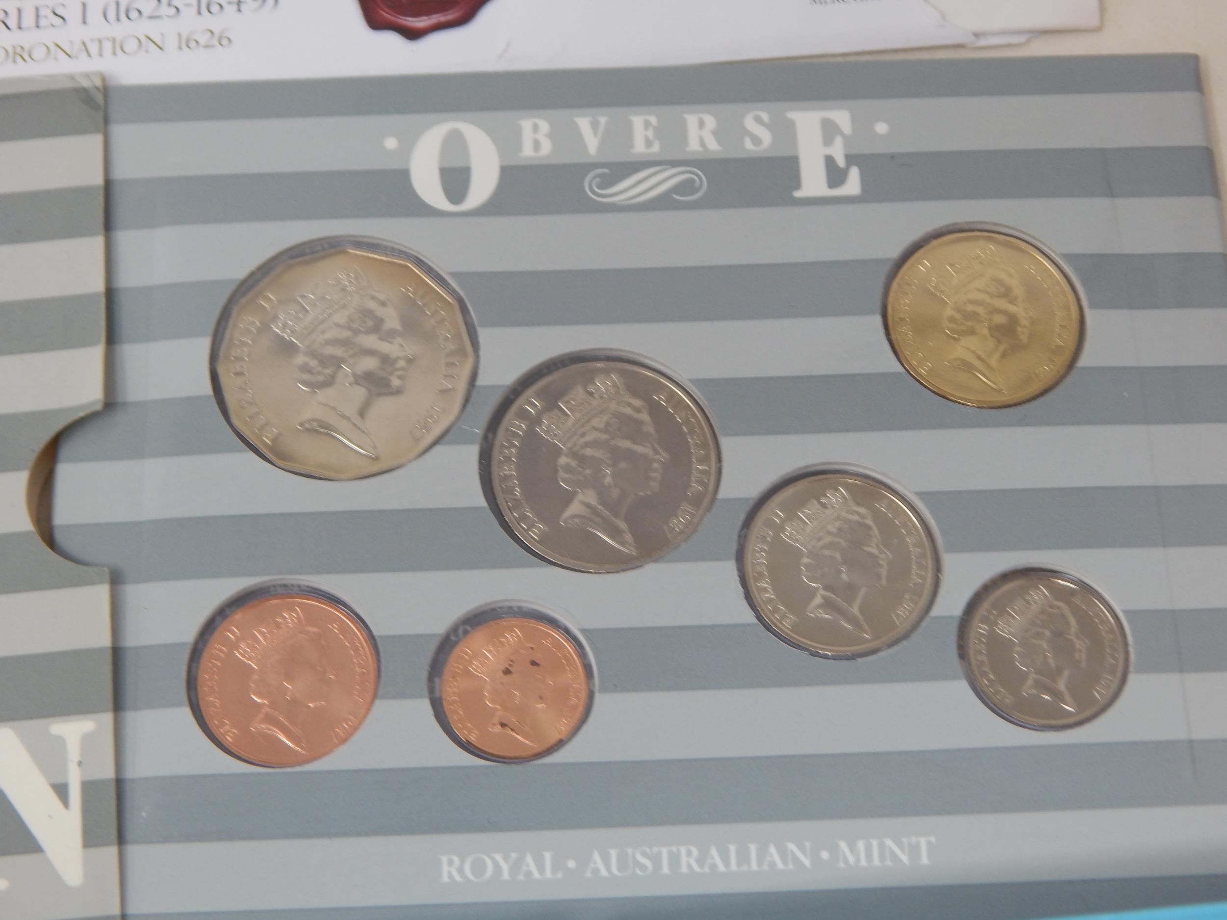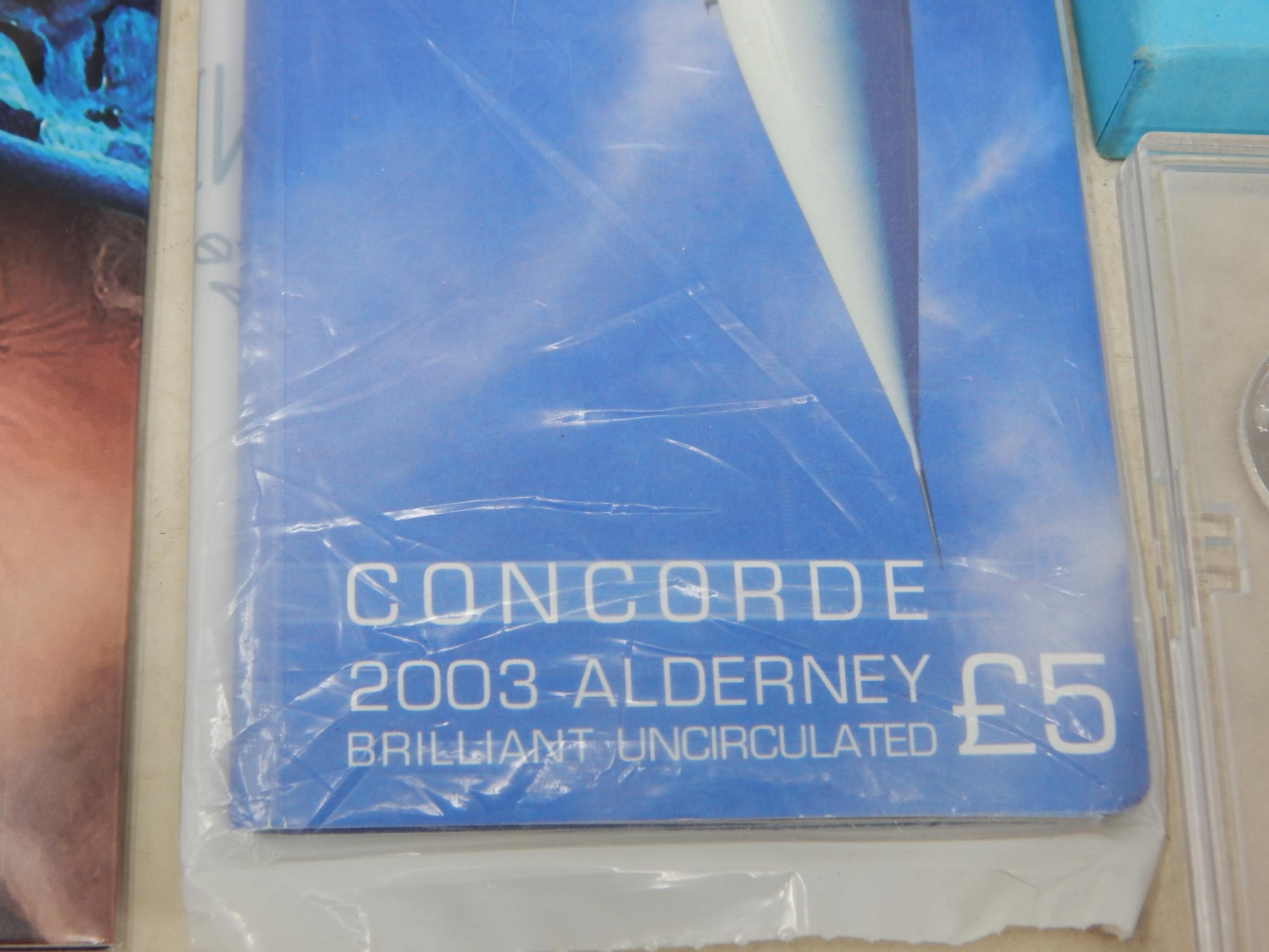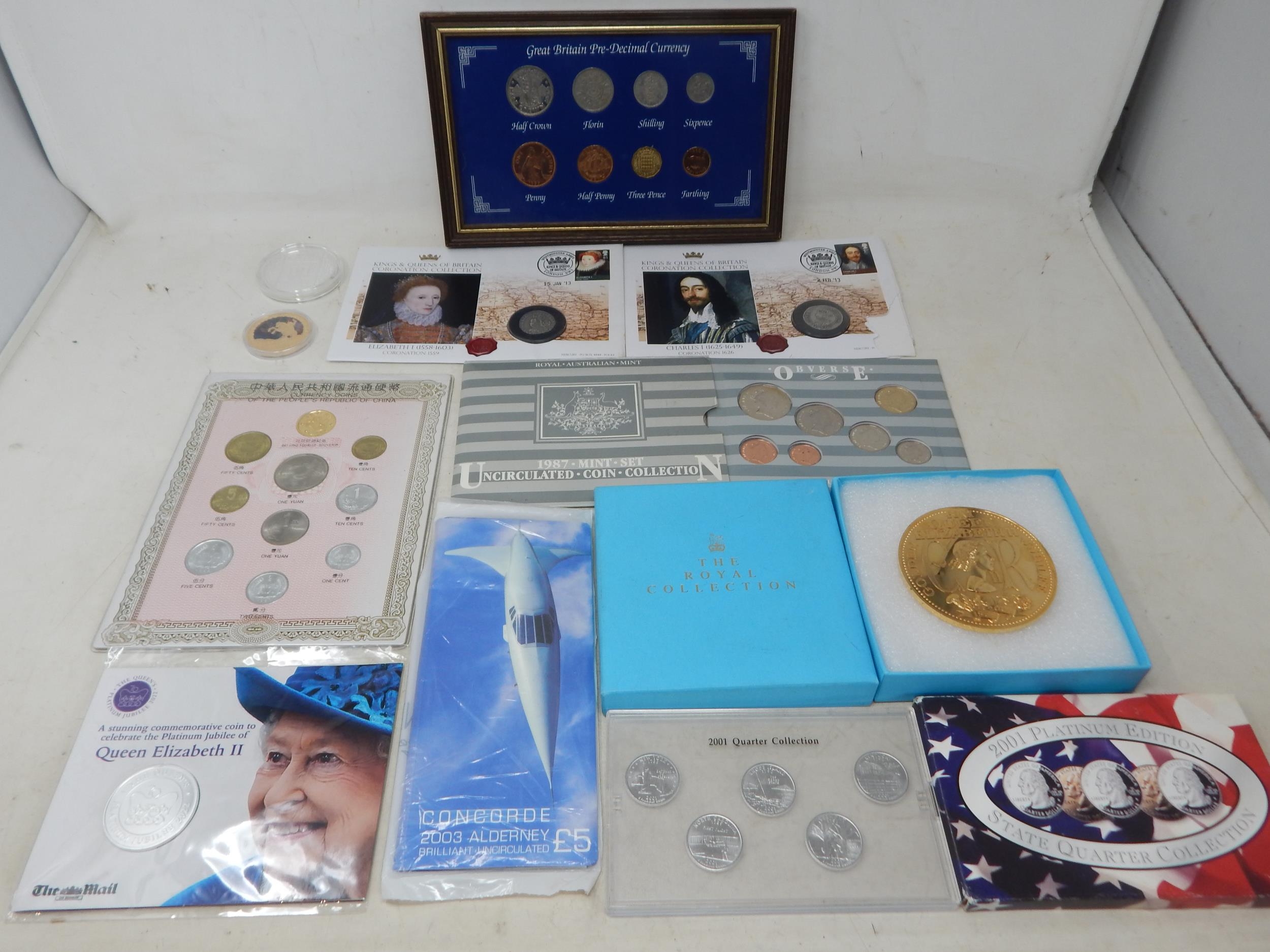 Alderney Concorde 2003 £5 Brilliant Uncirculated coin in pack, Kings and Queens of Britain Elizabeth 1 and Charles 1 replica coins on covers, Australia 1987 Uncirculated coin collection in pack, People's Republic of China coin set, The Royal Collection Queen Elizabeth II 77mm Gold plated medallion in case, other coins, etc (lot)