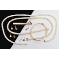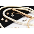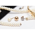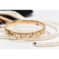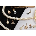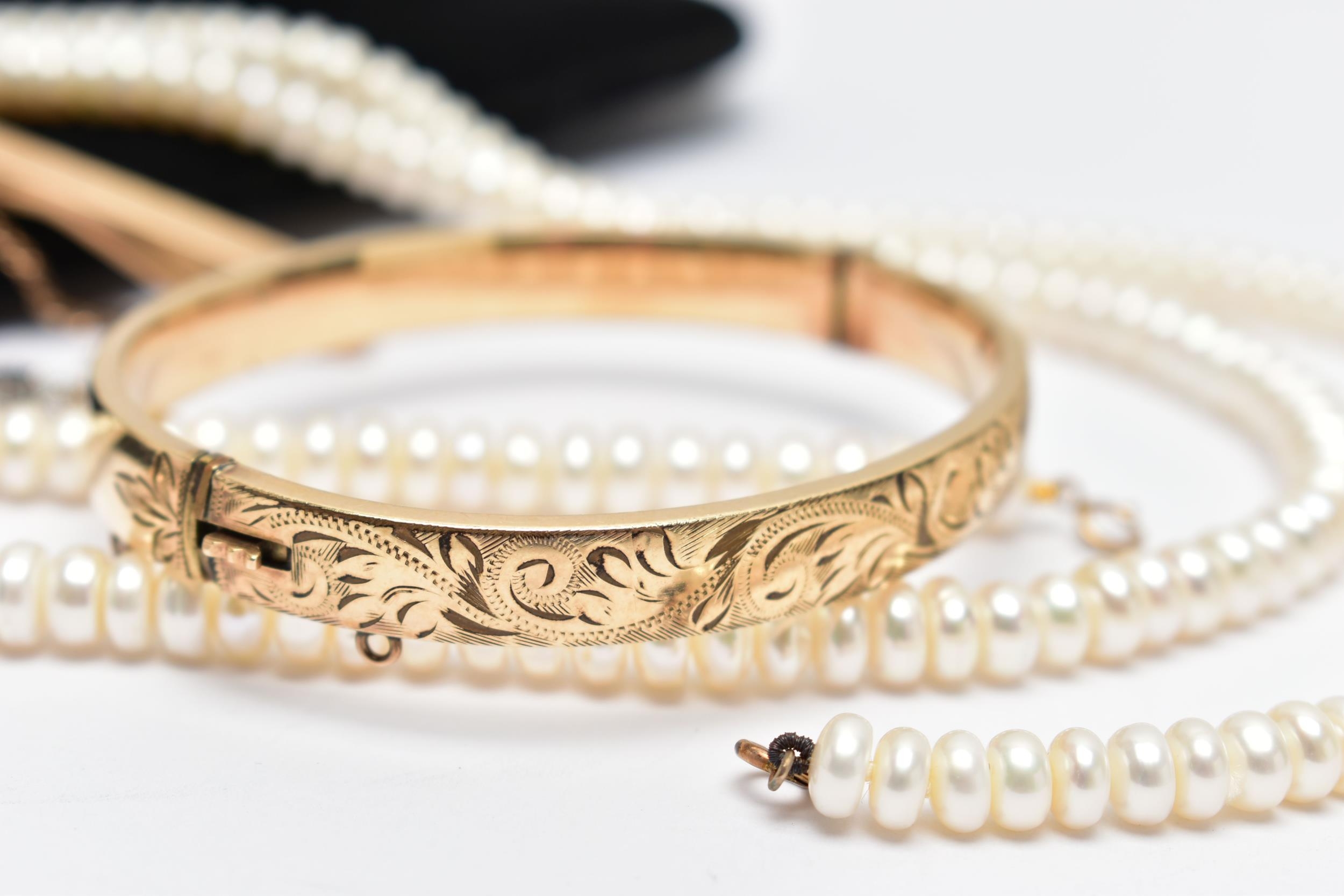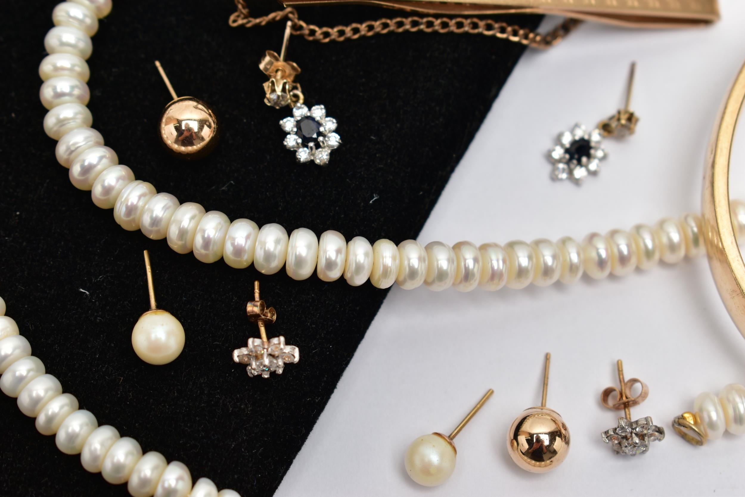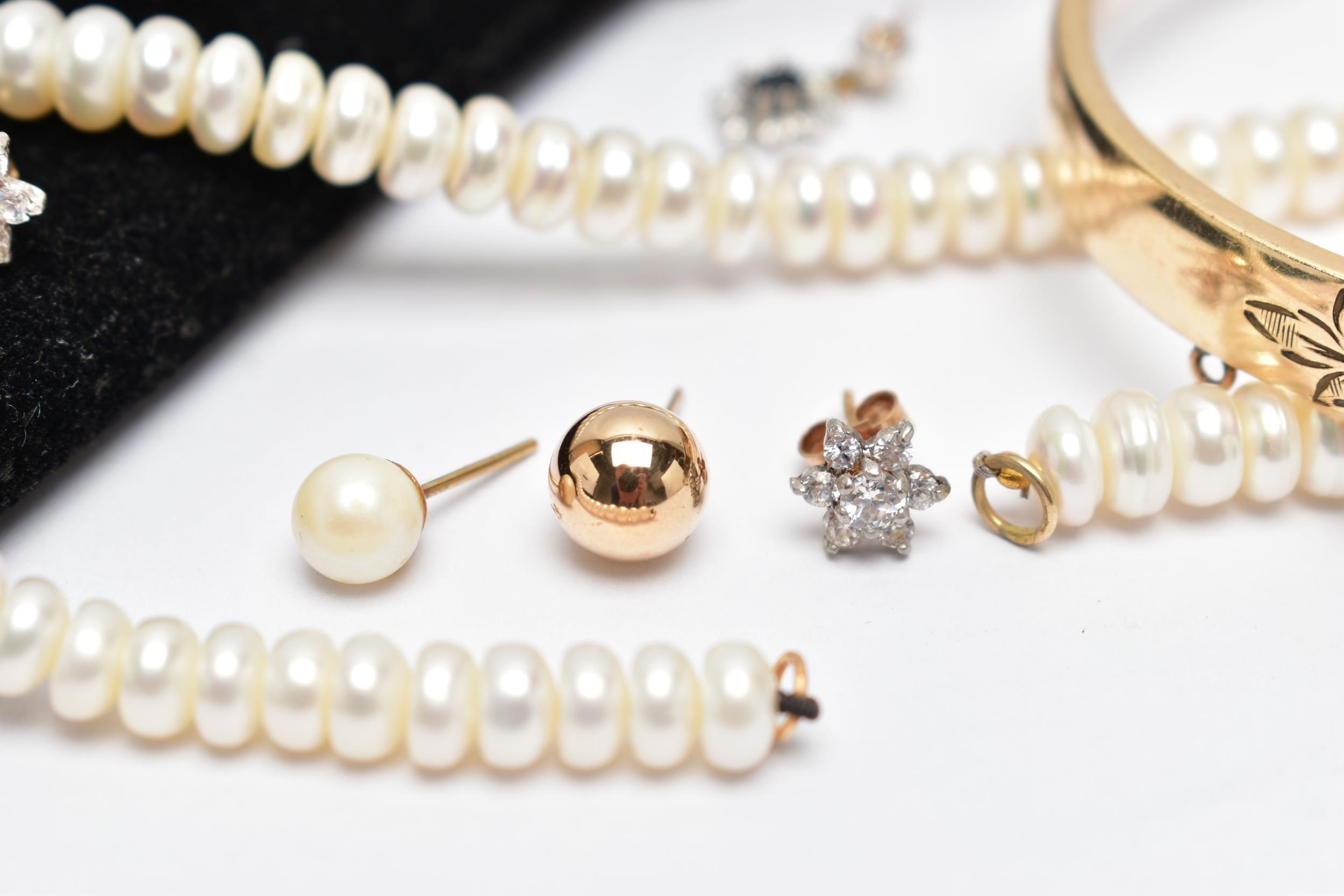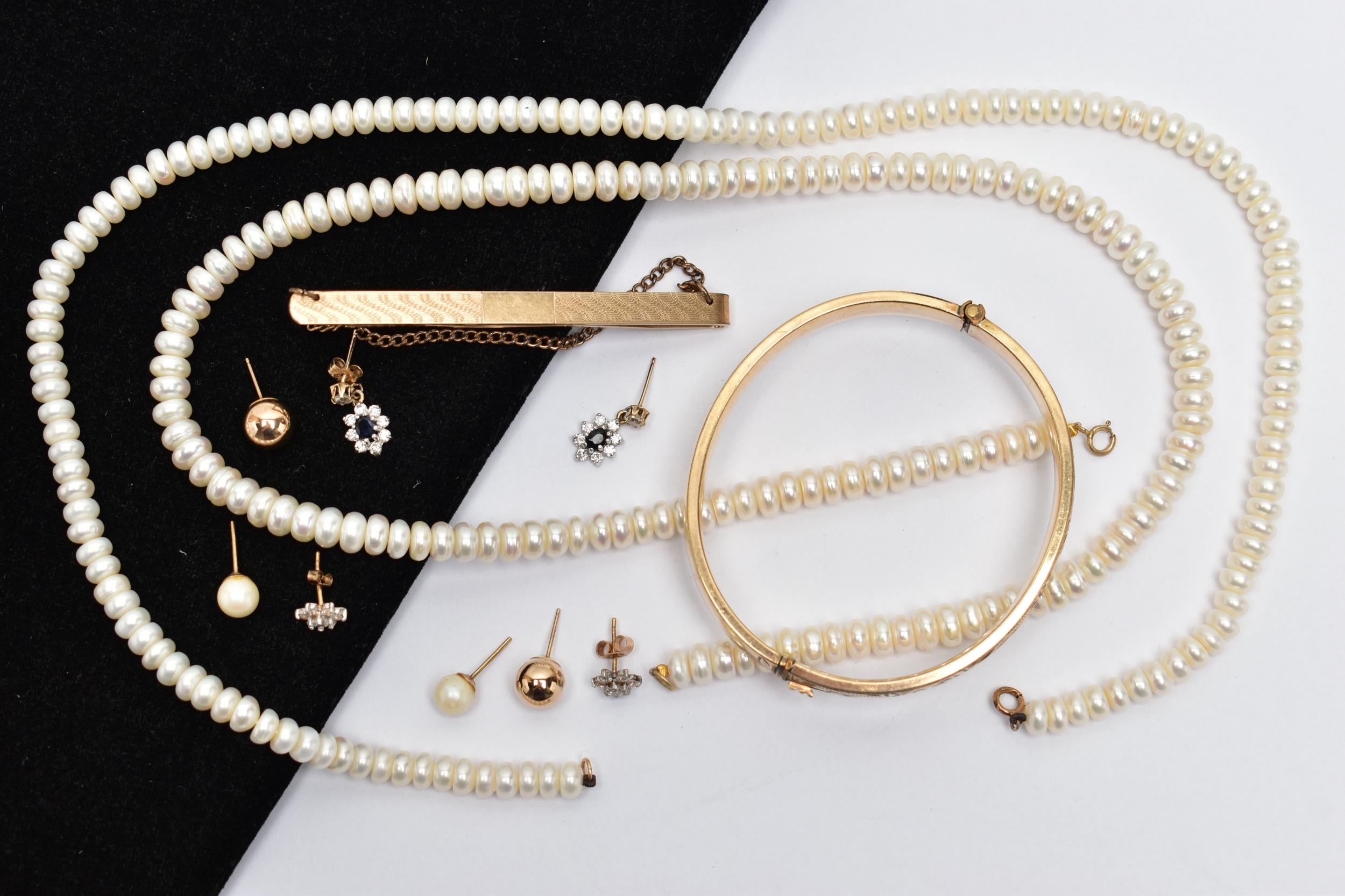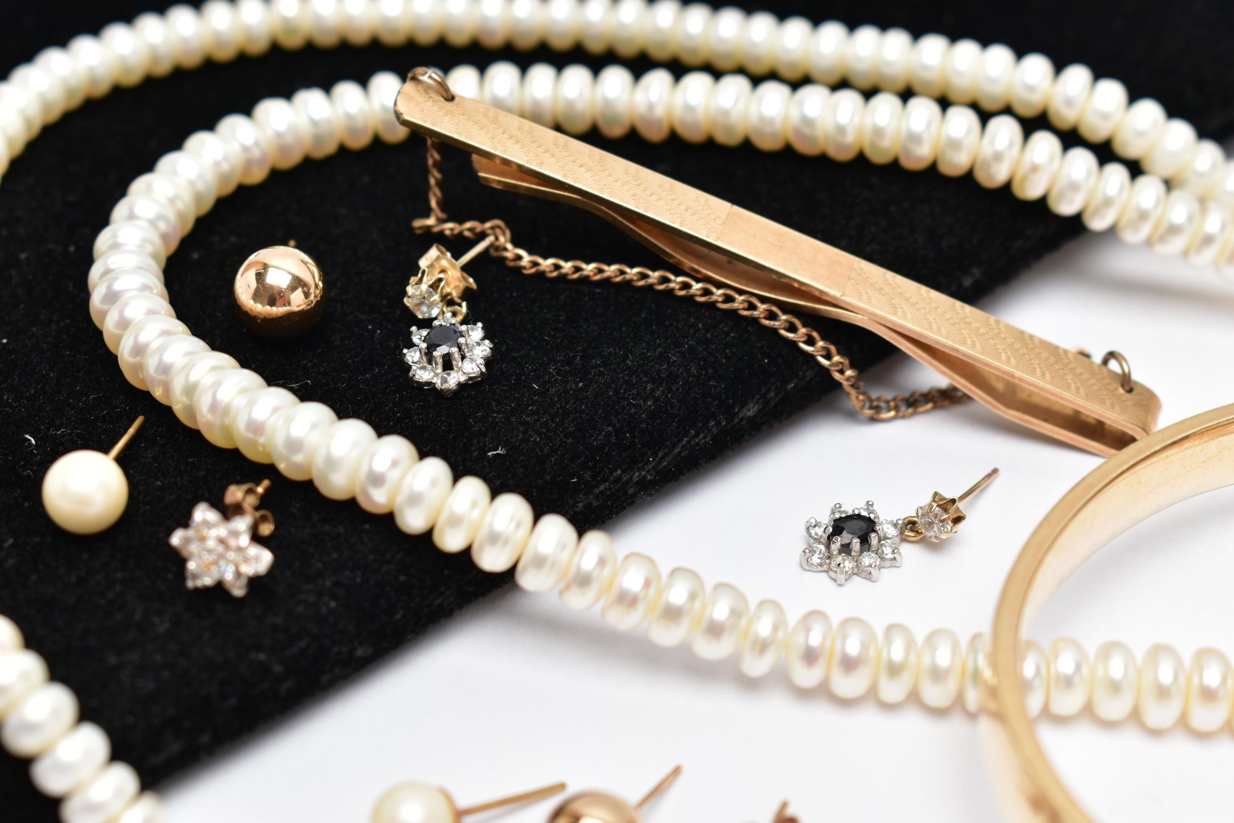 AN ASSORTMENT OF YELLOW METAL JEWELLERY, to include a pair of cubic zirconia and 9ct gold stud earrings, hallmark rubbed, approximate gross weight 1.0 gram, a pair of yellow metal ball studs, stamped 375, a pair of imitation pearl earrings with yellow metal posts, unmarked, a pair of yellow and white metal drop earrings set with cubic zirconia, unmarked, approximate gross weight 3.5 grams, two fresh water cultured pearl necklaces, fitted with yellow metal spring clasps, stamped 375, a yellow metal hinged bangle, stamped 9ct metal core, a yellow metal tie slide, stamped 9ct front and back, (condition report: general moderate wear, some earring backs missing)