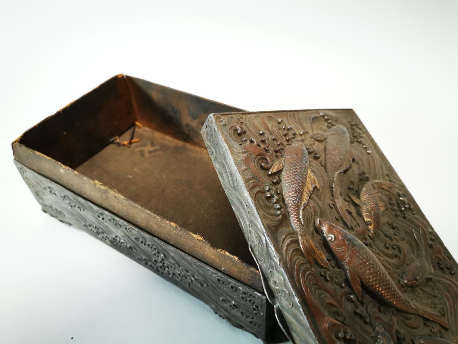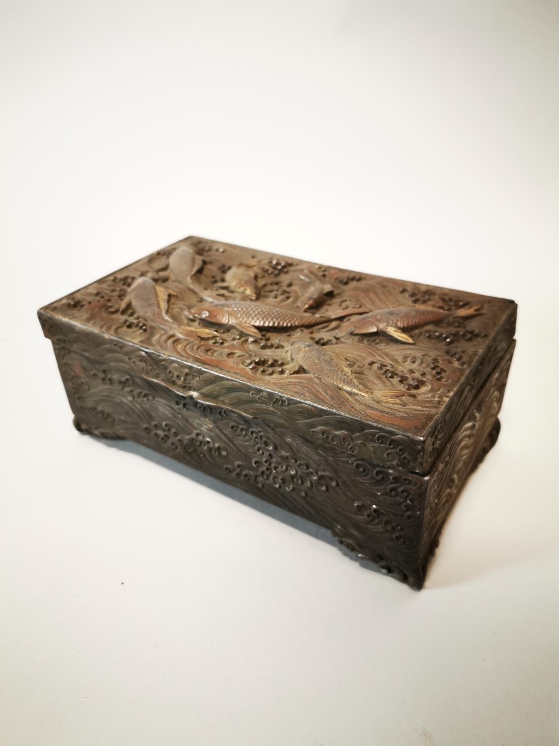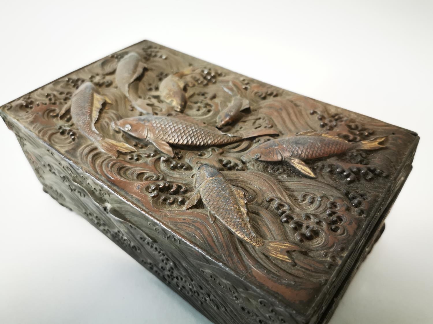 19th C. embossed bronzed spelter box decorated with Koi carp in the Oriental style. {9 cm H x 23 cm L x 14 cm D}.