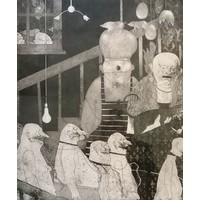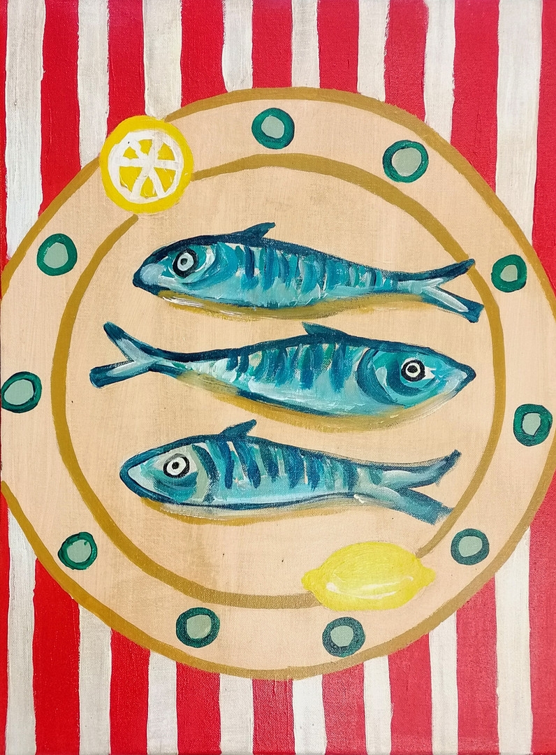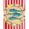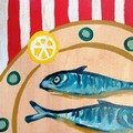 Terence Robert Wood oil painting of 3 mackerel on a plate with red & white stripe - 60cm x 45cm.