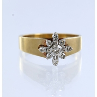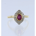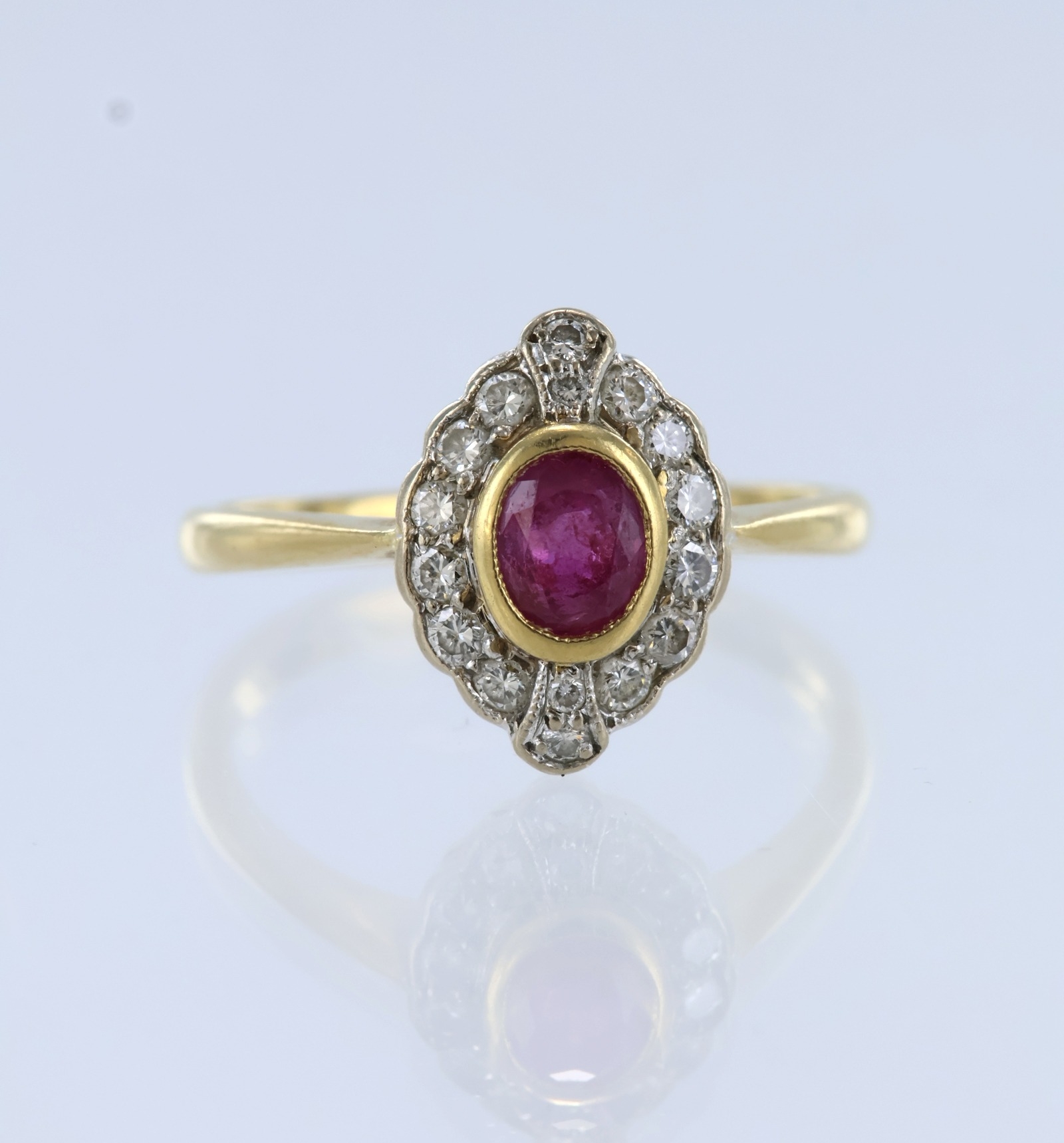 18ct yellow gold ruby and diamond cluster ring, centre oval 6mm x 4mm ruby, sixteen round brilliant cut diamonds, total diamond weight approx. 0.20ct, finger size S, weight 4.5g