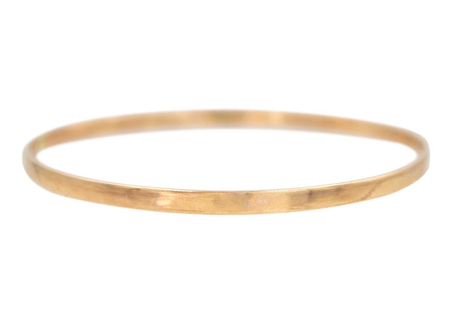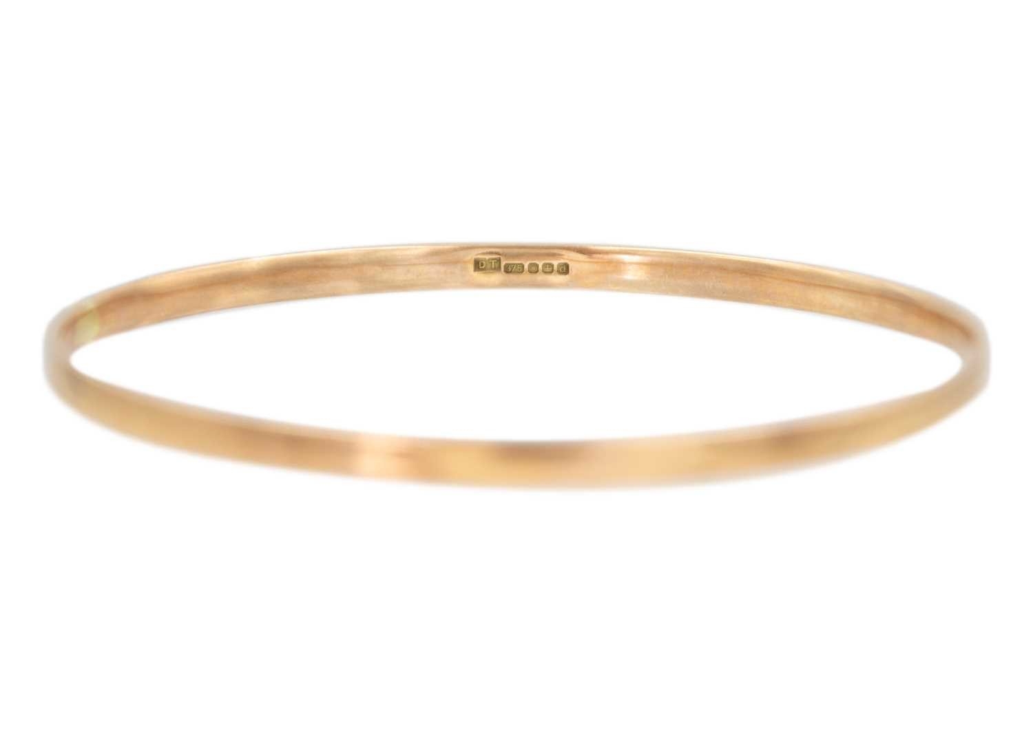 A 9k rose gold bangle bracelet. Sheffield hallmark, diameter 7cm, weight 13.13g.