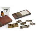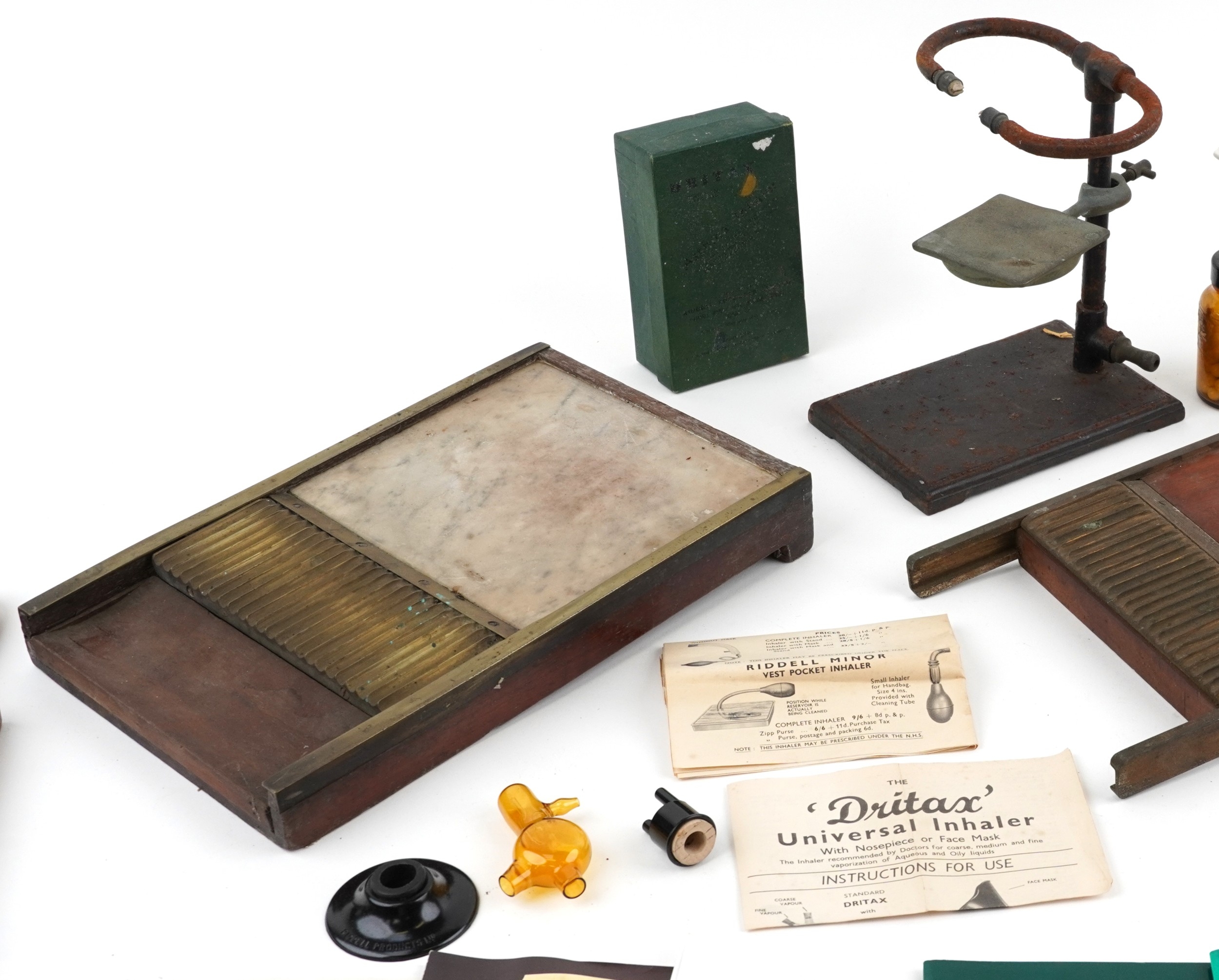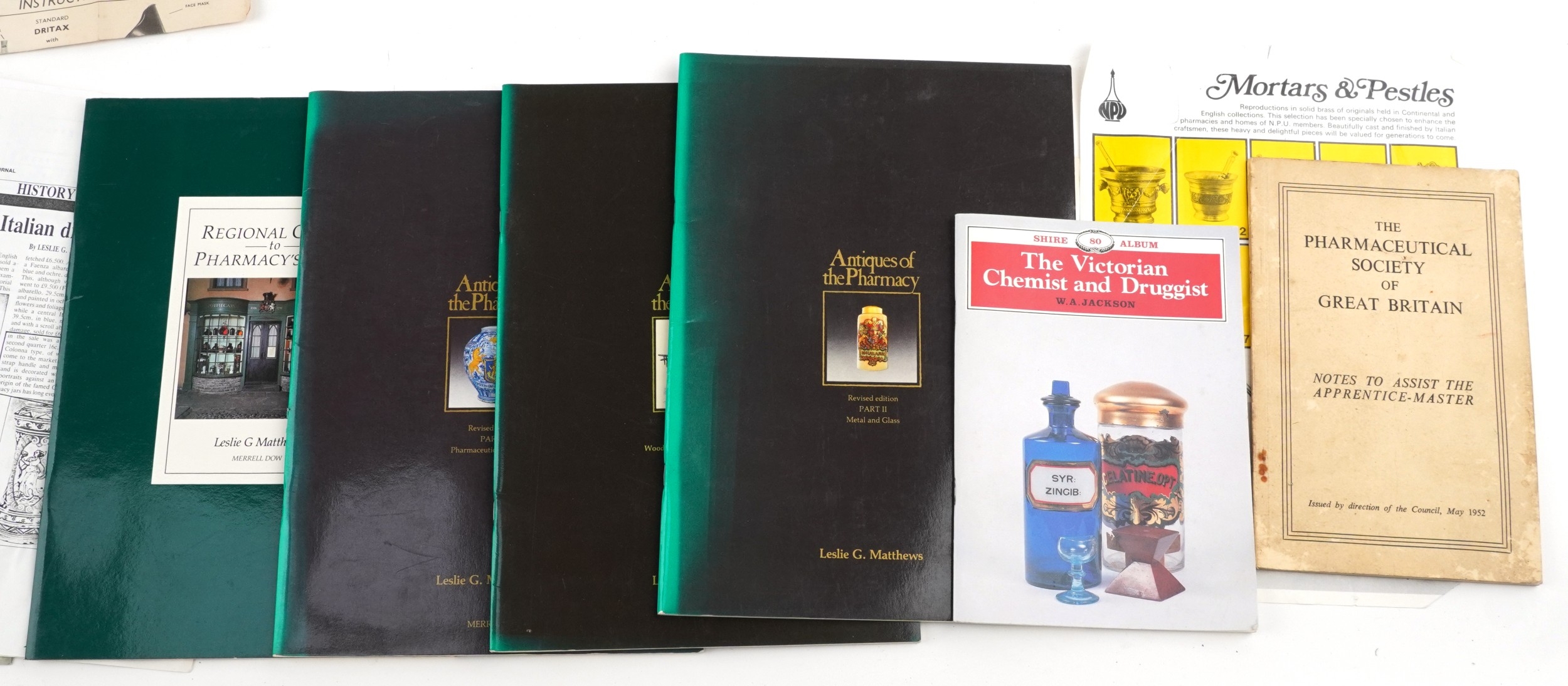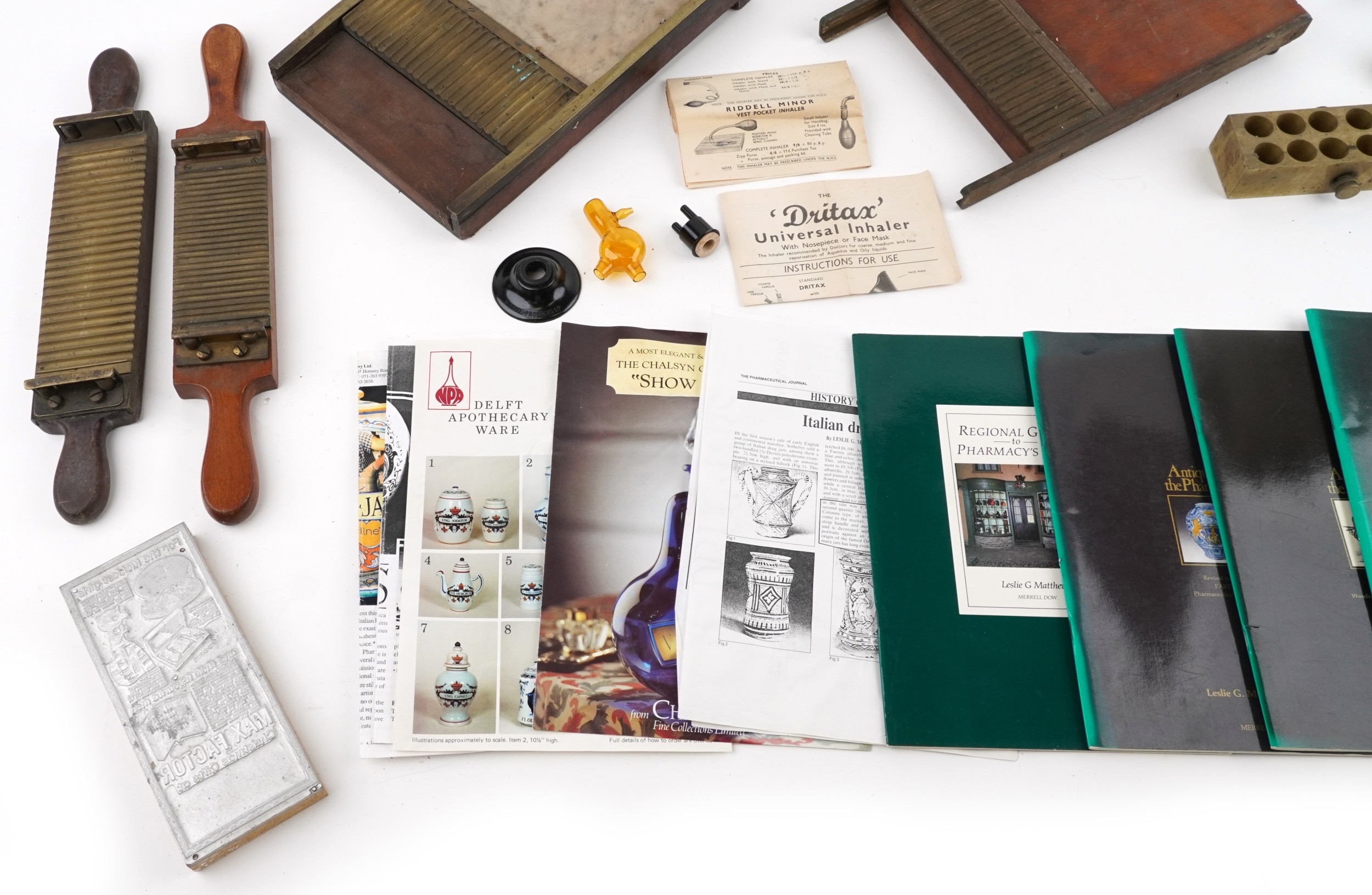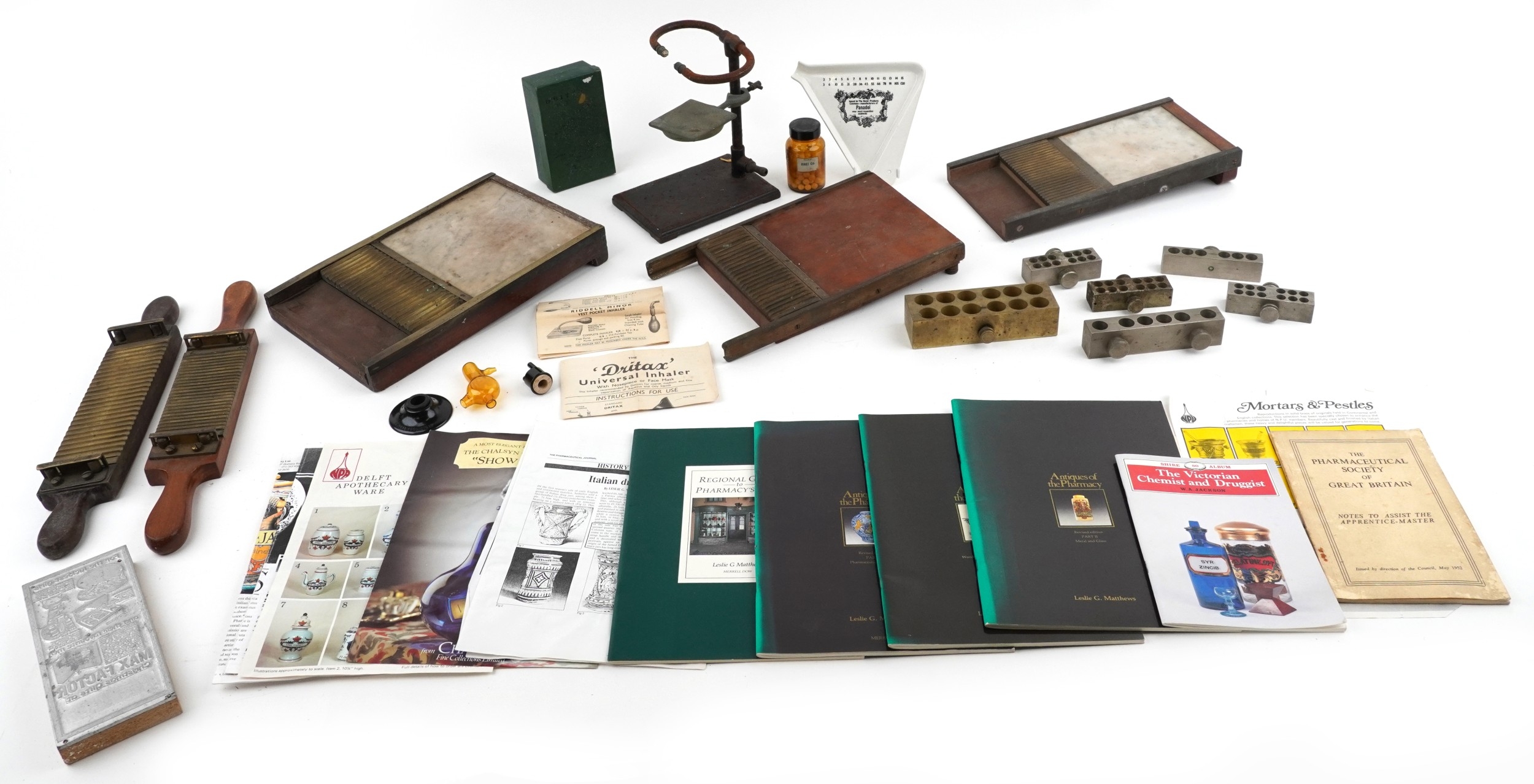 A collection of late 19th century and later apothecary/pharmaceutical items including pill rolling equipment, moulds and a stand together with Antiques of the Pharmacy parts 1, 2 and 3 by Leslie G Matthews, the largest 45cm wide.