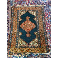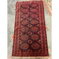 A Bokhara rug, red field with twenty four medallions, within blue, white and red border, fringed - 36in. x 68in.