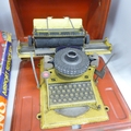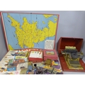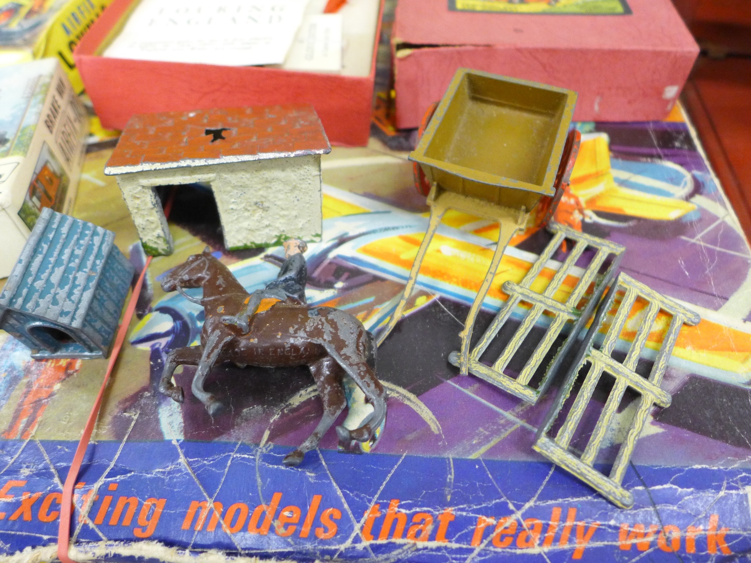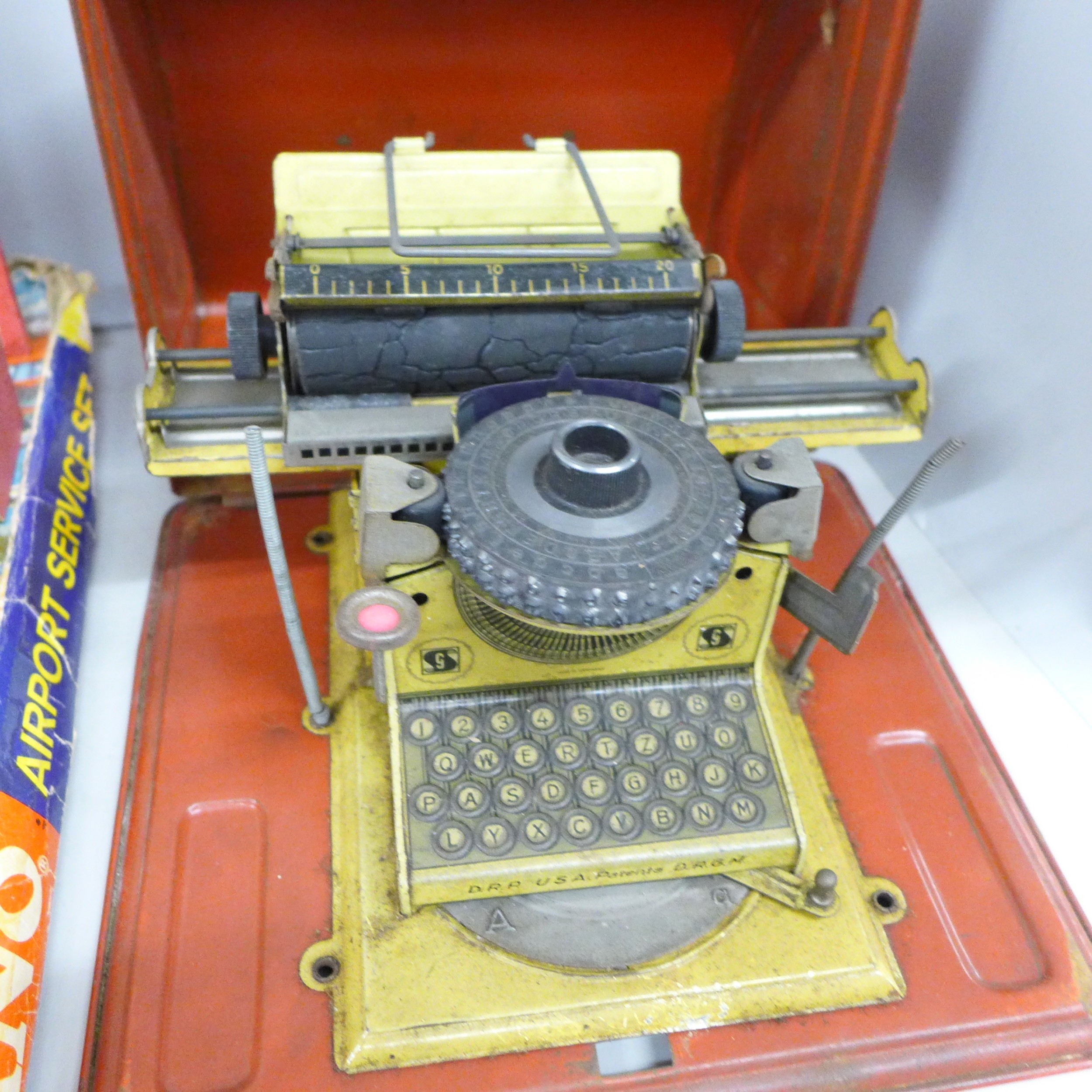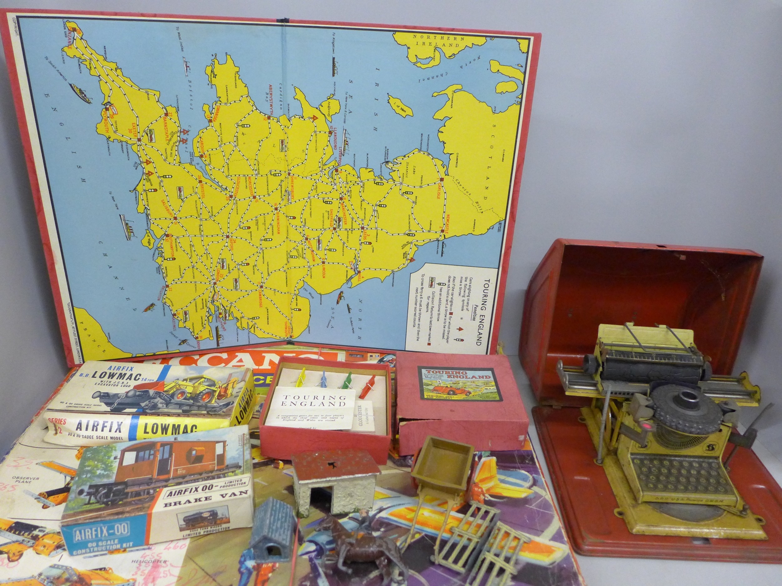 A Meccano Airport service set, two Airfix models, Brake Van and Lowmac, a vintage Touring England boardgame, a German tin-plate toy typewriter, a Britains figure, farmyard building, French, etc.