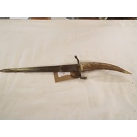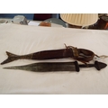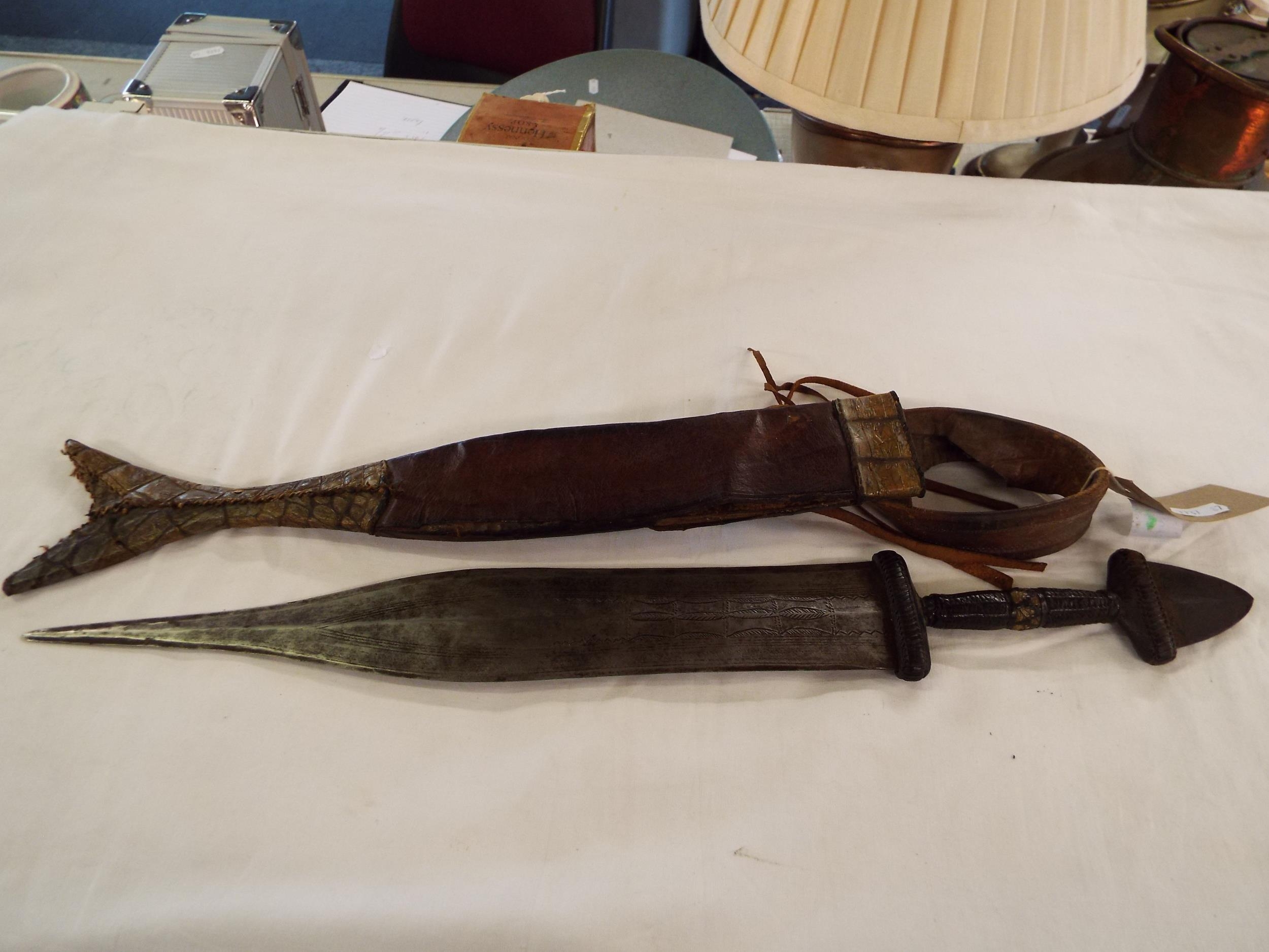 An early 20thC African (Cameroon) knife having engraved blade, leather hilt guard and grip in a leather and crocodile skin fish tail scabbard