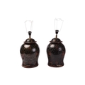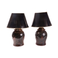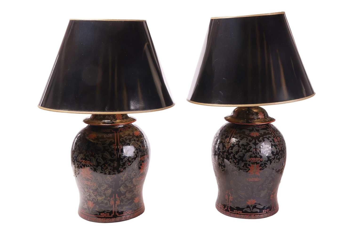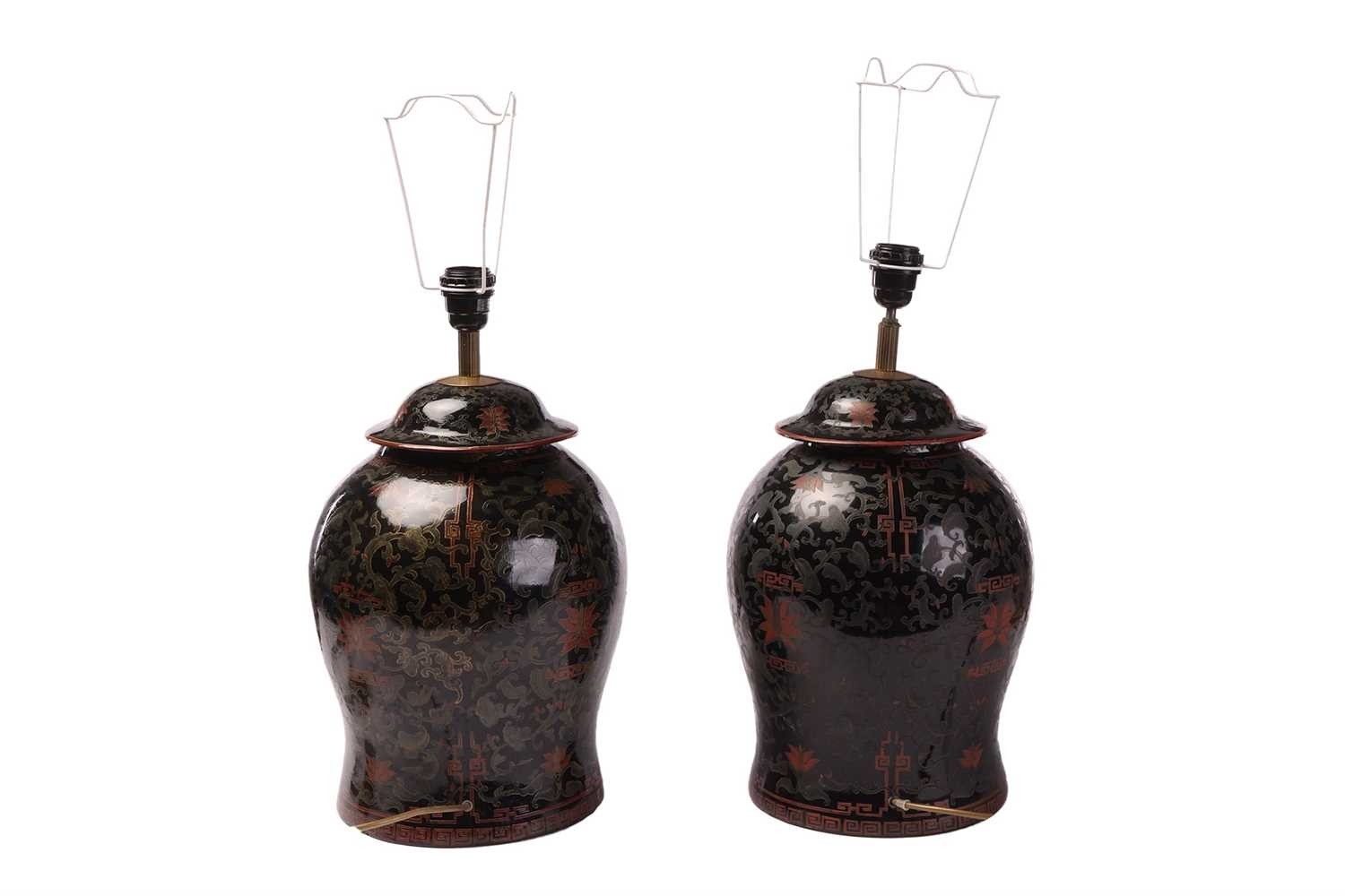 A pair of contemporary Chinese-style lacquered table lamps, of urn form with floral decoration, 50 cm to top of lampholder. Qty: (2)
