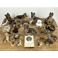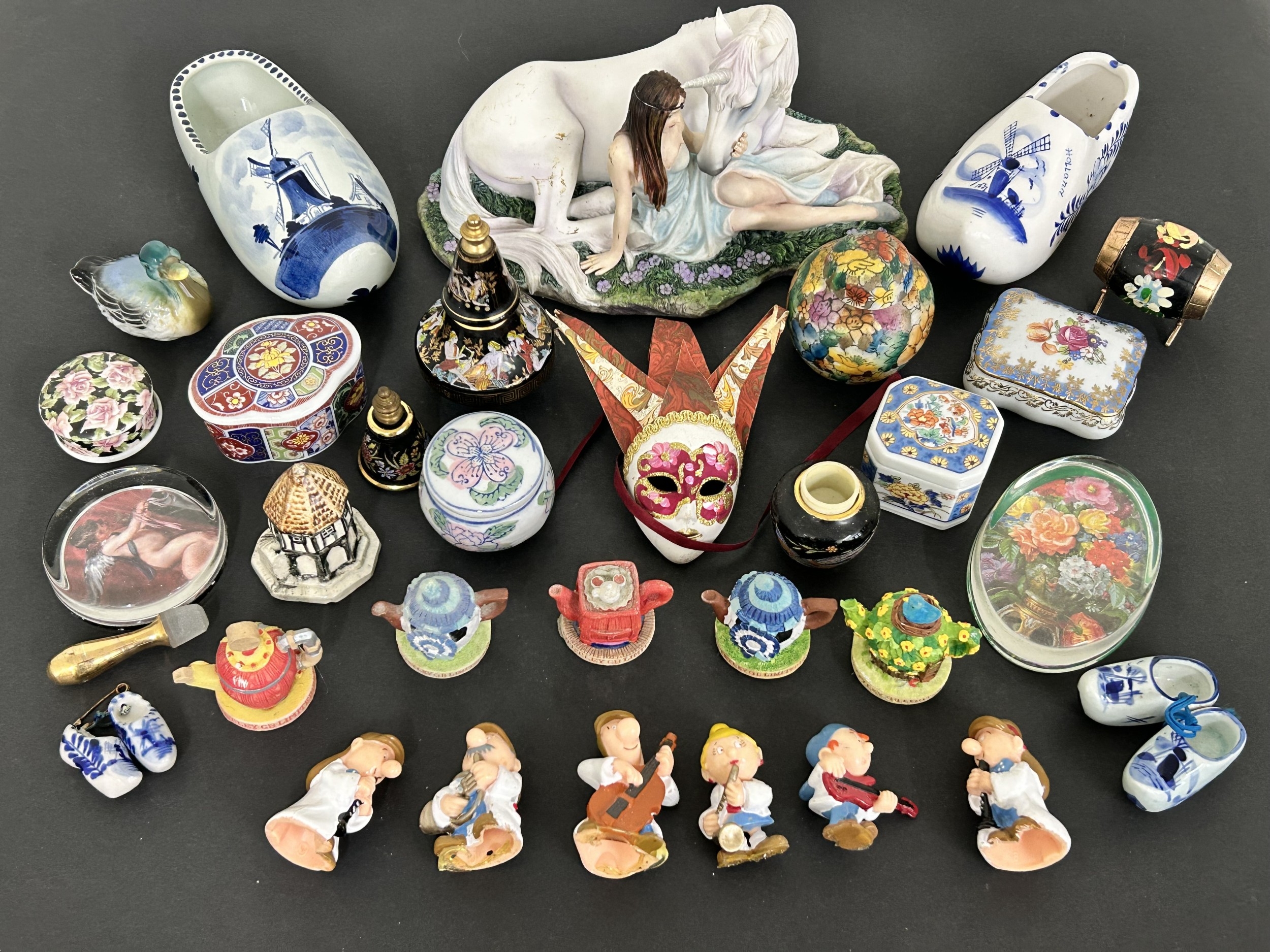 A figurine of a girl with a unicorn, small decorative boxes, miniature shoes, Tetley Tea miniature teapots and Tetley Tea plastic figures plus other trinkets