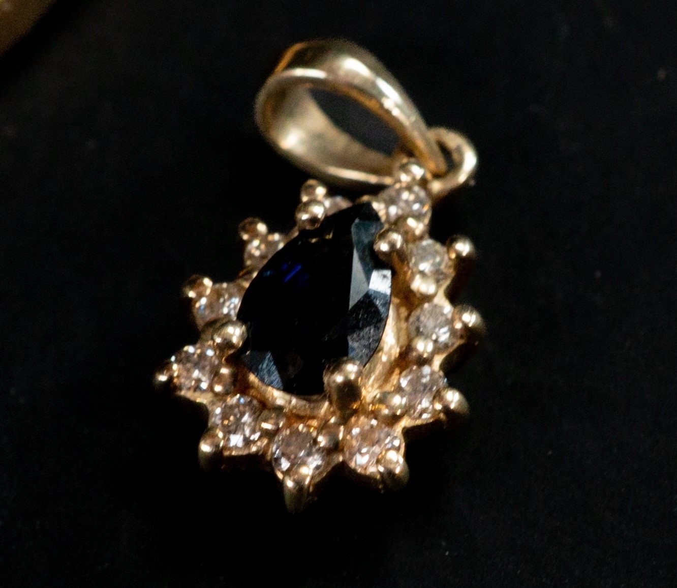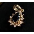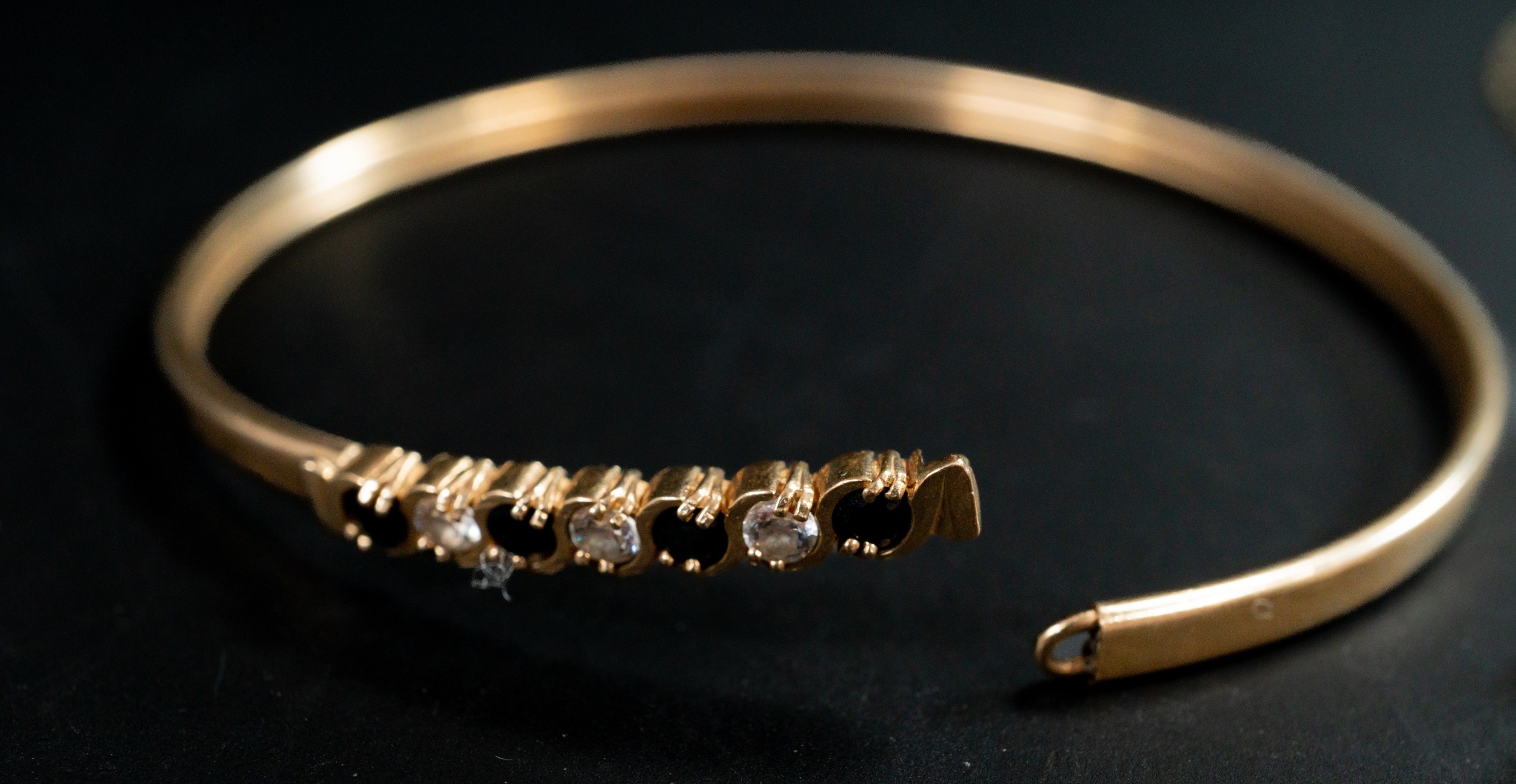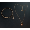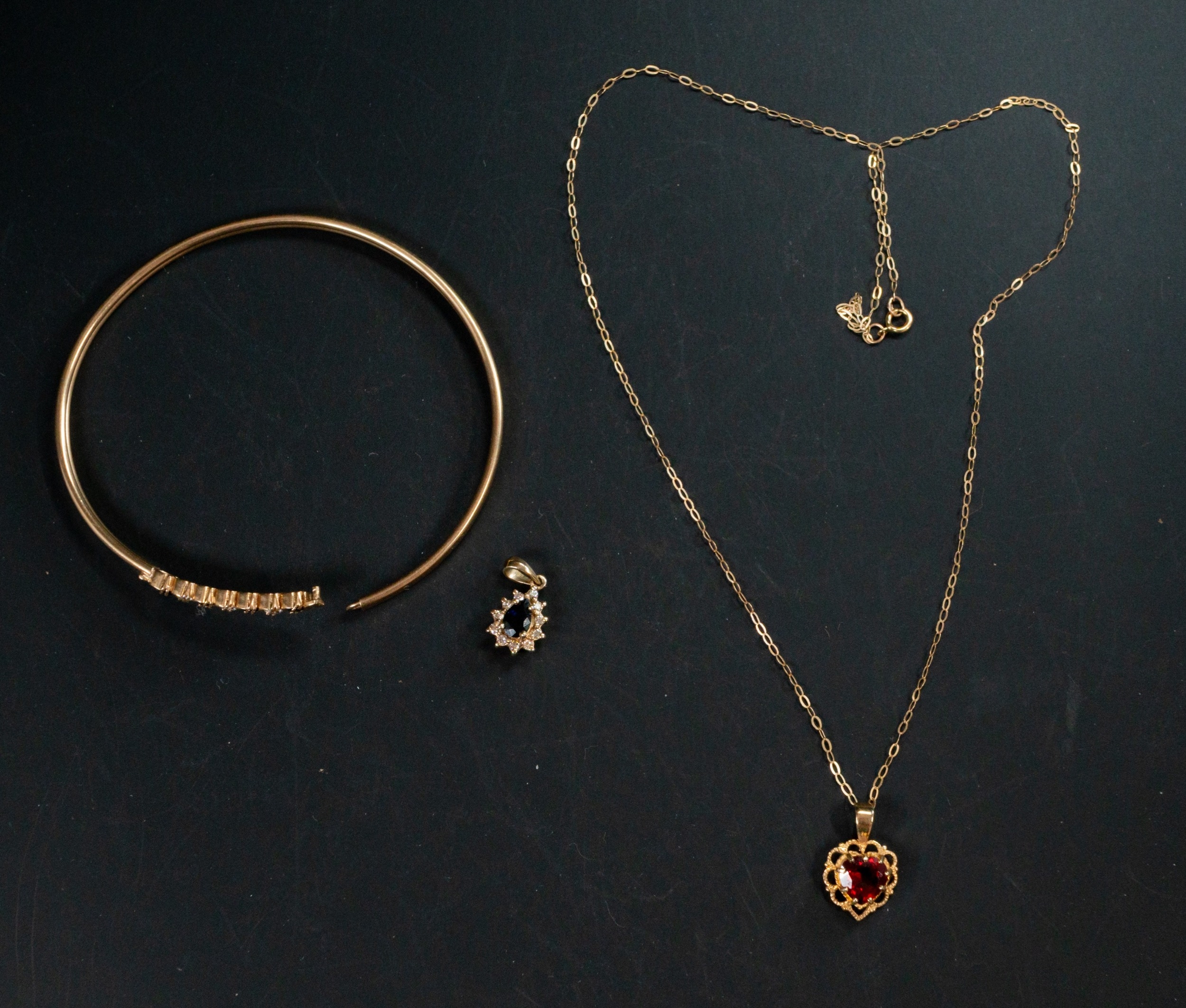 Jewellery: a 9ct gold bangle, set with four sapphires and three diamonds, a 9ct gold necklace and a sapphire set pendant, gross weight 8.7g.