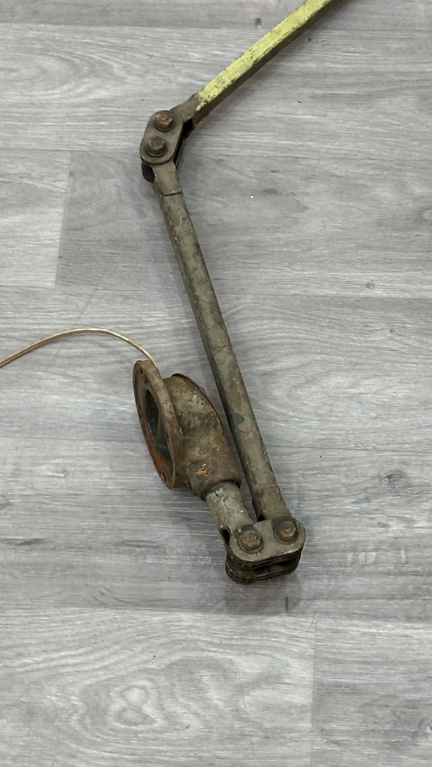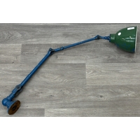 A mid 20th century Mek-Elek green and grey painted metal articulated industrial machinist's desk lamp
