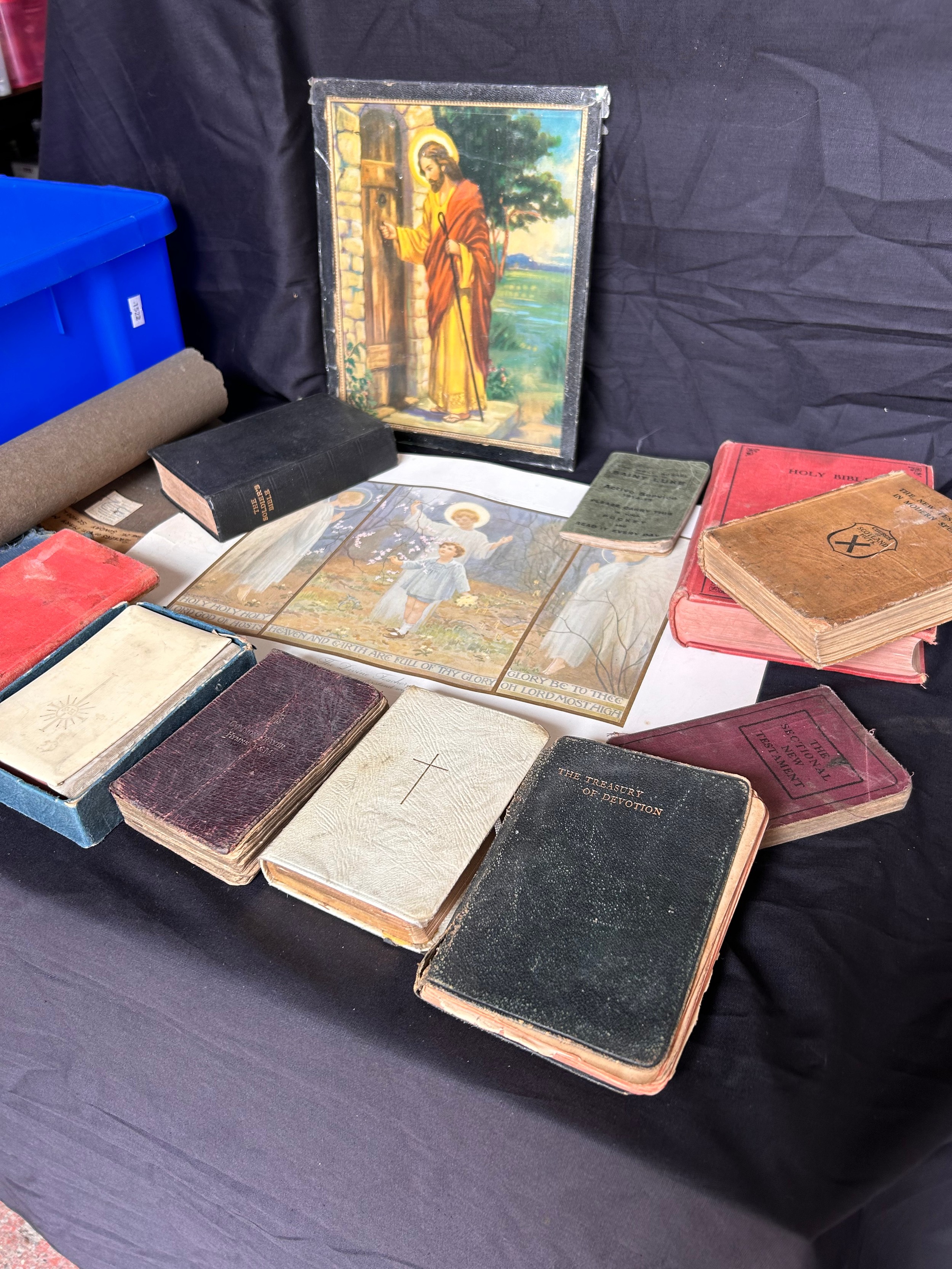 Box Containing Vintage Bibles And Various Religous Ephemora.