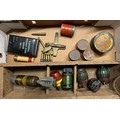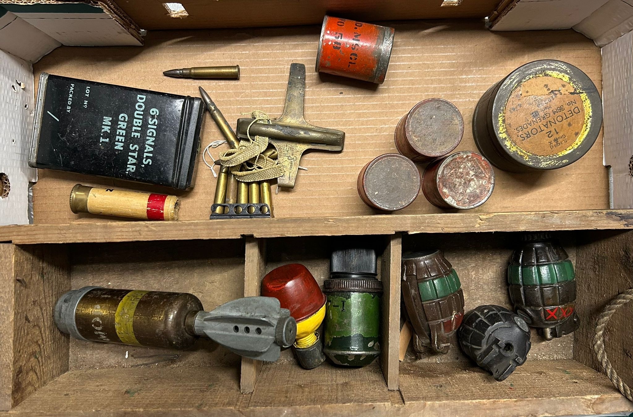 A quantity of inert WWII ordnance including No. 36 Mk.1 hand grenade; another similar, the base plug missing; a similar practice grenade, incomplete; a practice 2" High Explosive mortar bomb; a No.77 grenade; another small grenade; a tin for 12 No36 grenade detonators; four smaller tins four for 3 No.36 grenade detonators, and a tin for 6 signal cartridges, mostly contained in a wooden box for 12 No.36 hand grenades (no lid). Mostly GC.