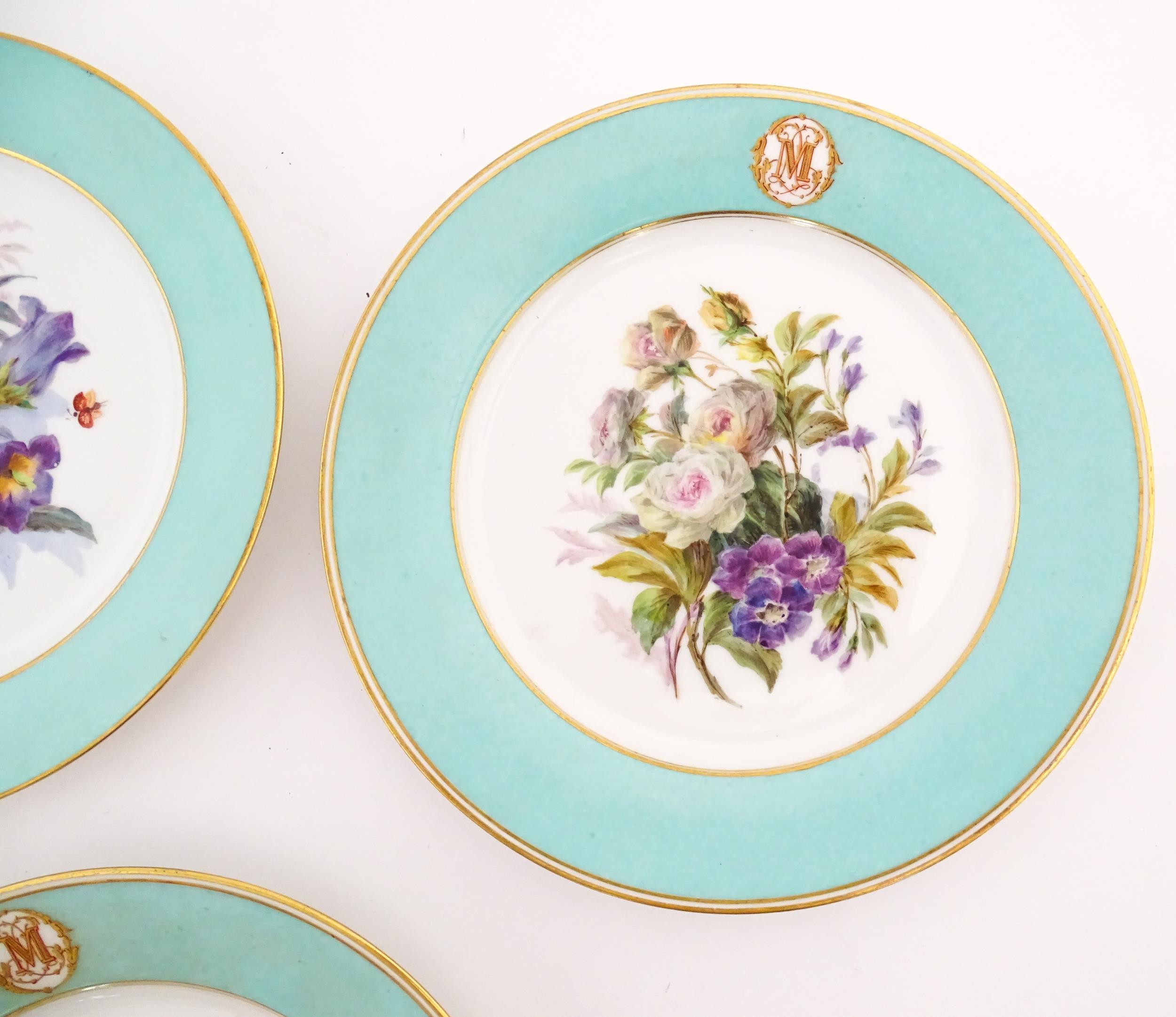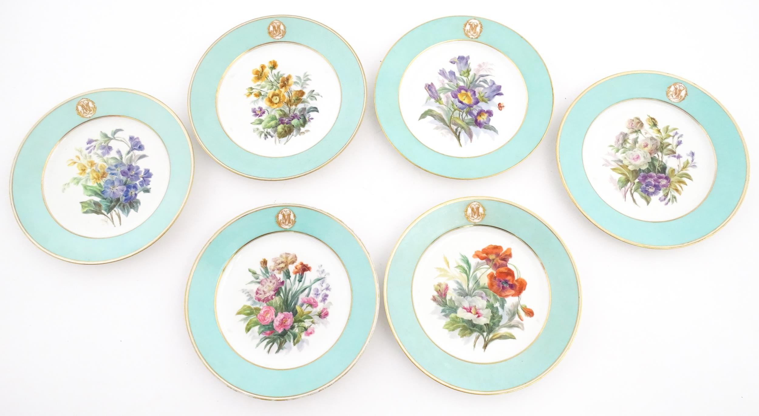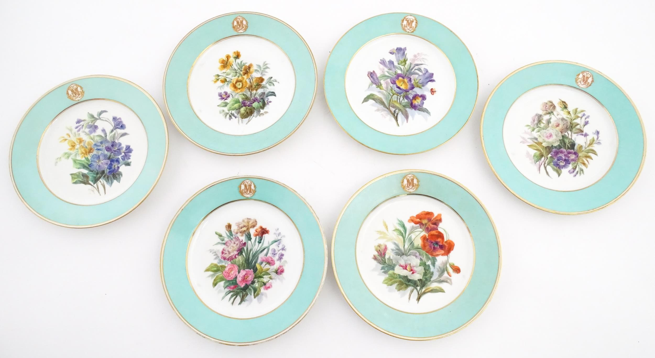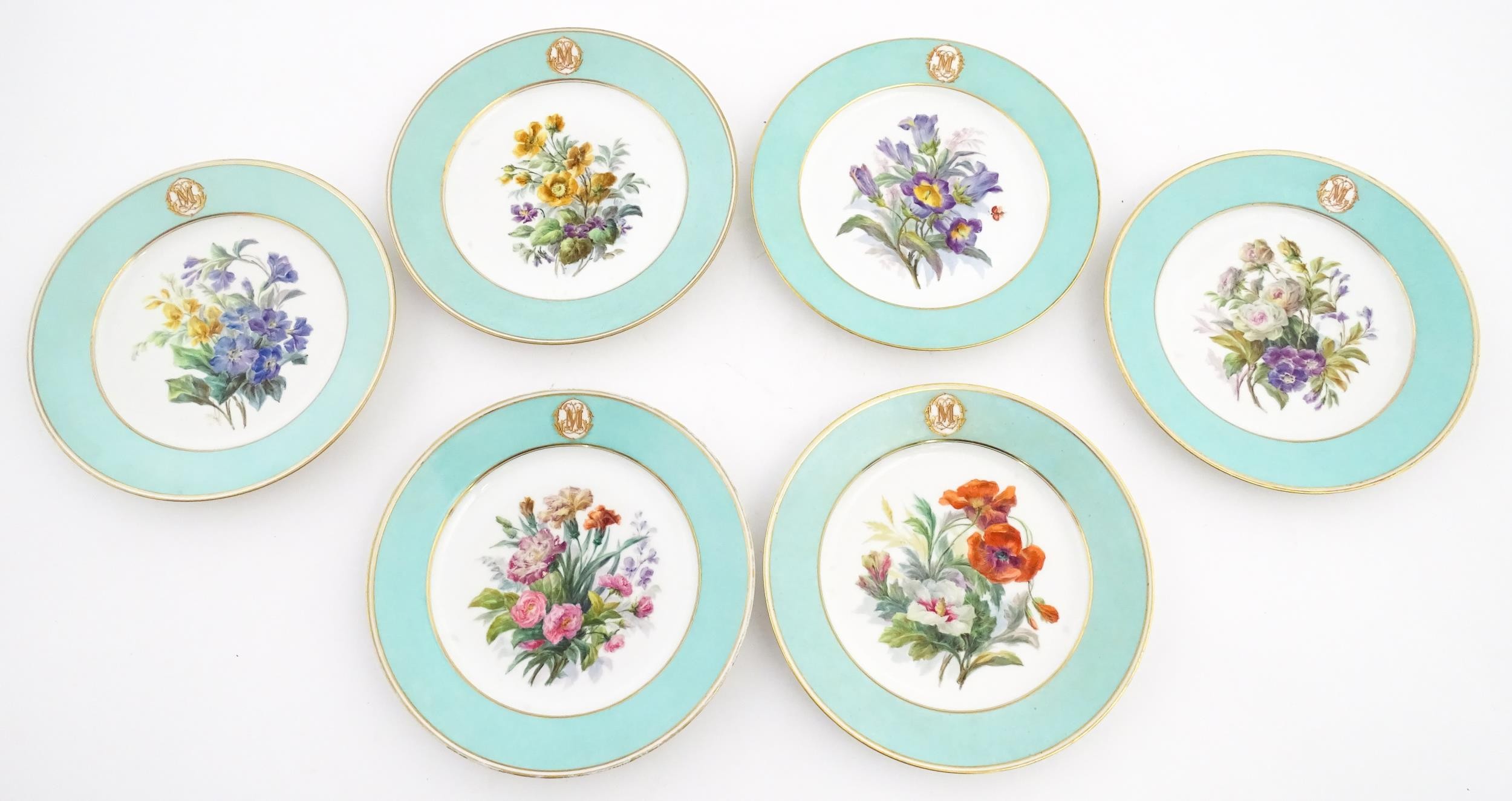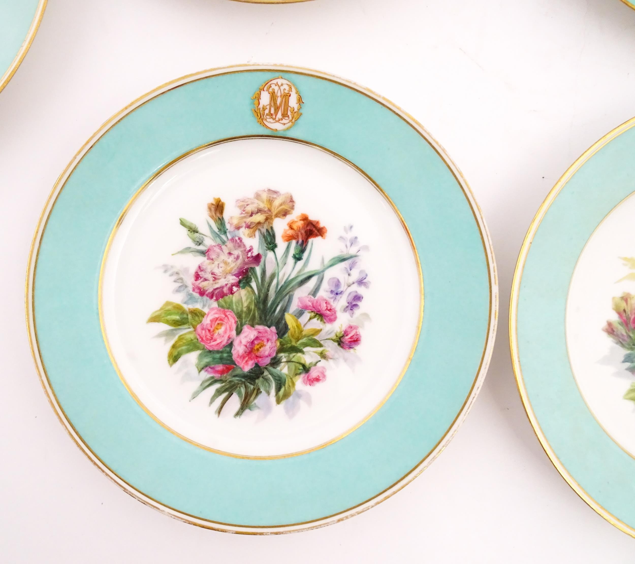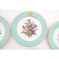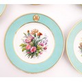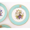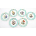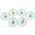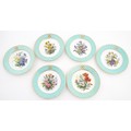 Six hand painted desert plates, each decorated with flowers and foliage, with turquoise and gilt borders. Approx. 9" diameter (6)