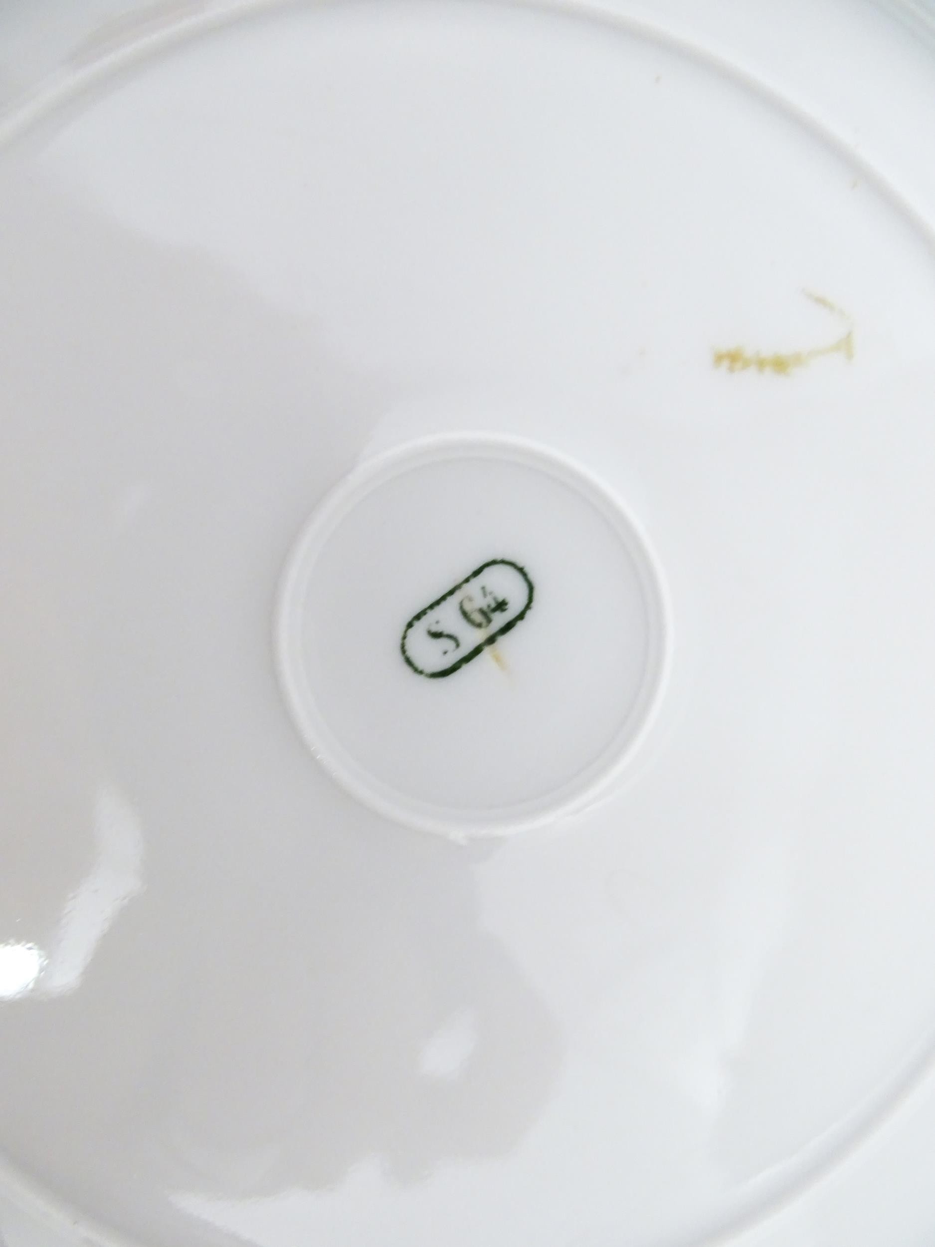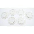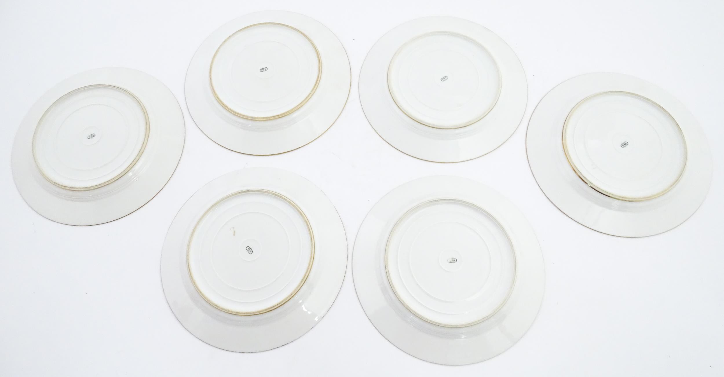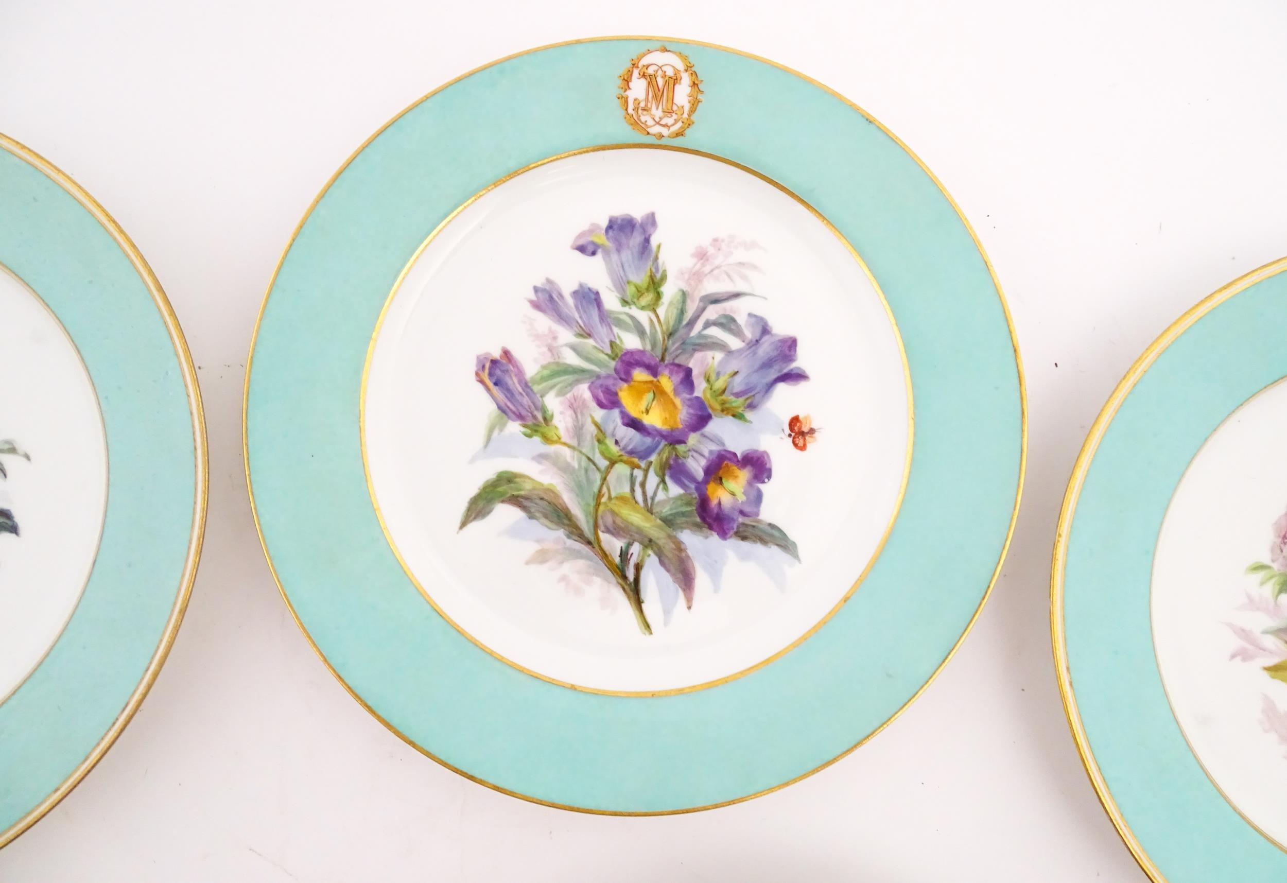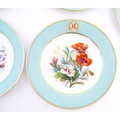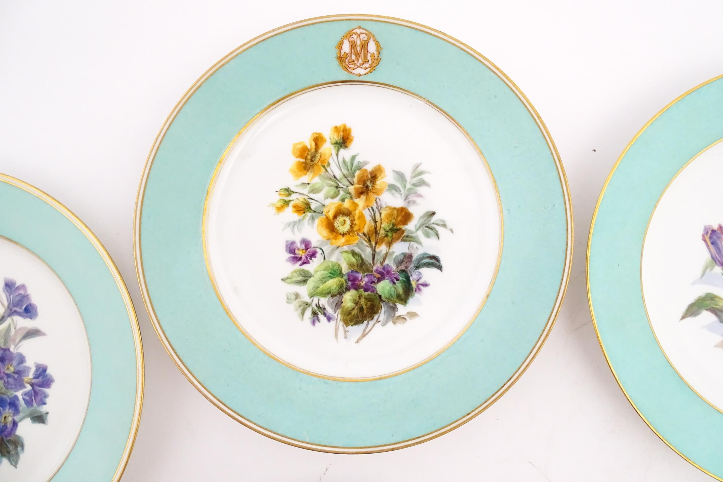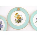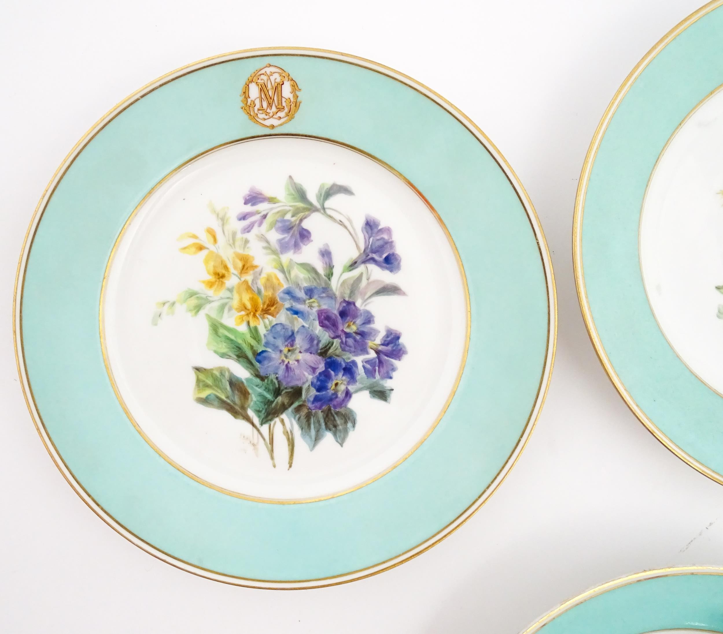 Six hand painted desert plates, each decorated with flowers and foliage, with turquoise and gilt borders. Approx. 9" diameter (6)