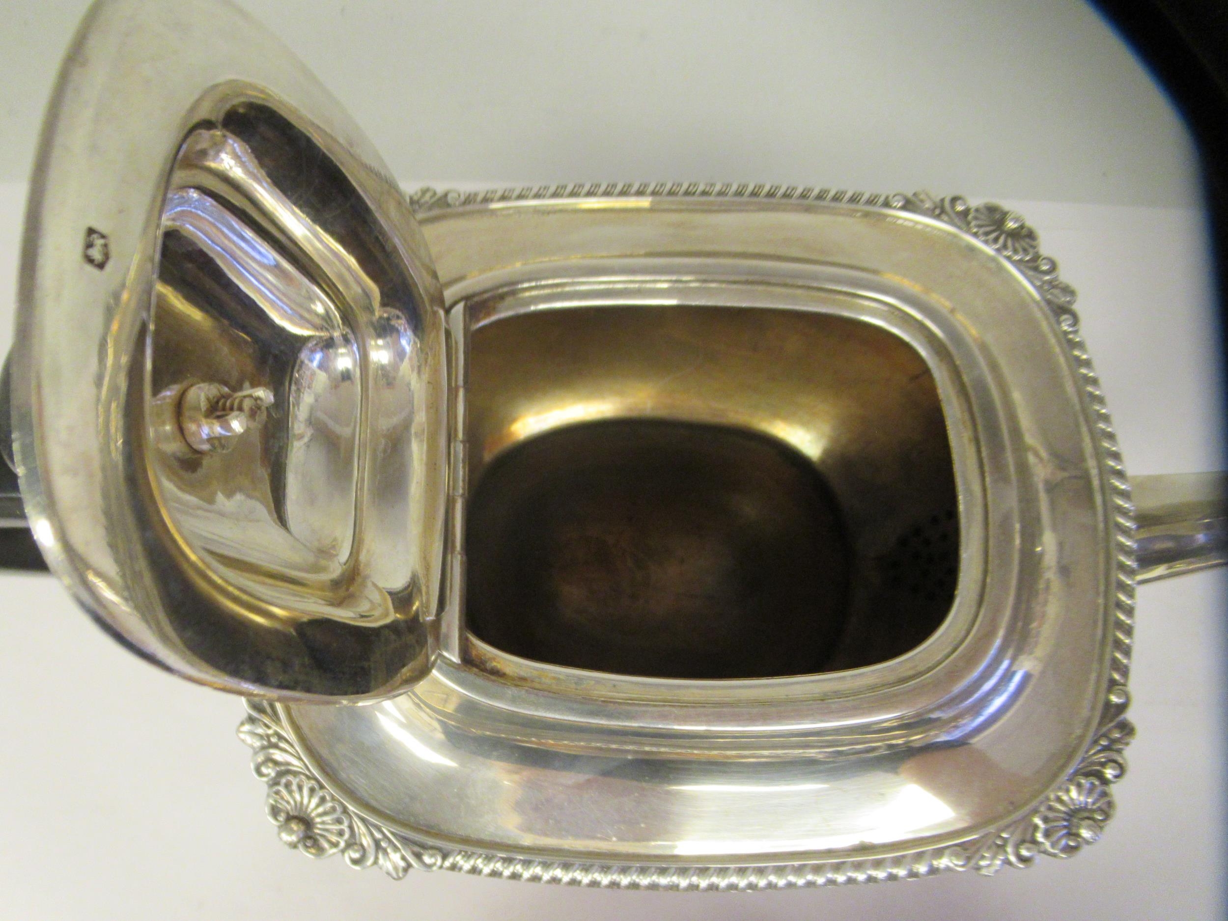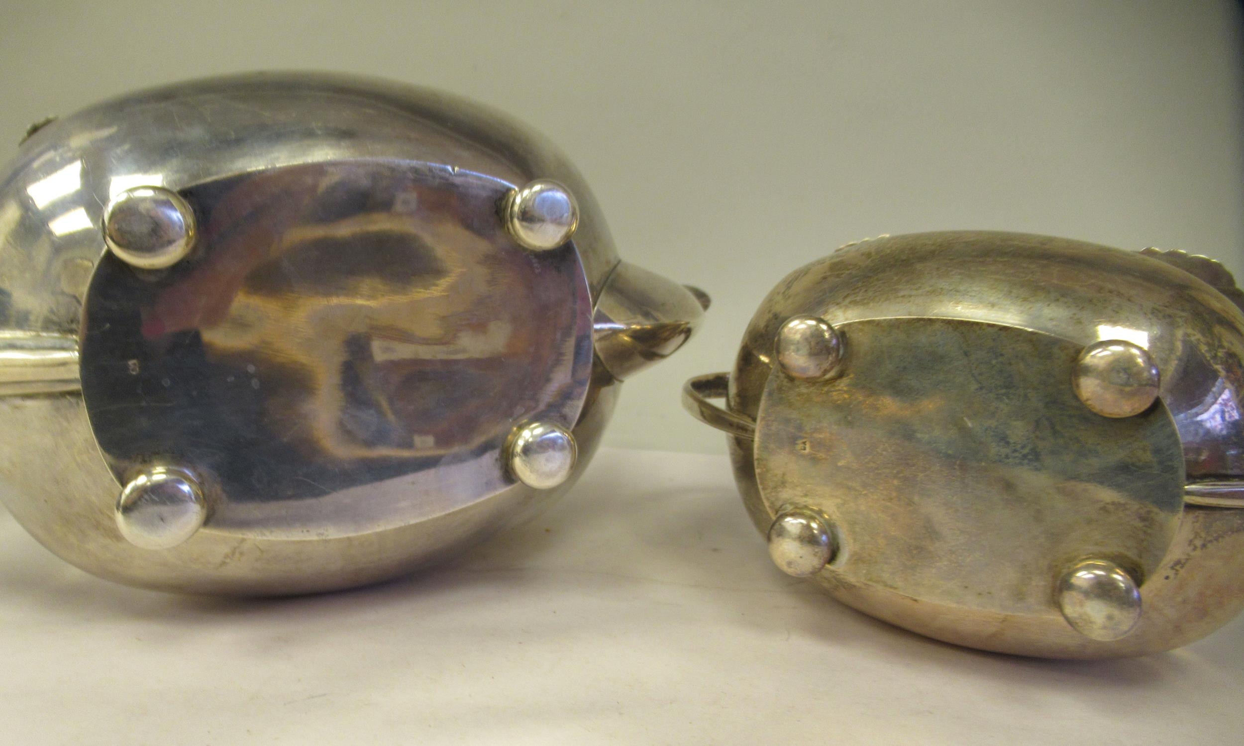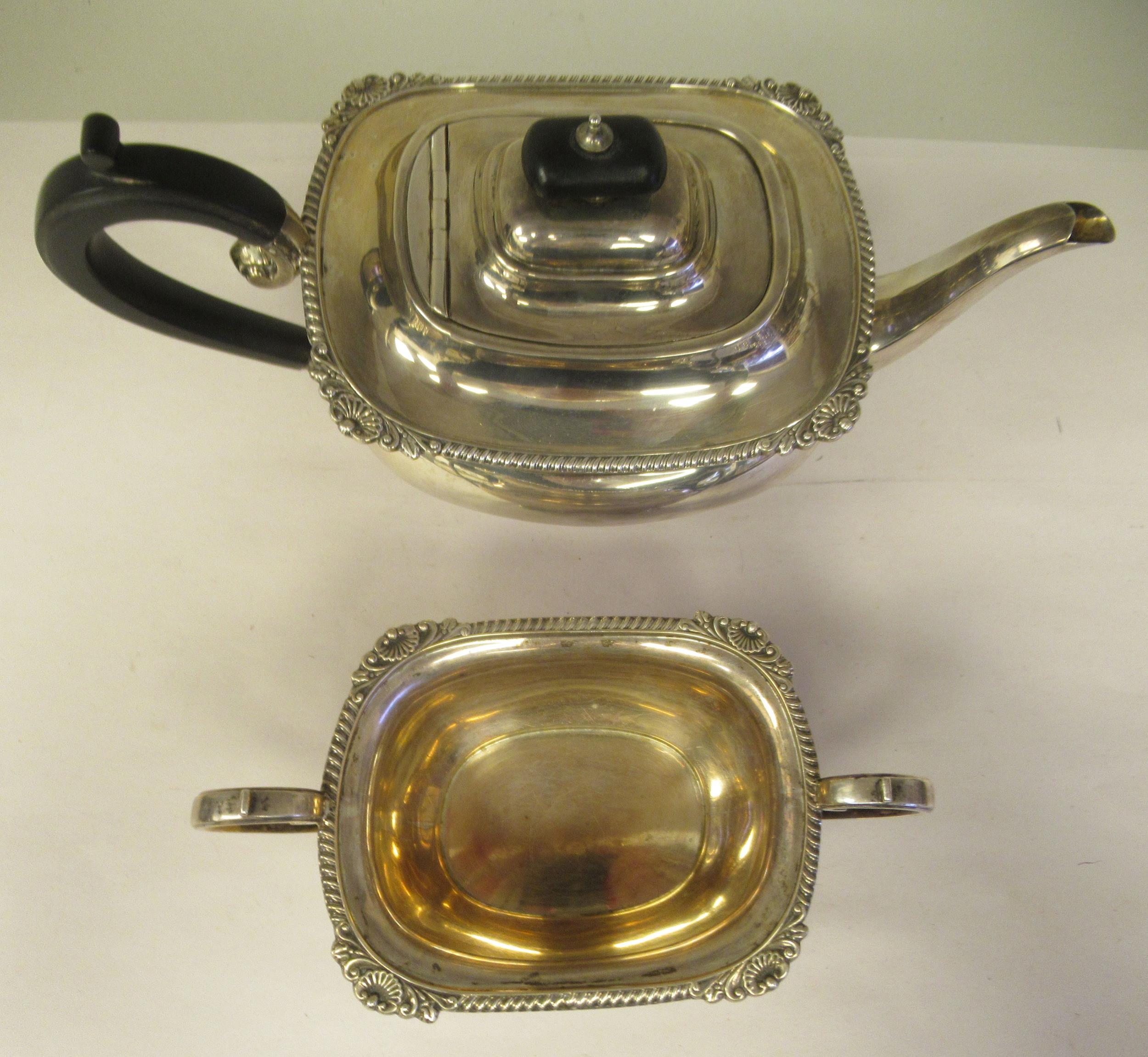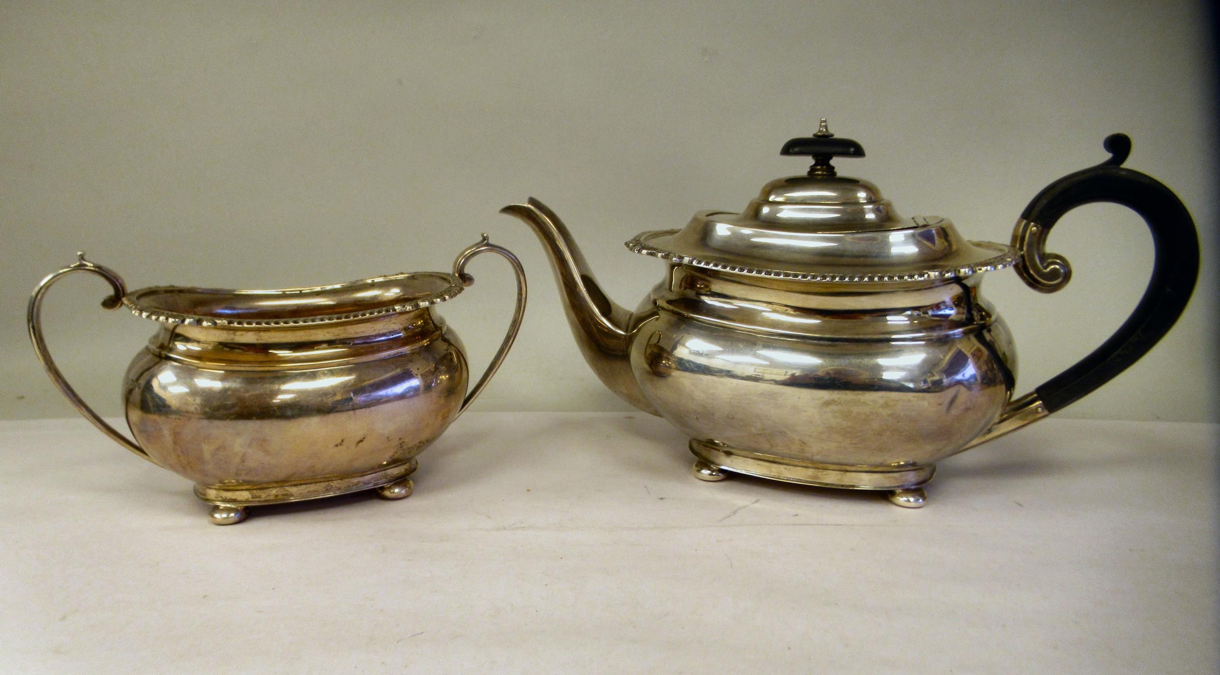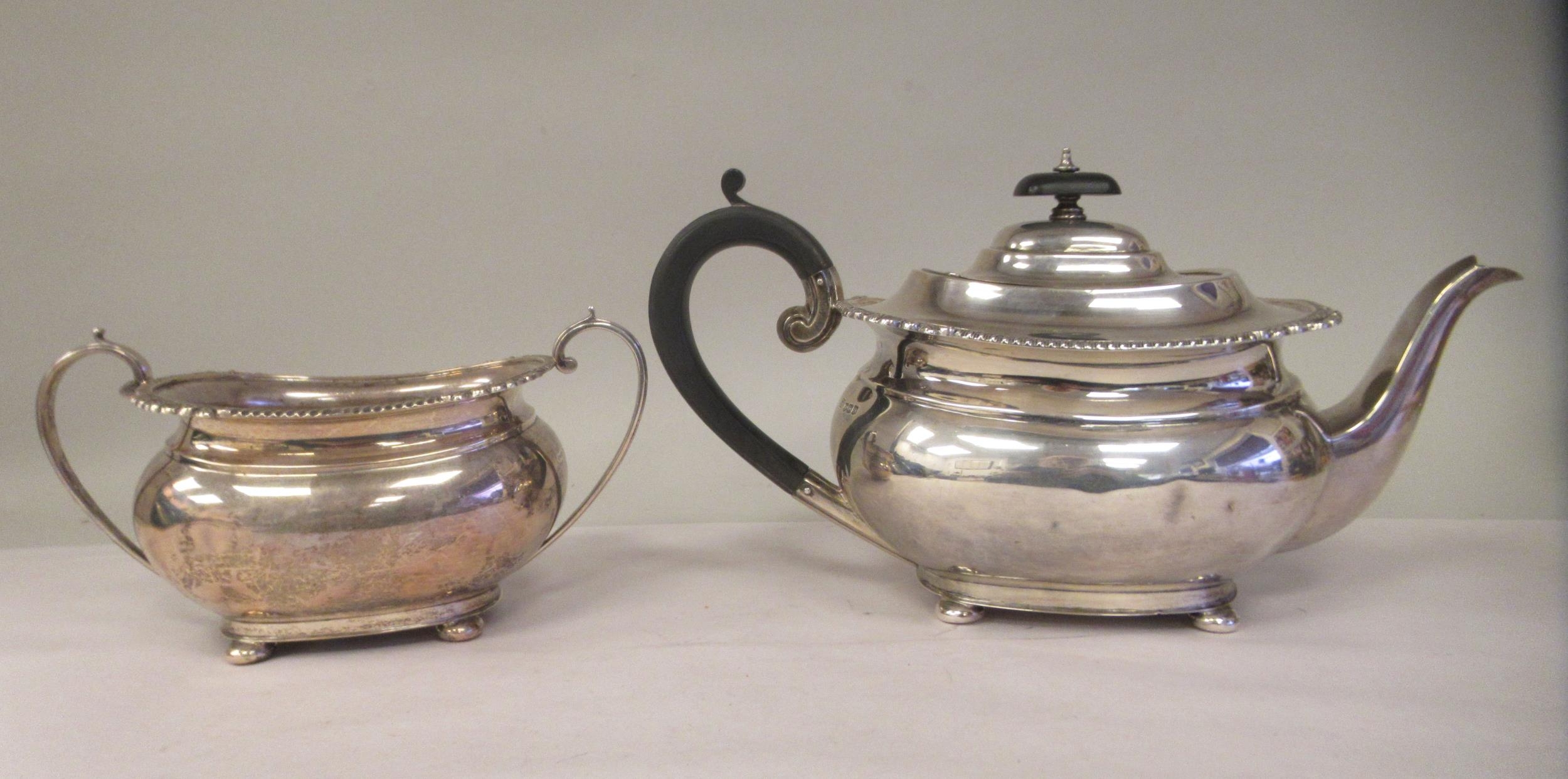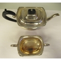 A silver teapot of oval, bulbous form with dragooned and shell cast decoration, a swept spout, insulated C-scrolled handle and knop on the hinged lid and a matching twin handled sugar basin GH Sheffield 1932 (approx. combined gross weight 29.5ozs)