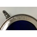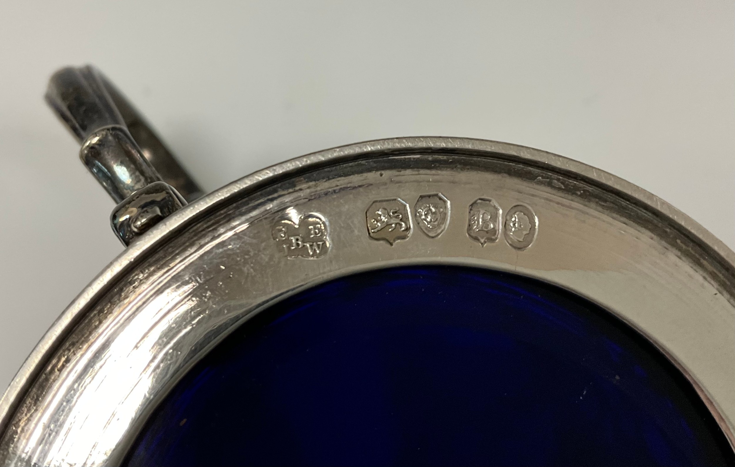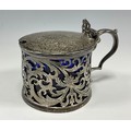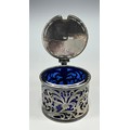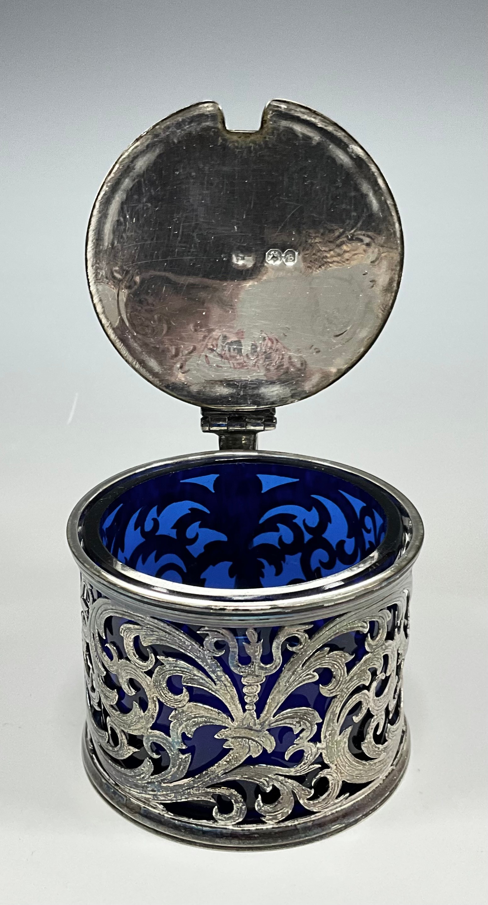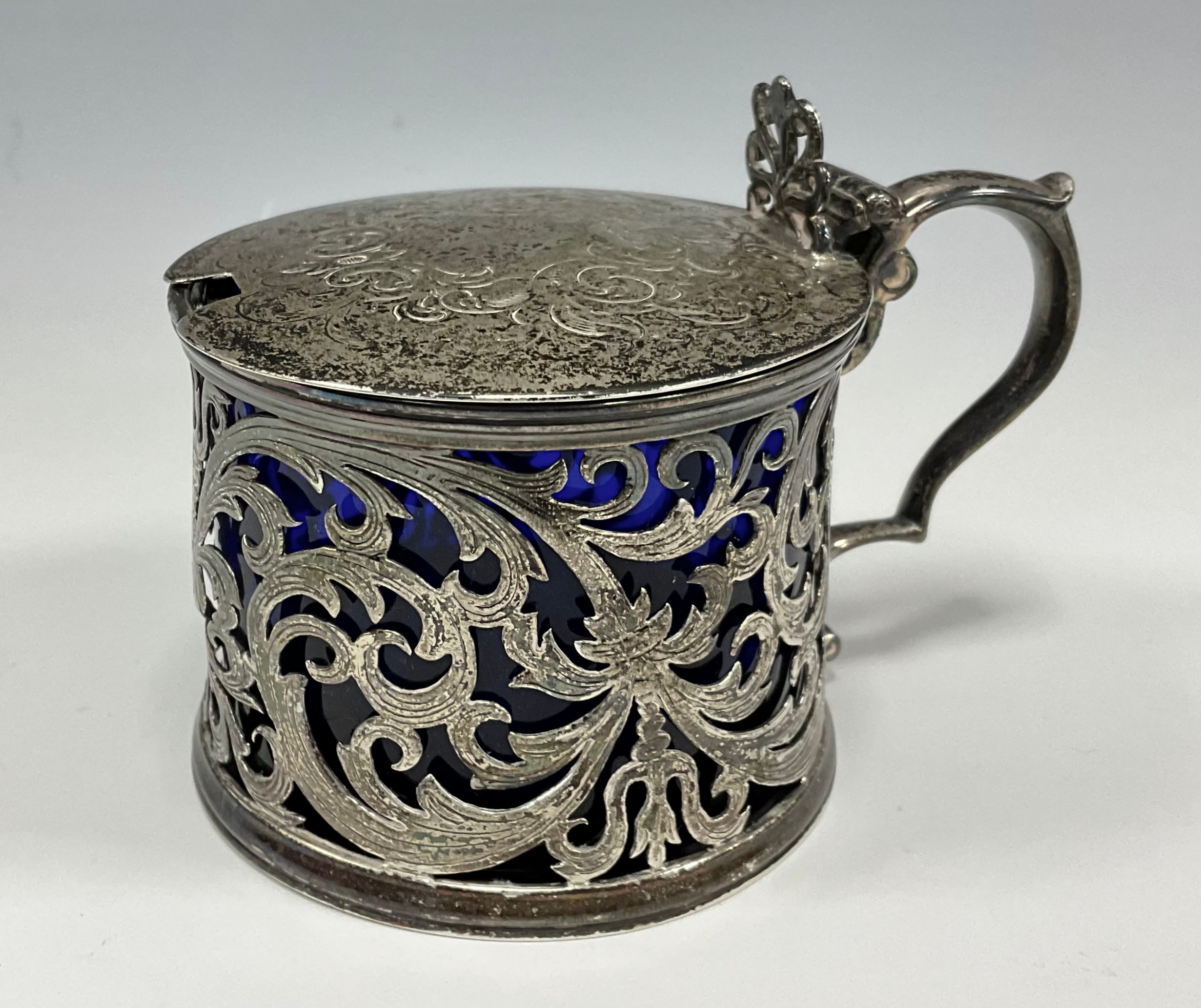 A George IV silver mustard pot, circular form with chased cover, raised thumb piece, pierced scrolling foliate sides, blue glass liner, 6.8cm high, 10.2cm wide including handle, Edward, Edward junior, John & William Barnard, London 1837, 124g silver weight