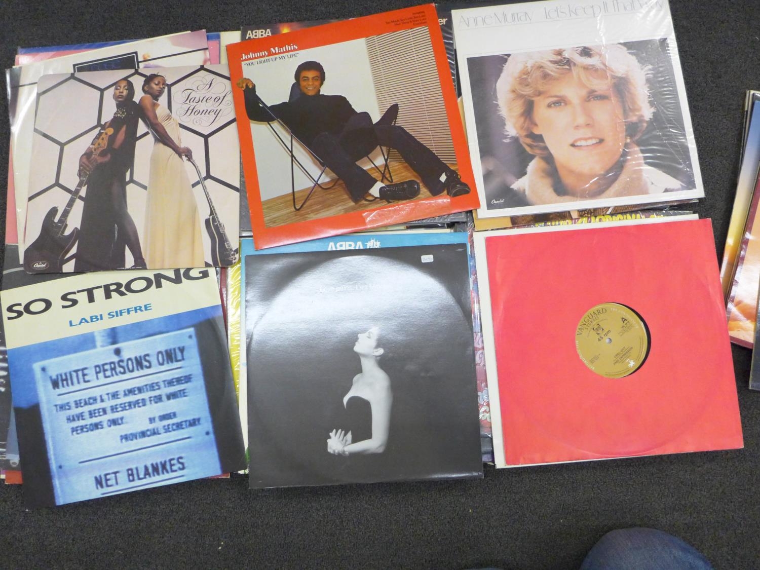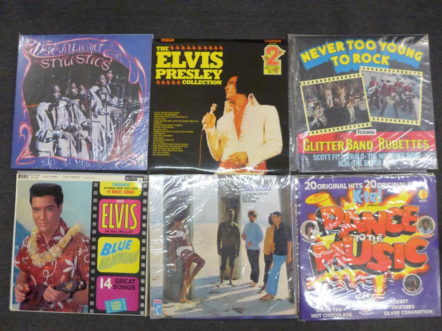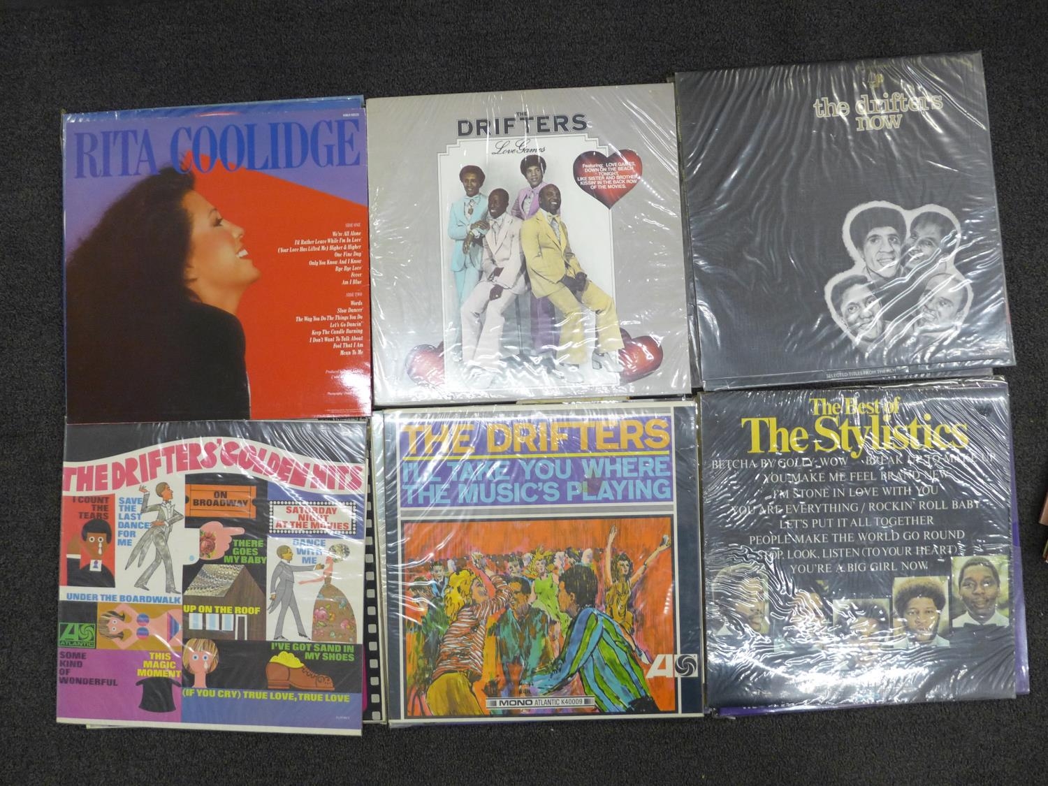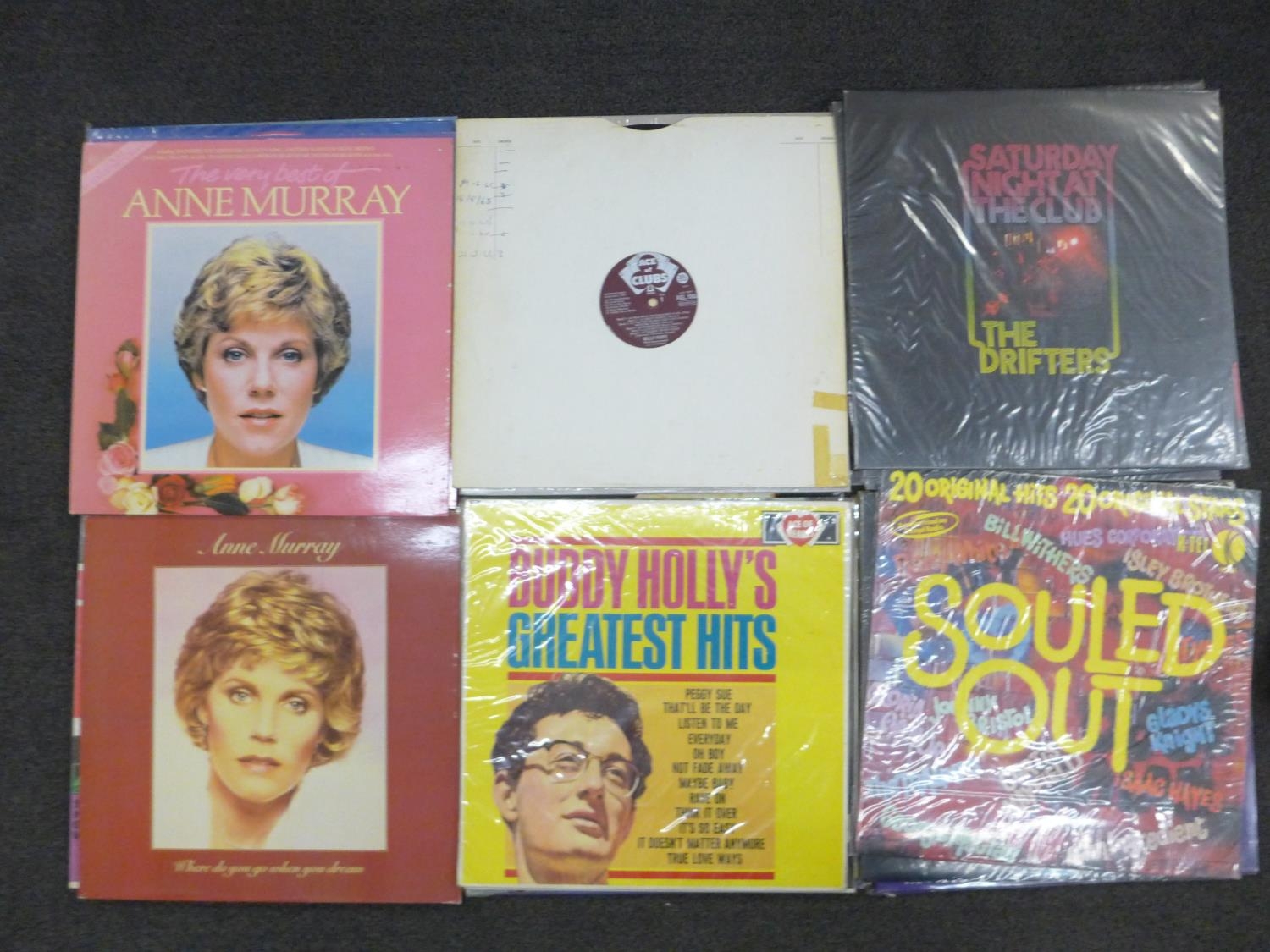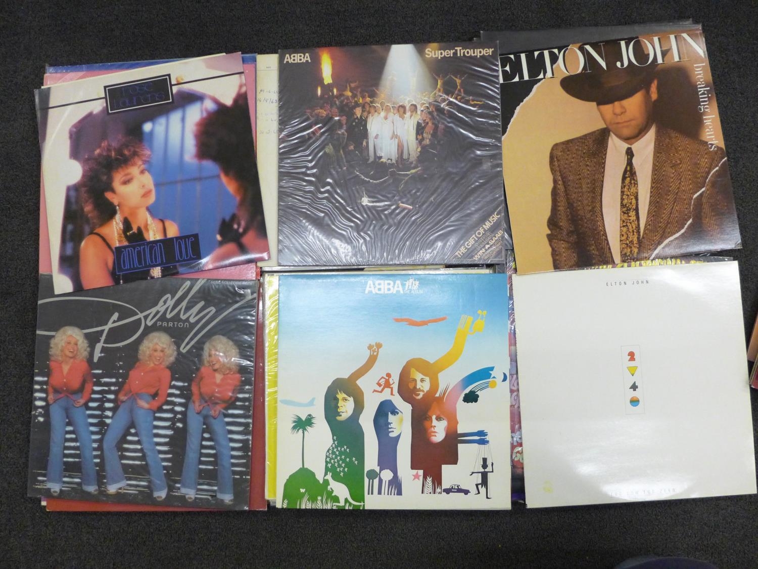 A case of LP records, disco, pop and soul music, including Elton John, The Drifters, Elkie Brooks, Buddy Holly, etc., 44 in total