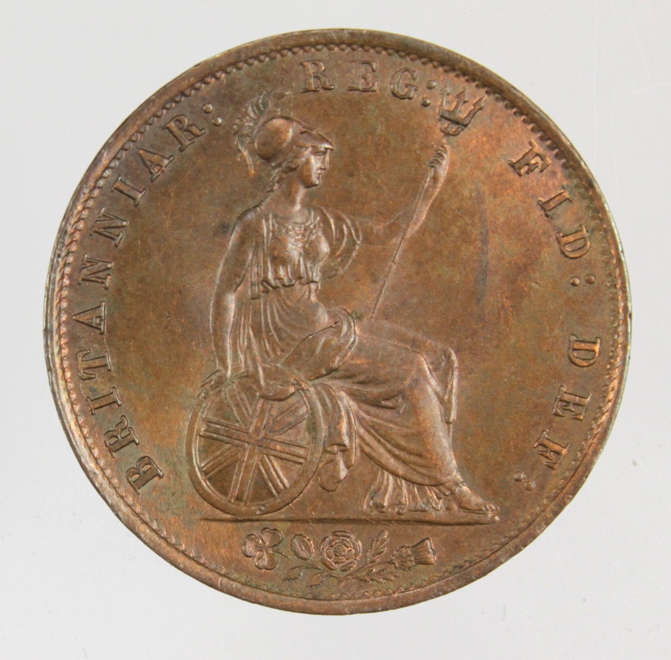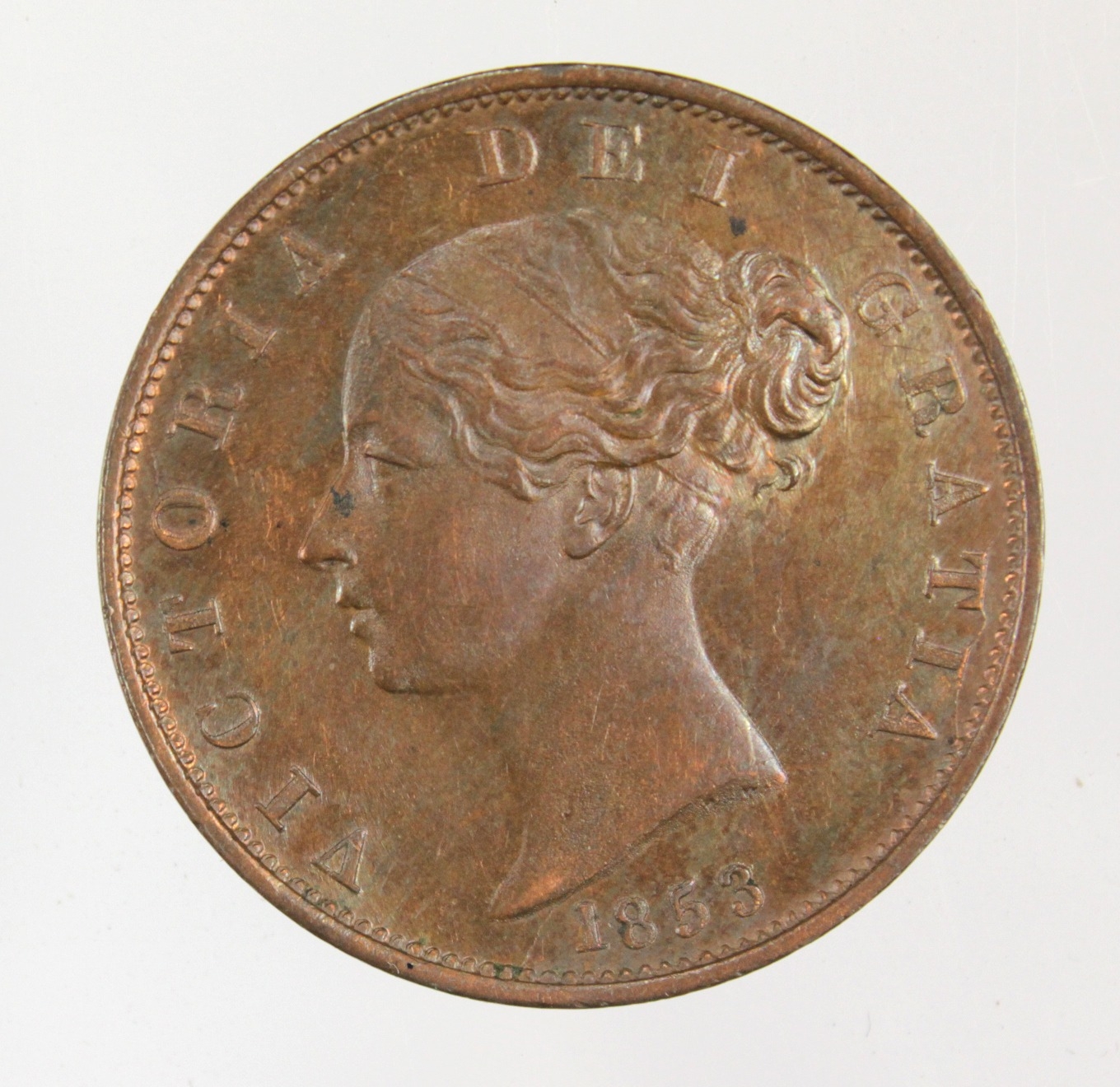 Halfpenny 1853 iridescent GEF.