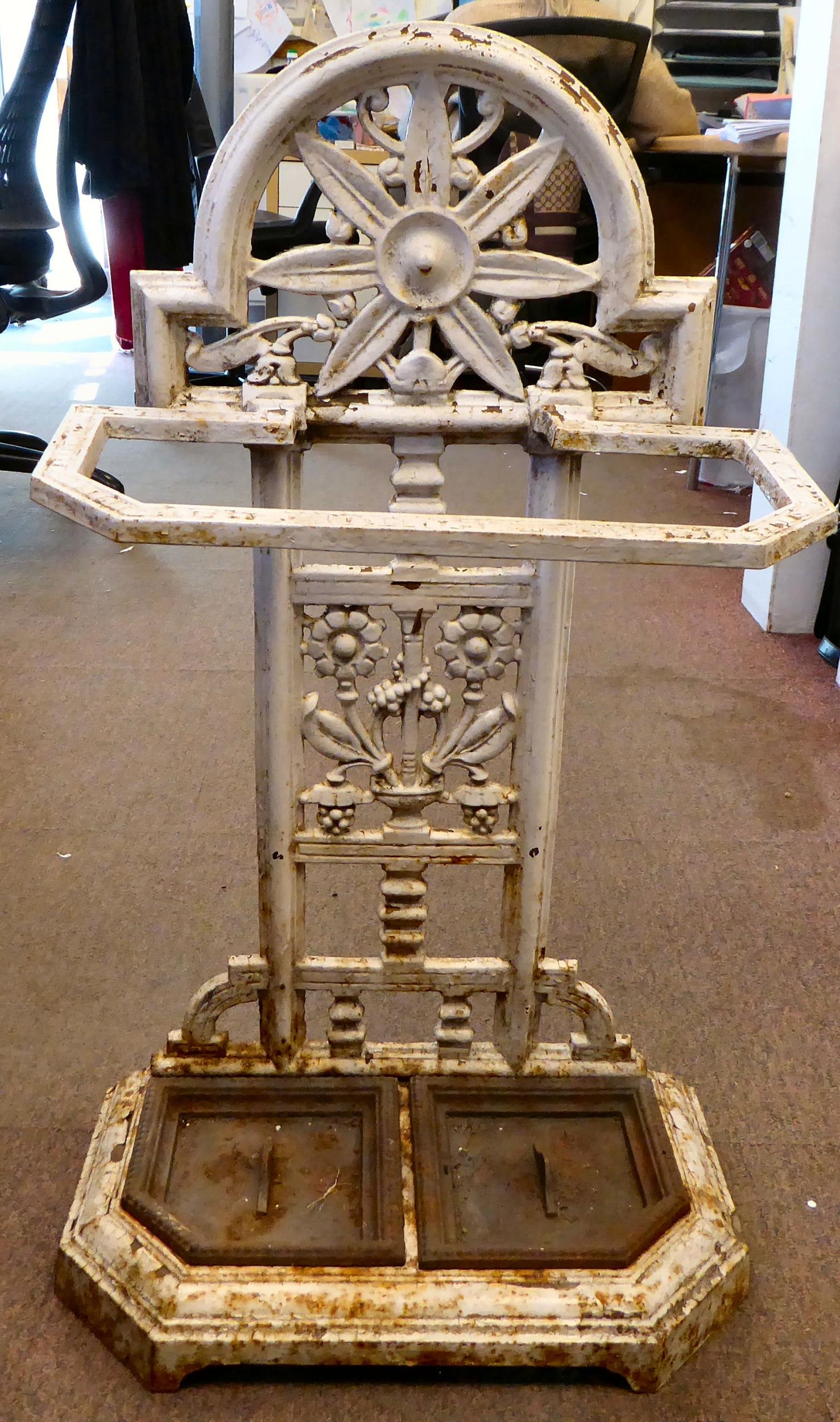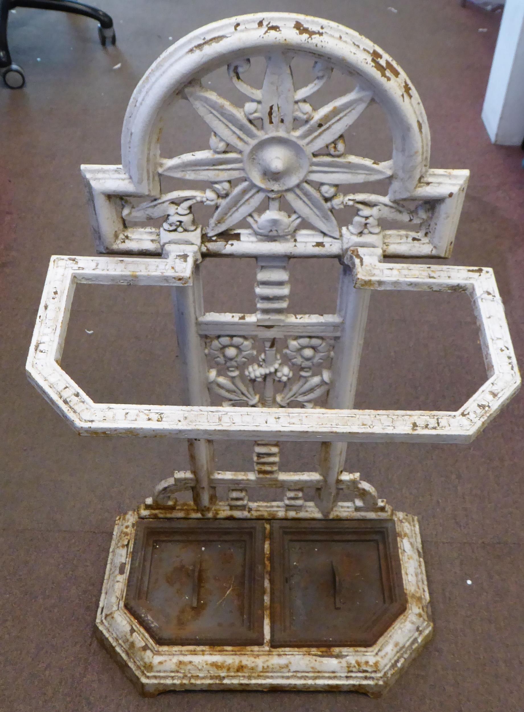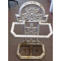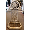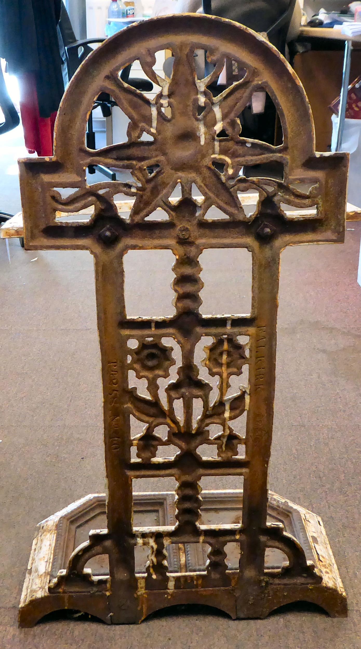 A late Victorian Falkirk painted cast iron stickstand, attributed to Christopher Dresser with decorative floral ornament and a pair of removeable base trays bears a Registry of Design mark 31"h 17"w