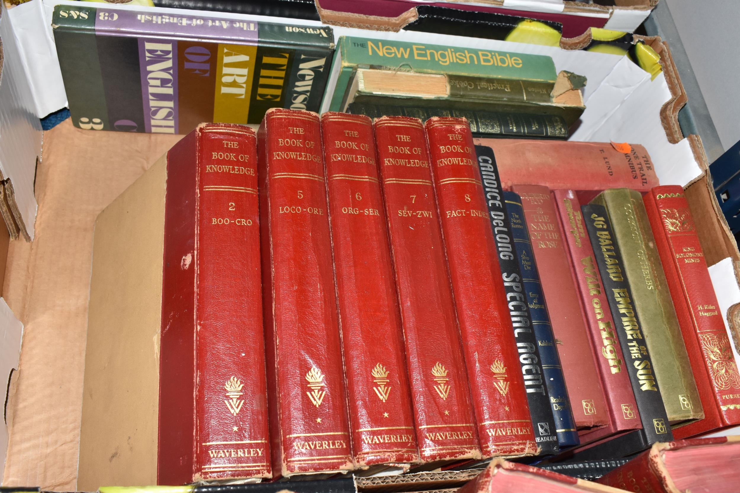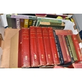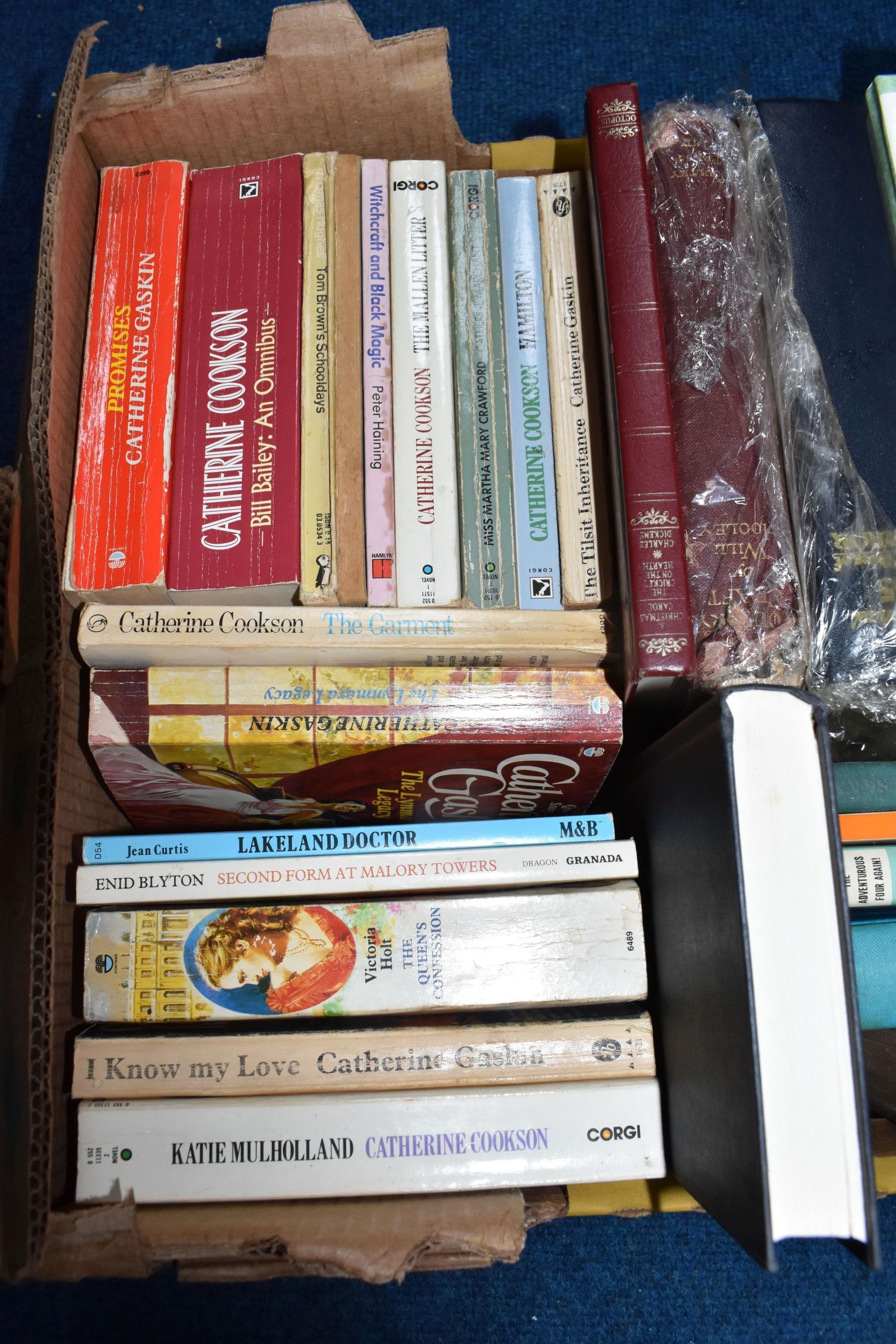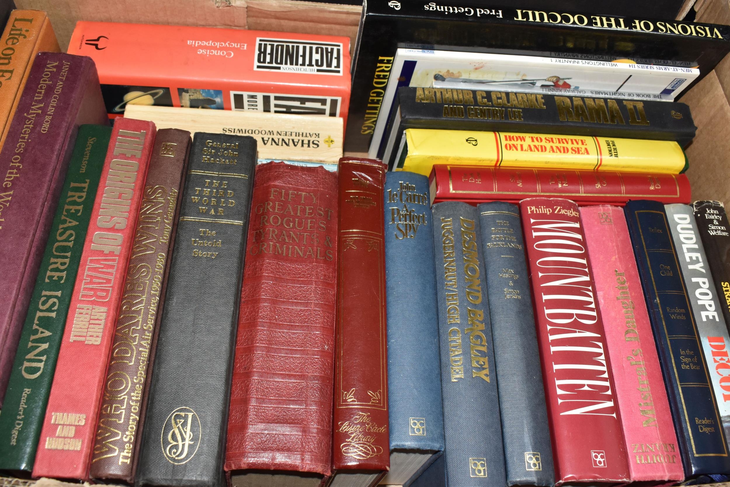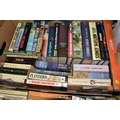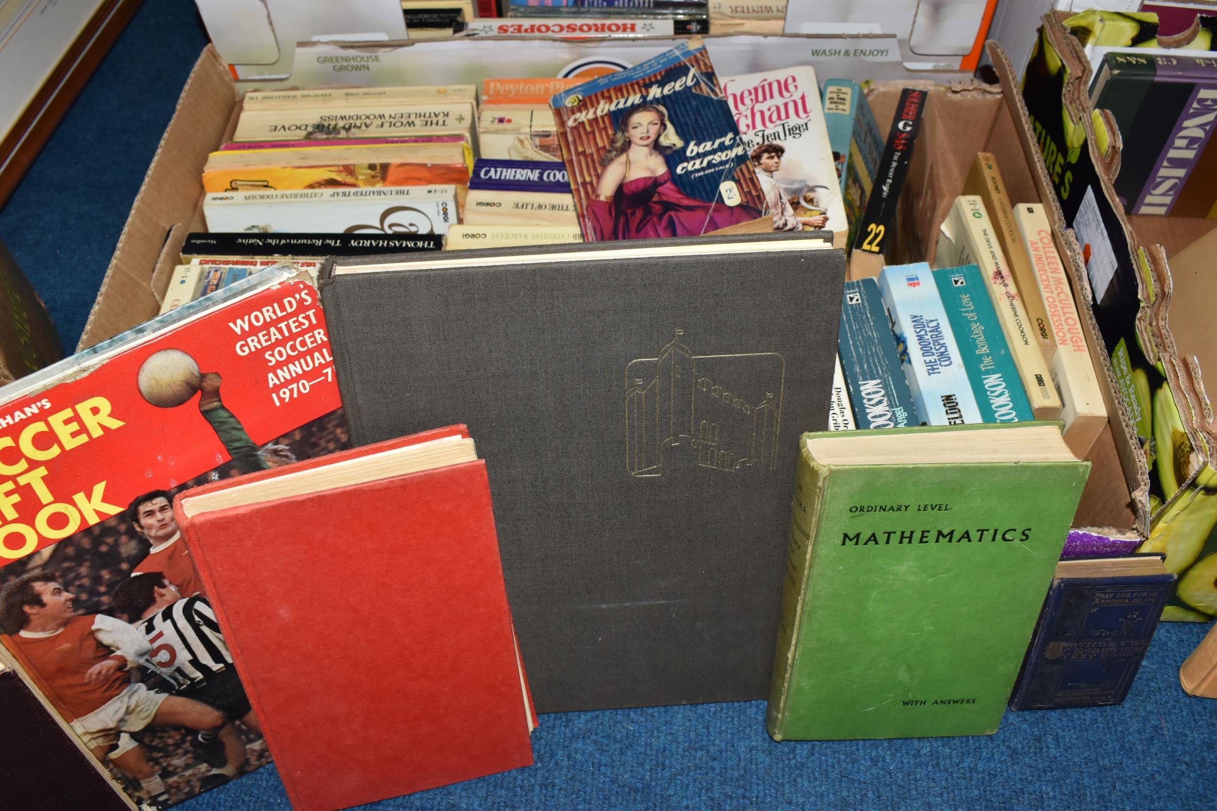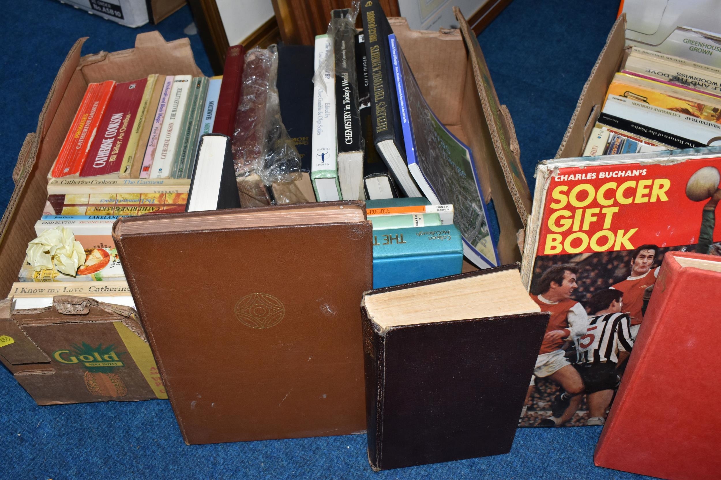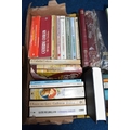 FIVE BOXES OF BOOKS to include a large quantity of military-related to assorted World War Two topics, a quantity of Catherine Cookson and similar novels, vintage reference books to include eight volumes of The Book of Knowledge, books about landmarks, a 1970s Soccer Gift Book etc, (5 boxes) (s.d)