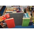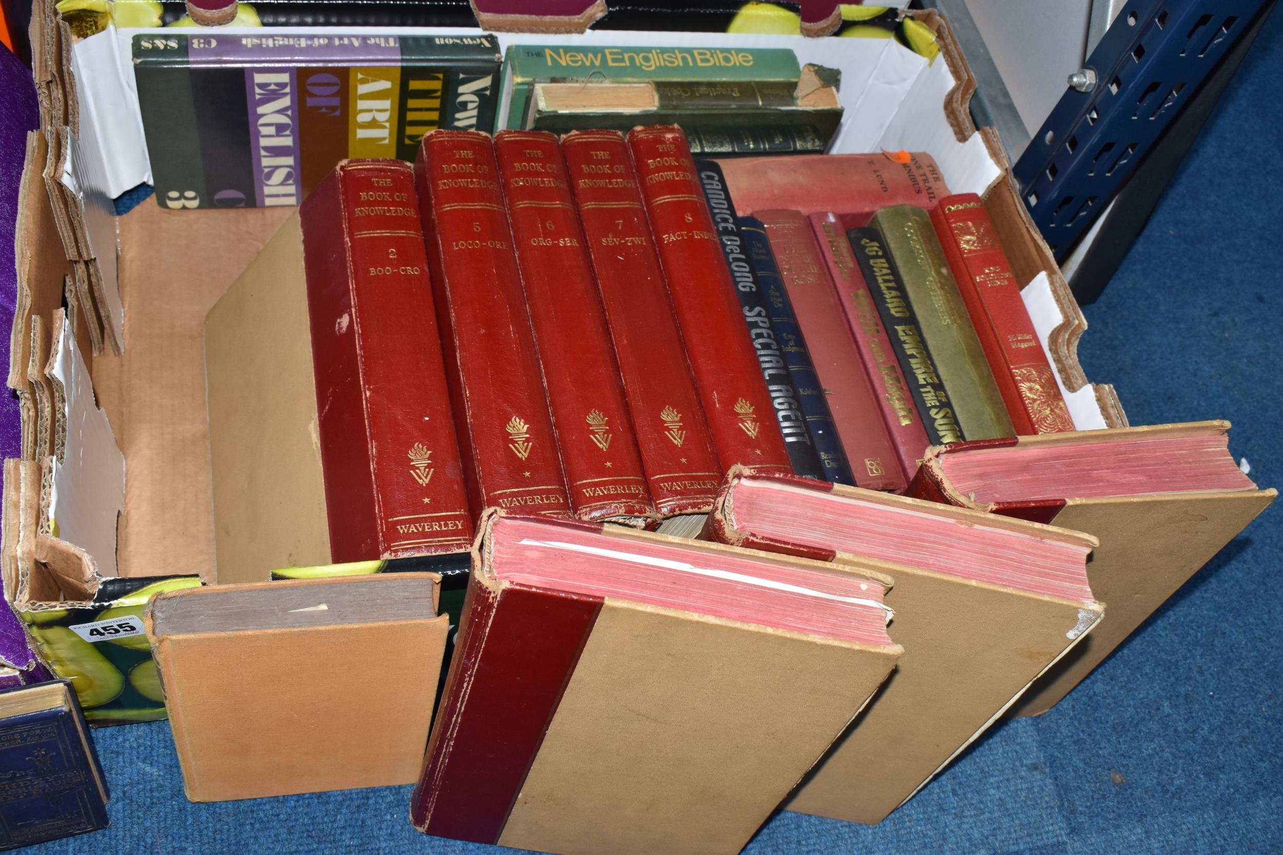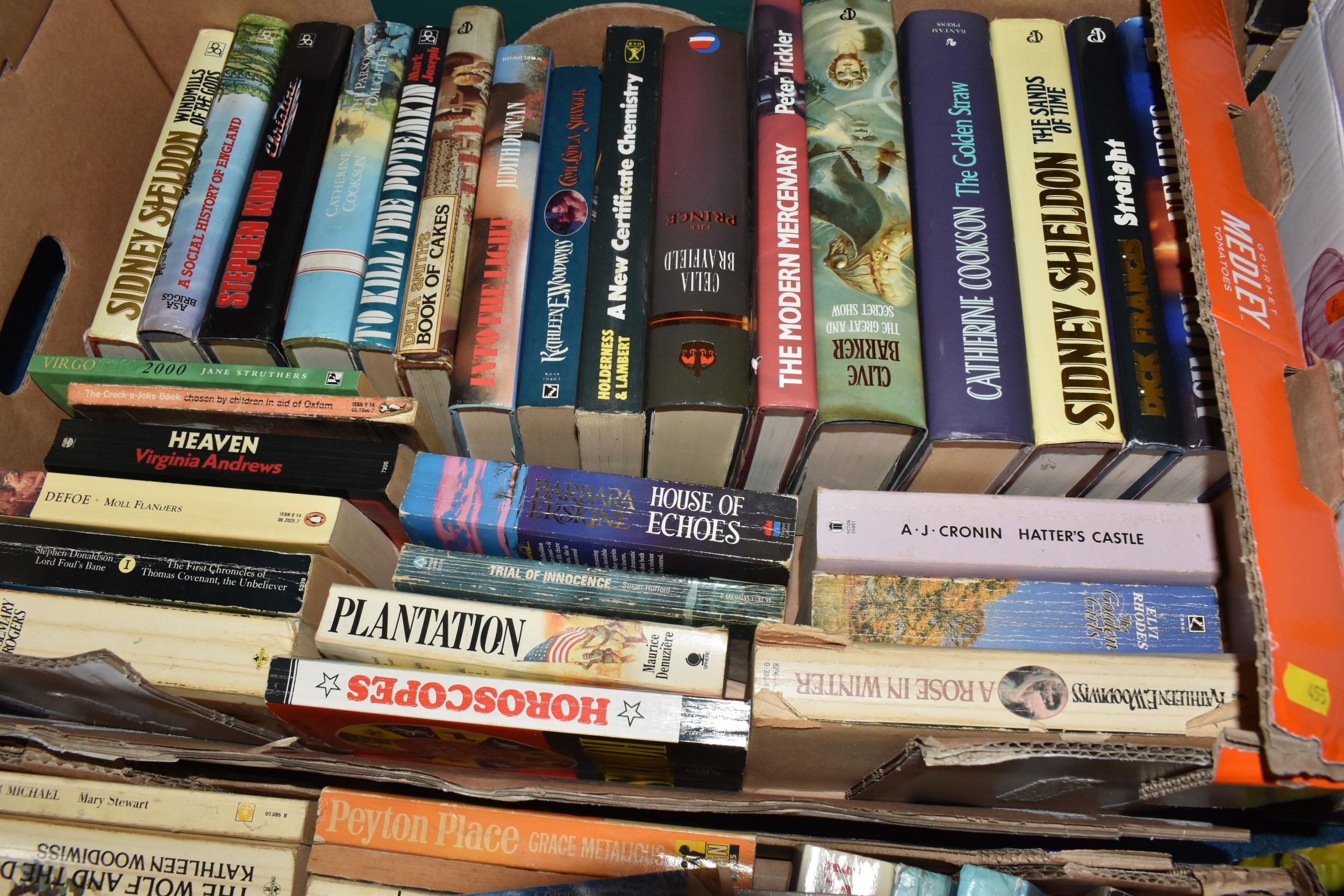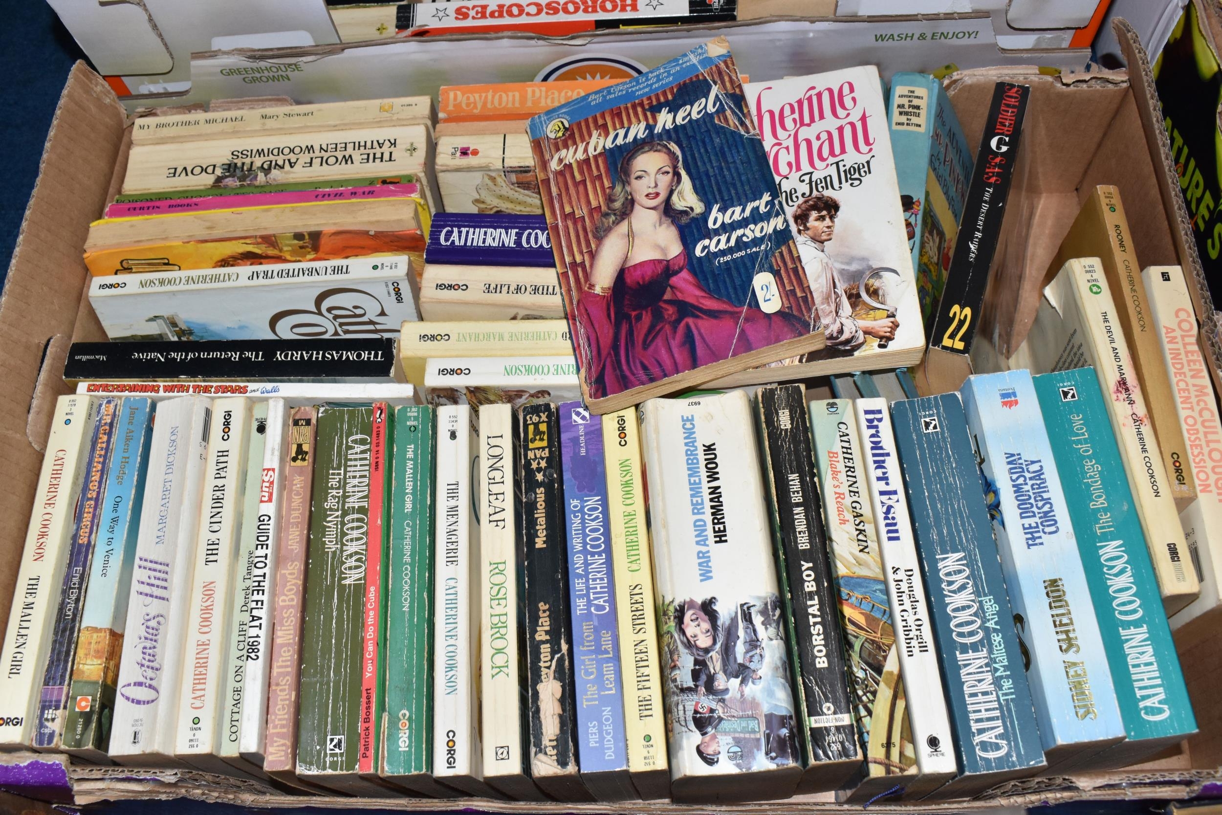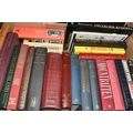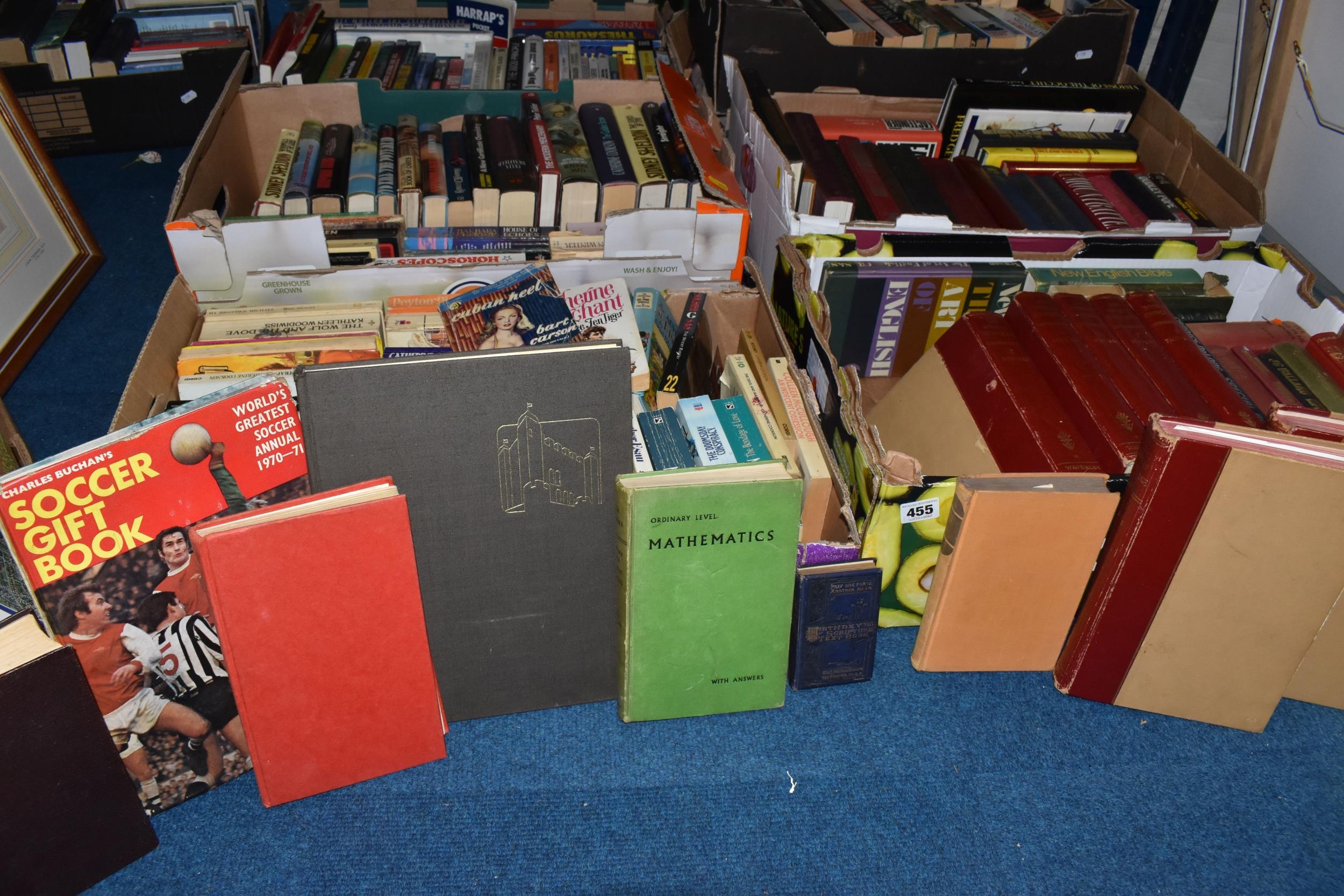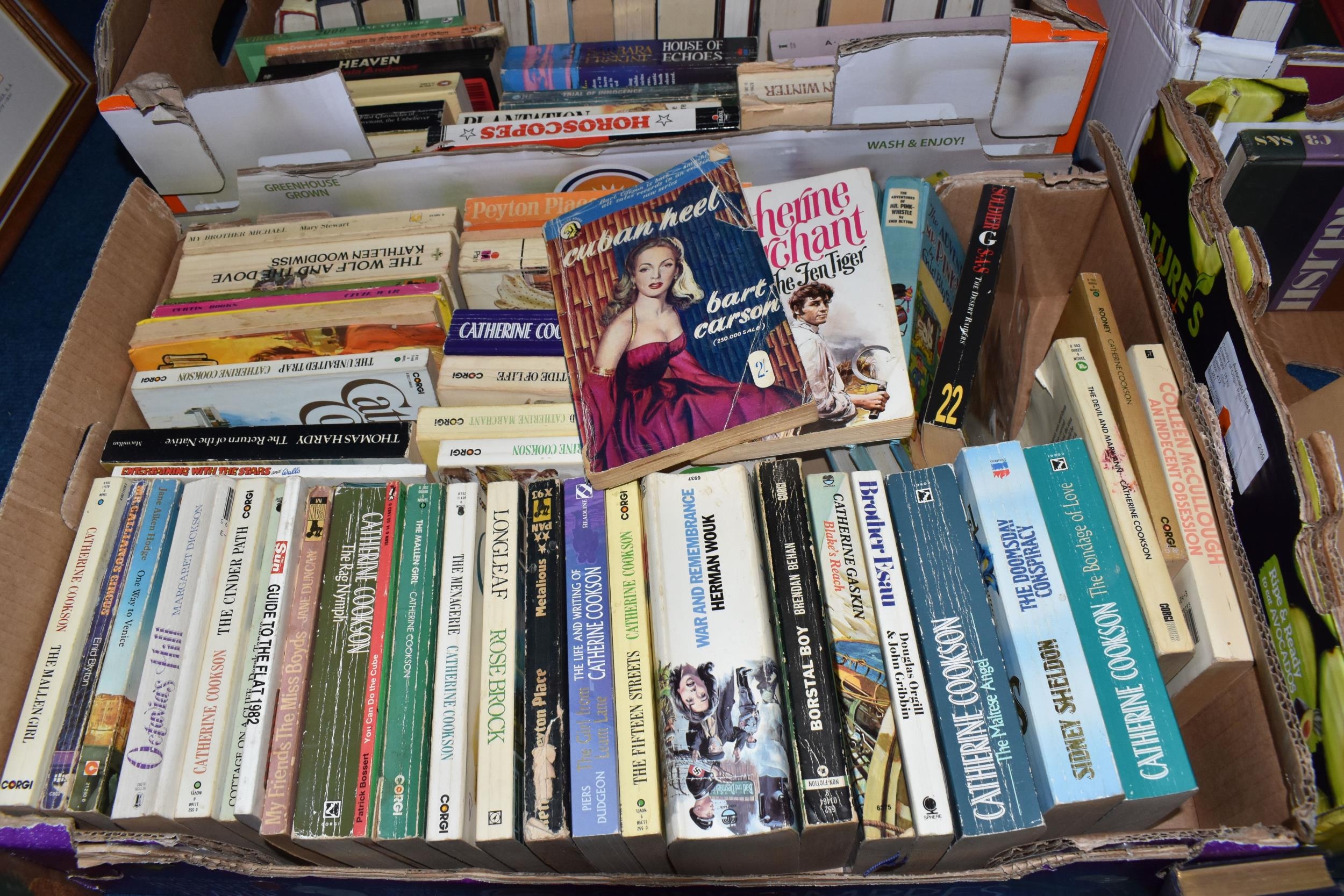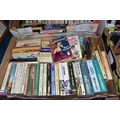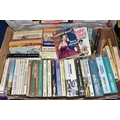 FIVE BOXES OF BOOKS to include a large quantity of military-related to assorted World War Two topics, a quantity of Catherine Cookson and similar novels, vintage reference books to include eight volumes of The Book of Knowledge, books about landmarks, a 1970s Soccer Gift Book etc, (5 boxes) (s.d)