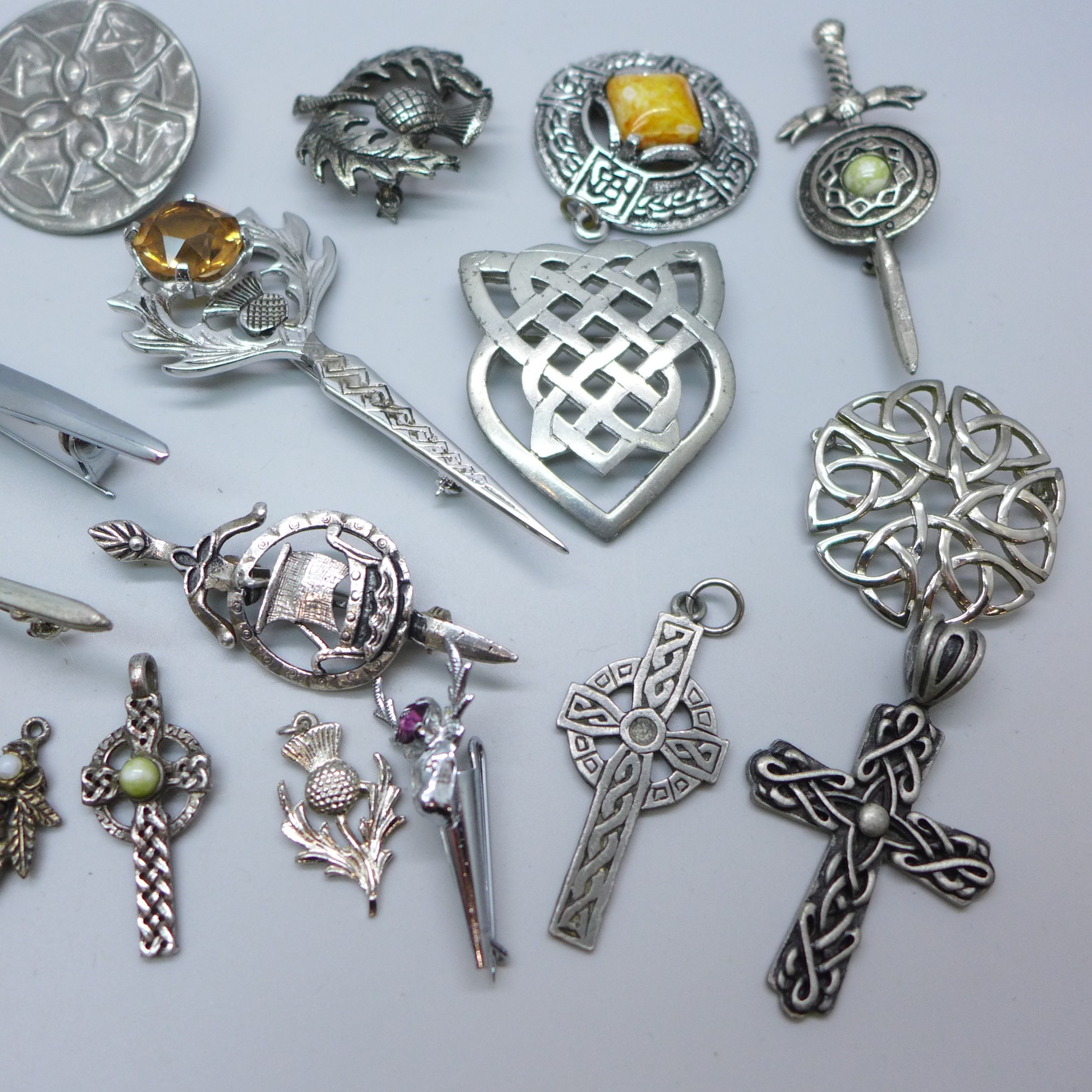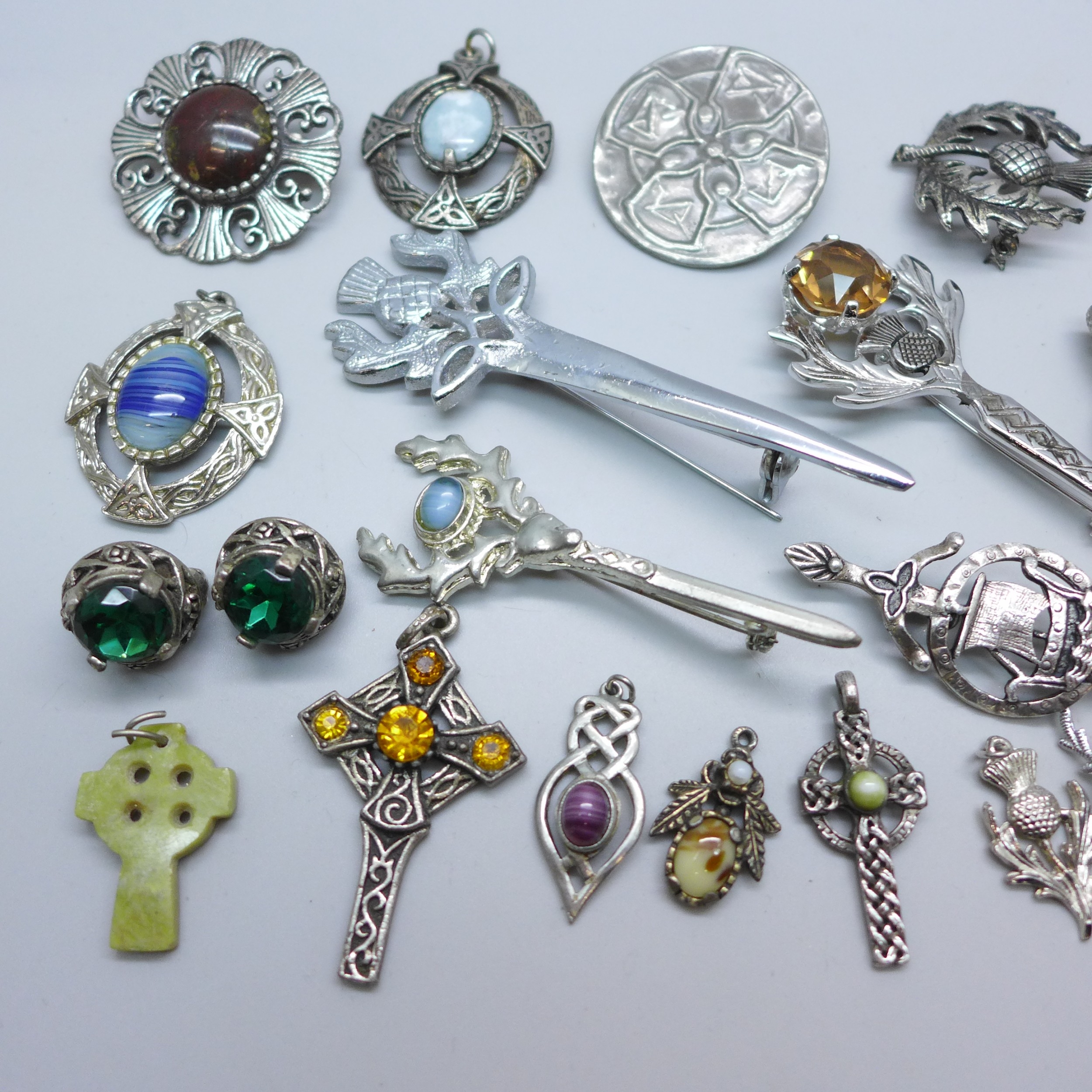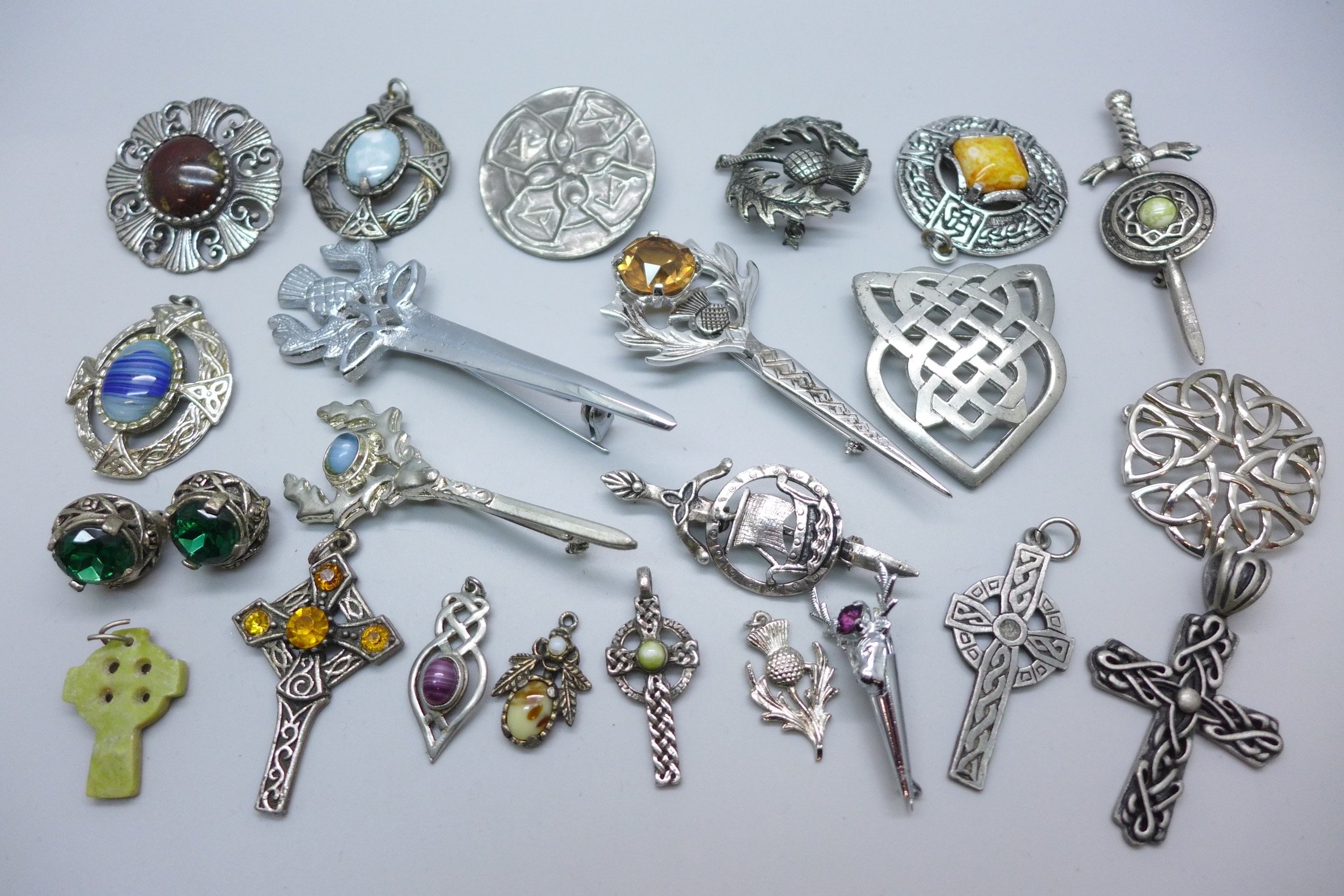 Eleven Scottish costume brooches, eleven pendants, and a pair of earrings