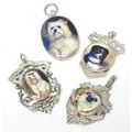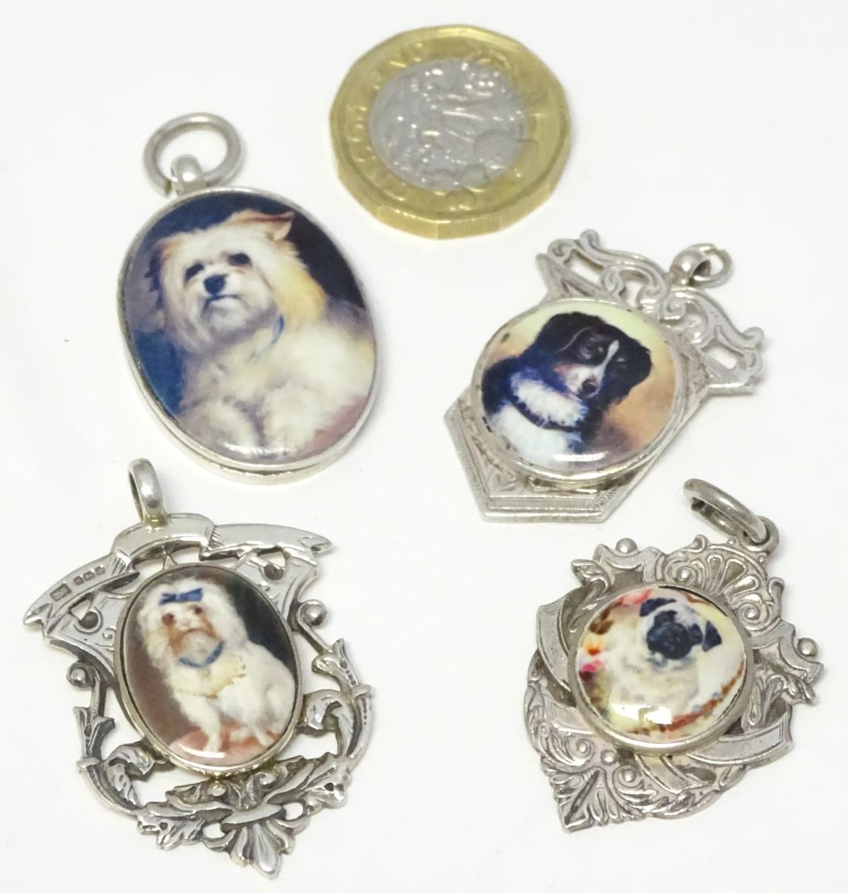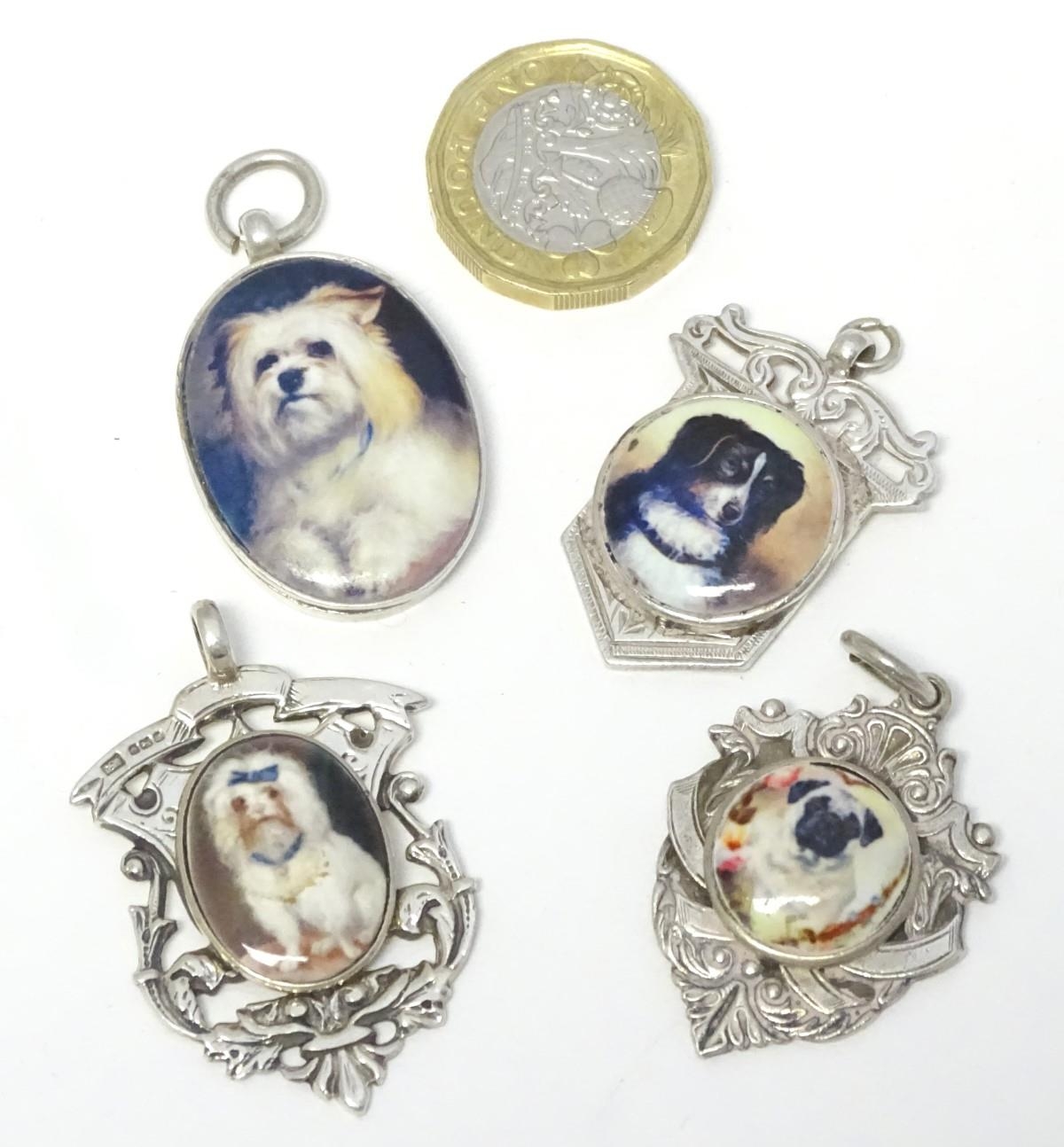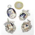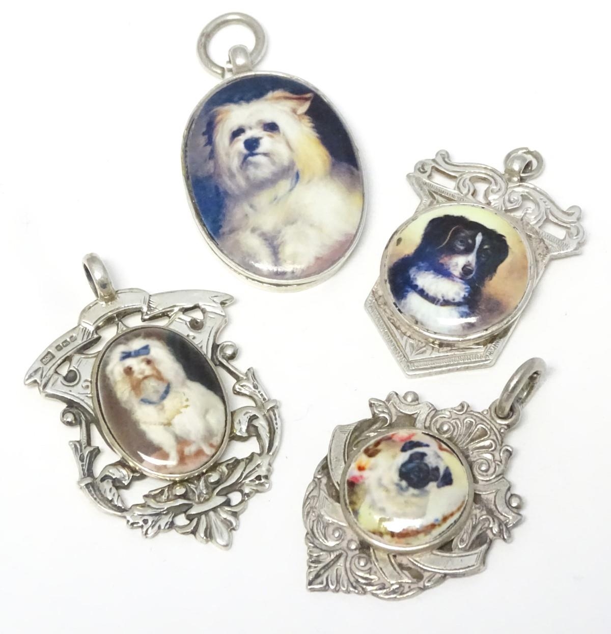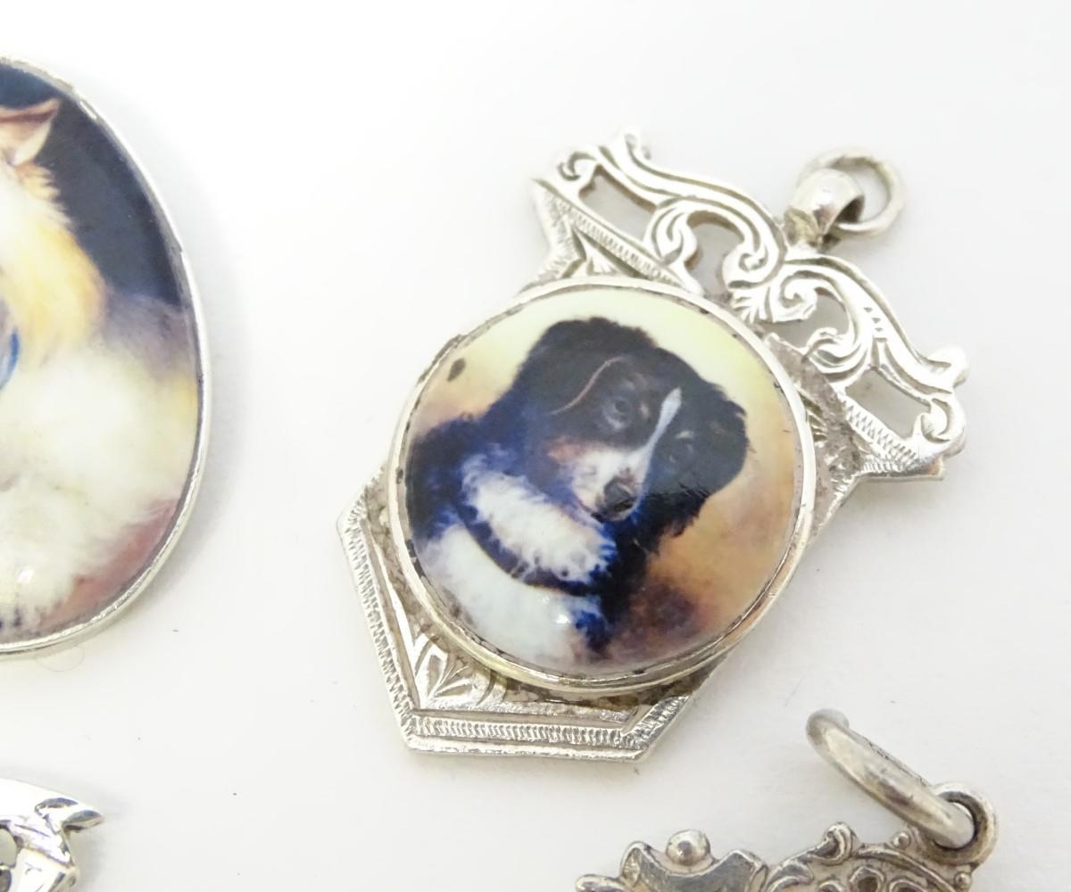 Assorted silver and silver plate fob with later applied enamel decoration depicting various dogs. (4)
