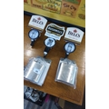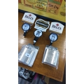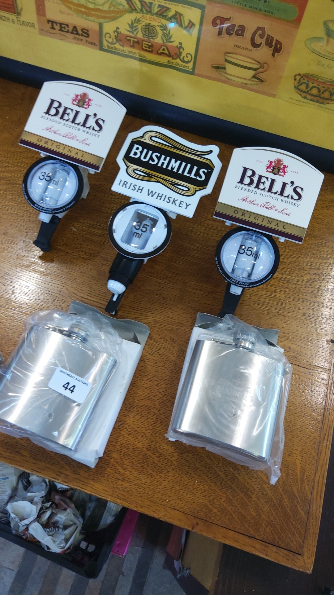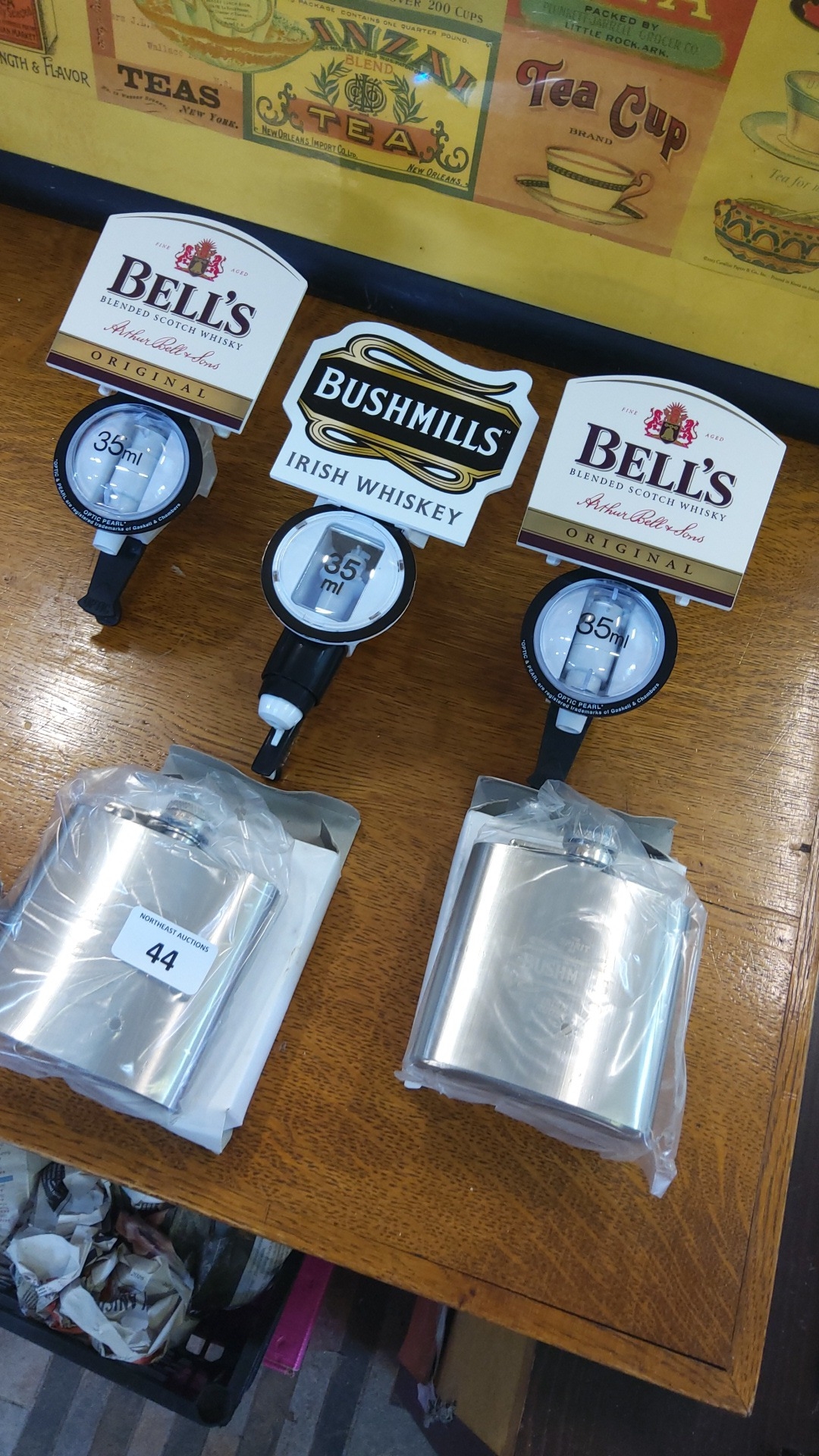 A group of whisky bar accessories including three plastic Optic Pearl 35 ml spirit measures with Bell’s and Bushmills branded pump clips, accompanied by two stainless-steel hip flasks, etched Bushmills.