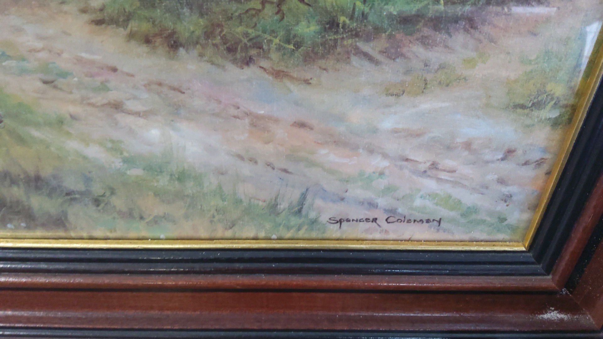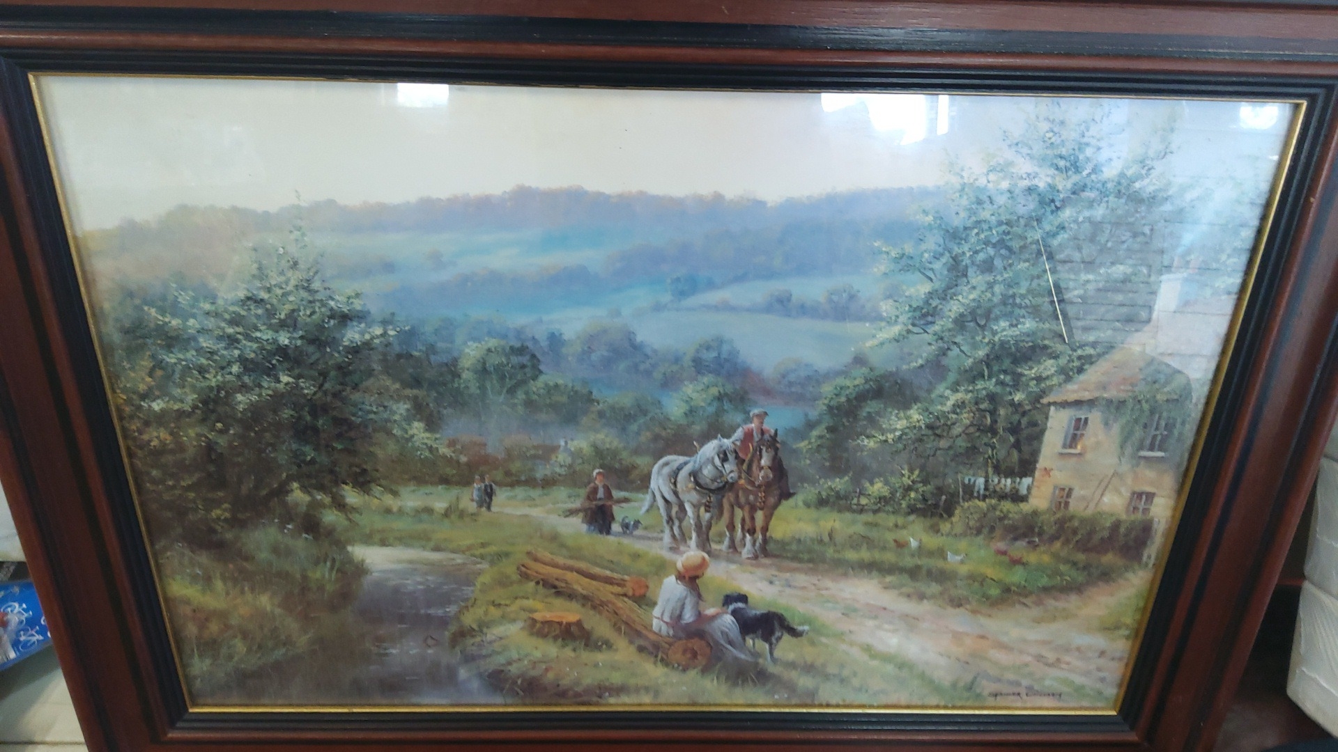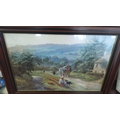 Spencer Coleman print—rural landscape with cottage, figures and a horse-drawn cart on a lane, with distant wooded hills under a pale sky.