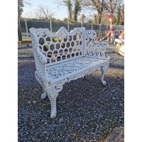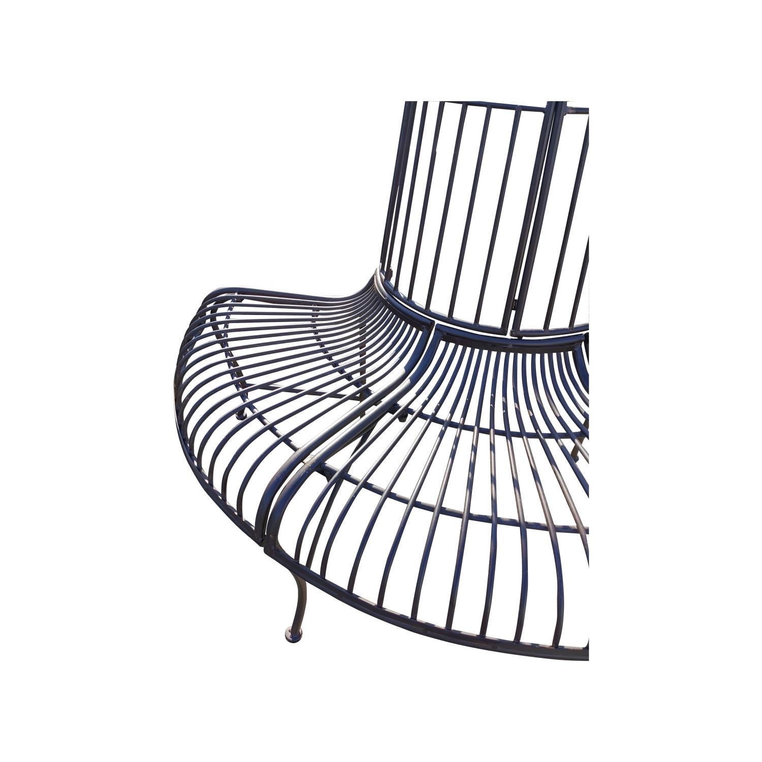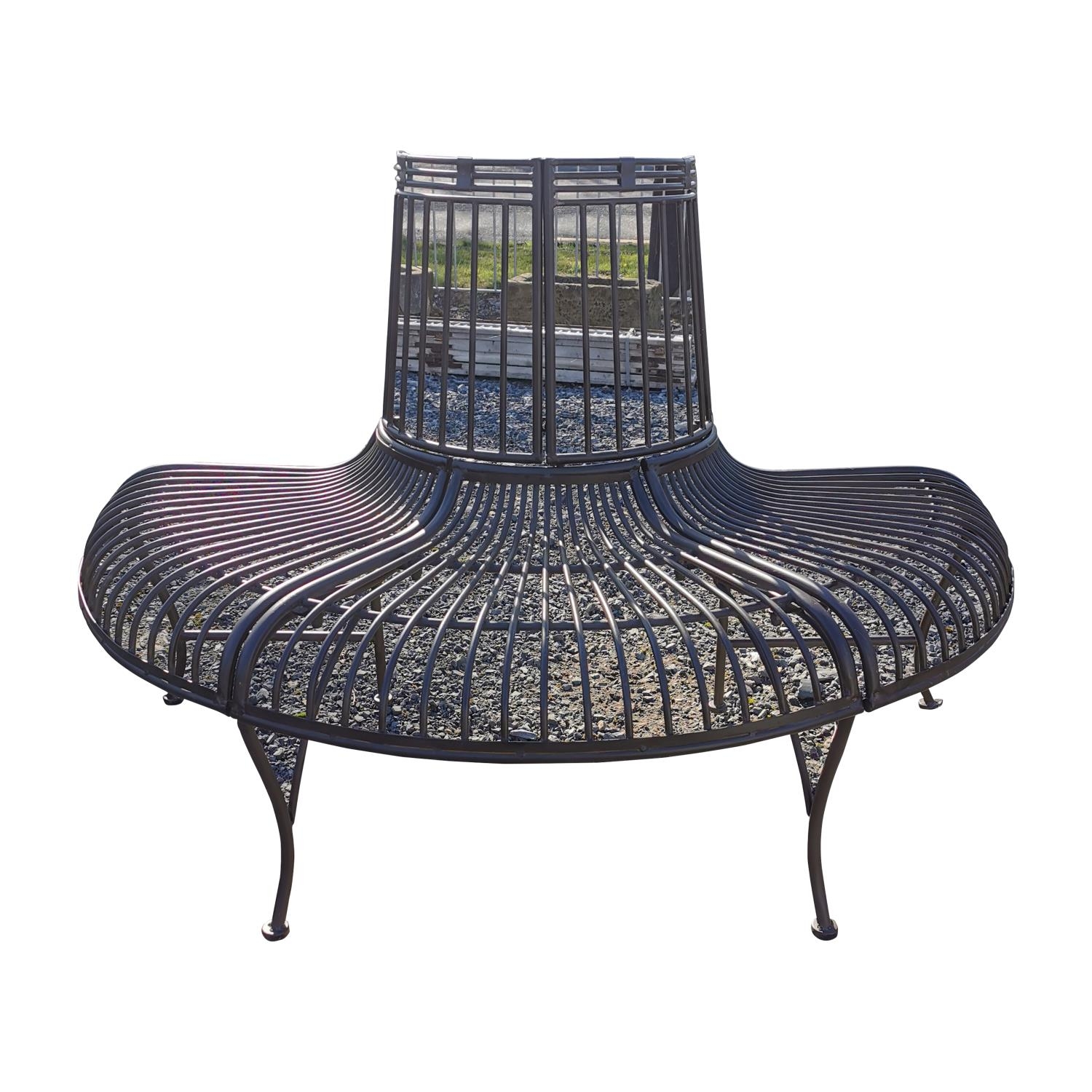 Decorative metal tree surround garden bench {85 cm H x 143 cm W x 66 cm D}.
