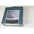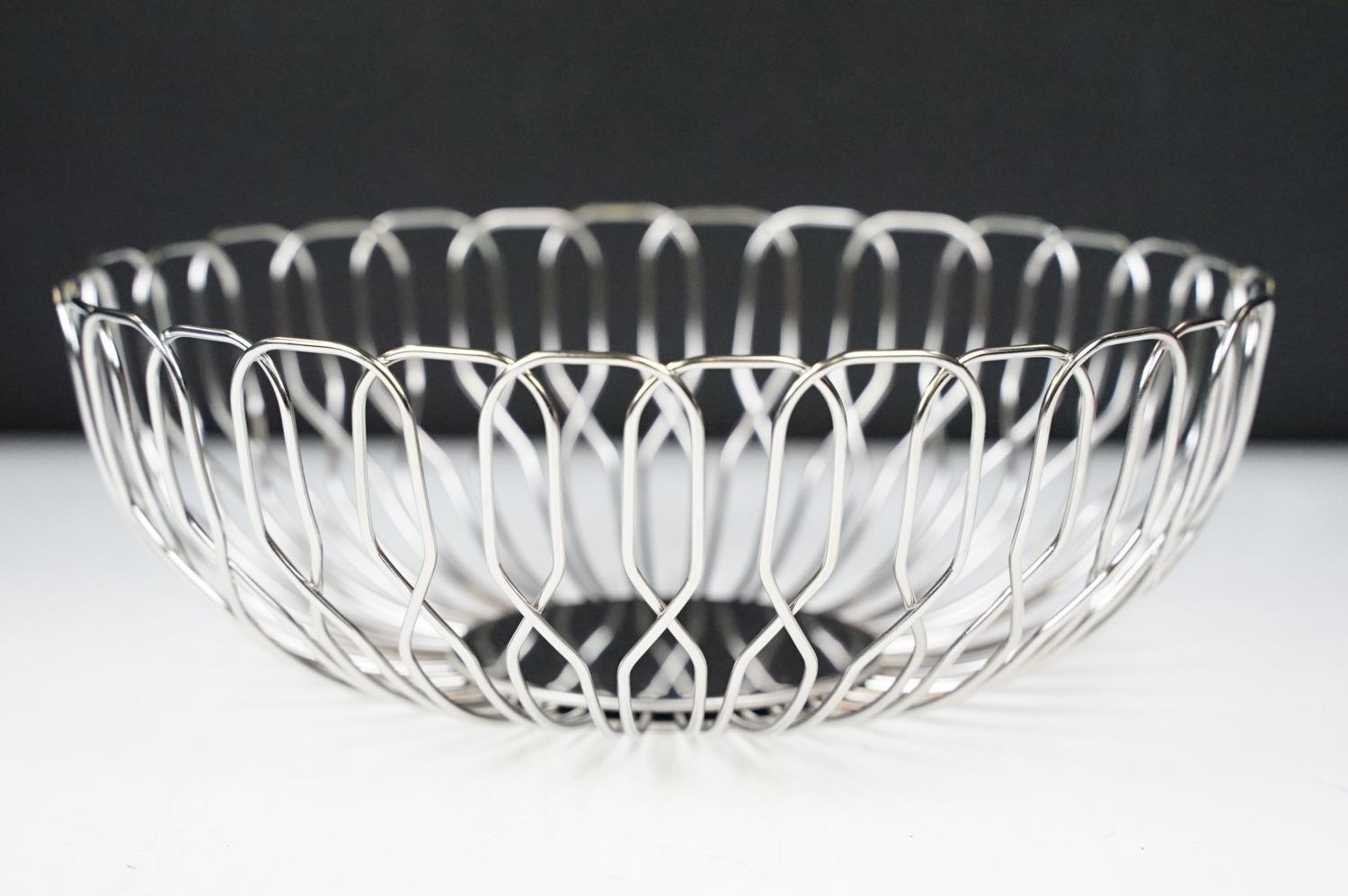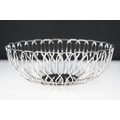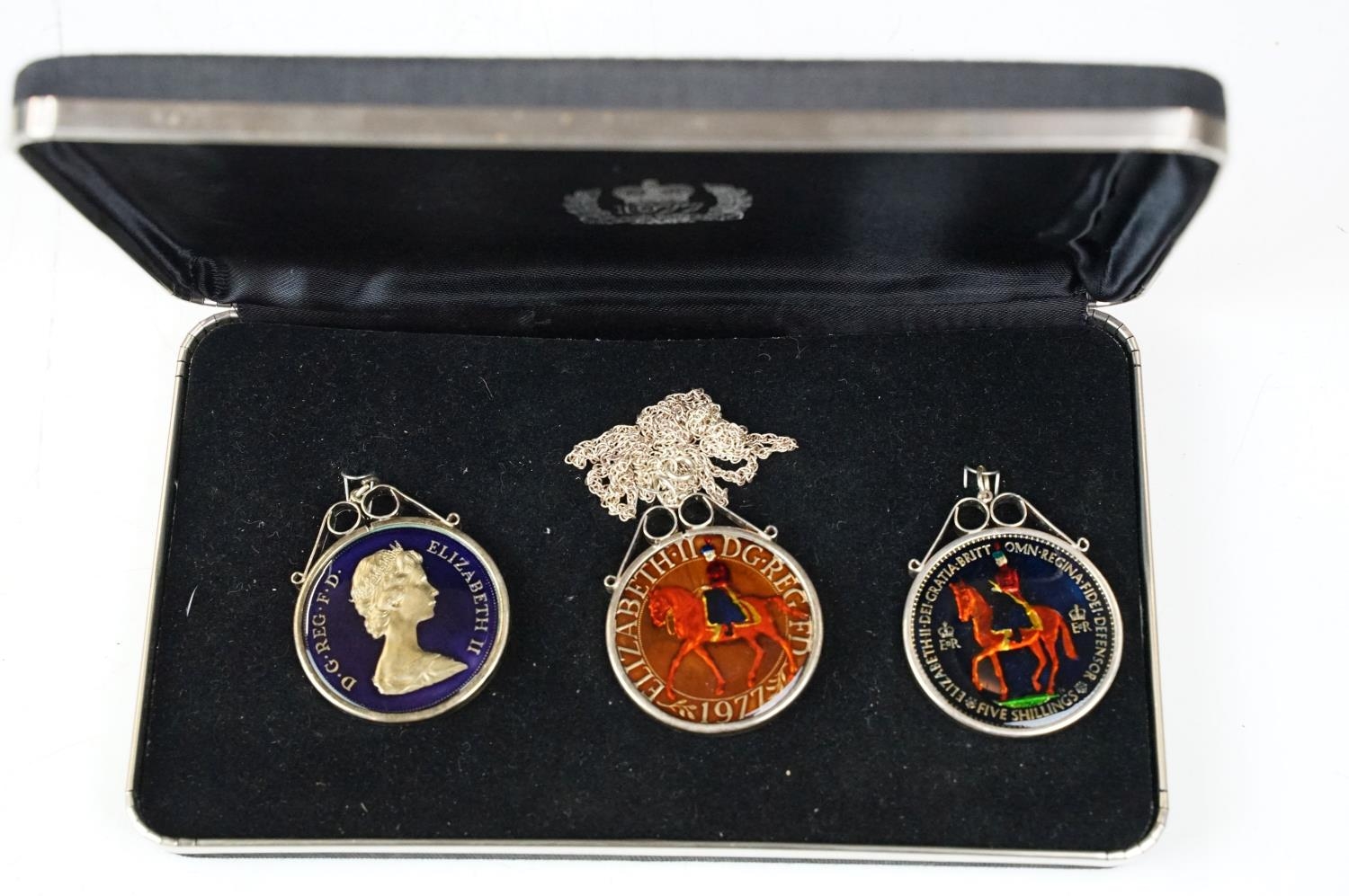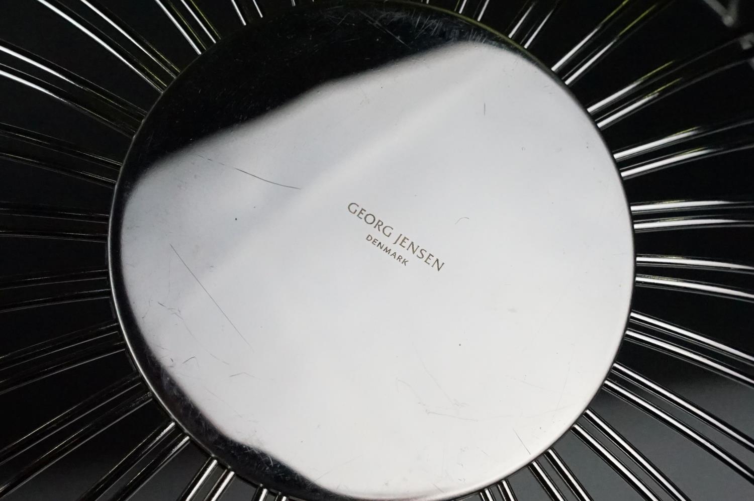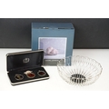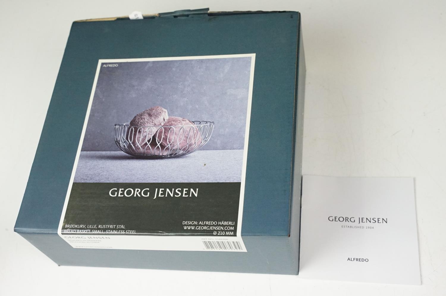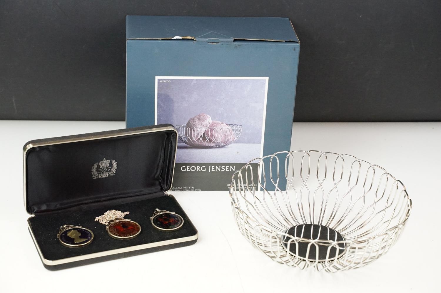 A small Georg Jensen stainless steel bread basket within original box together with three commemorative crown coin pendants.