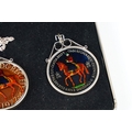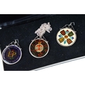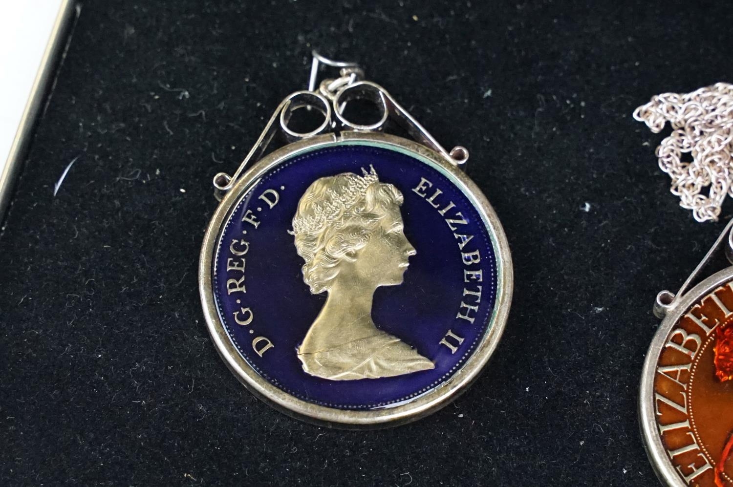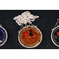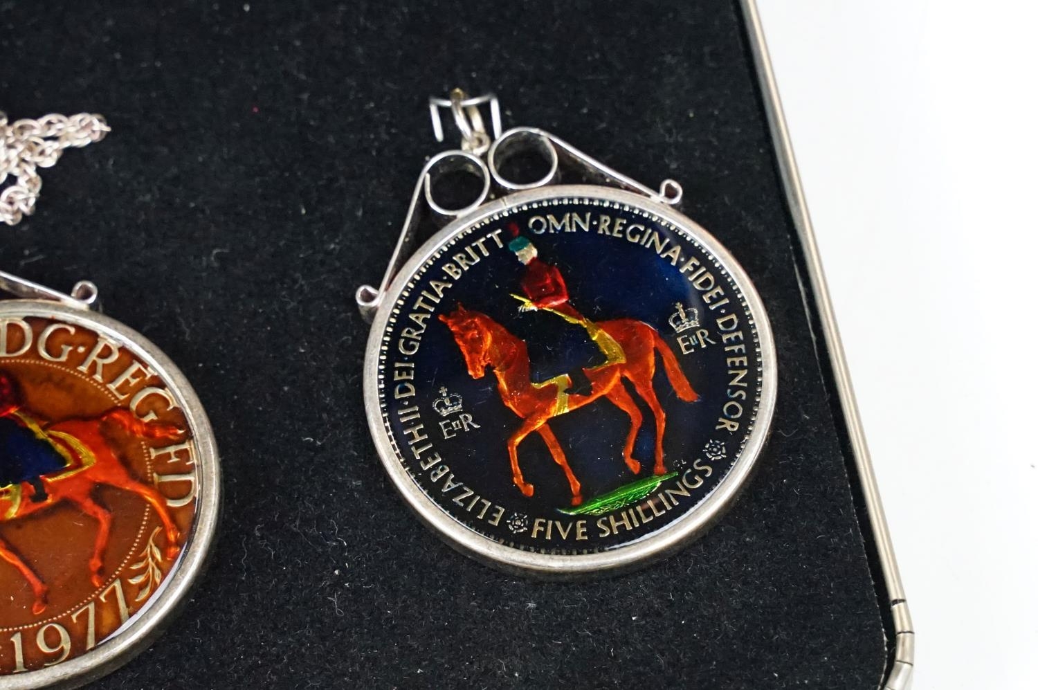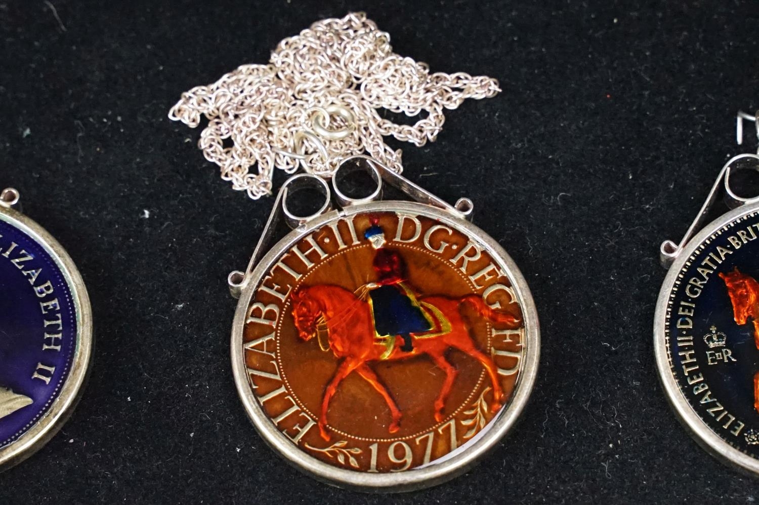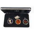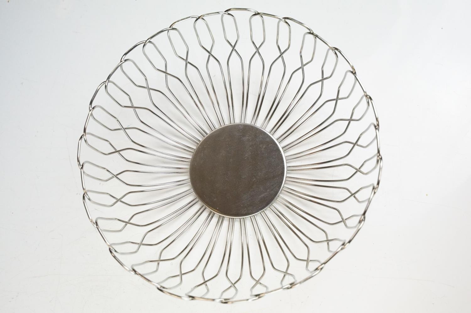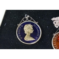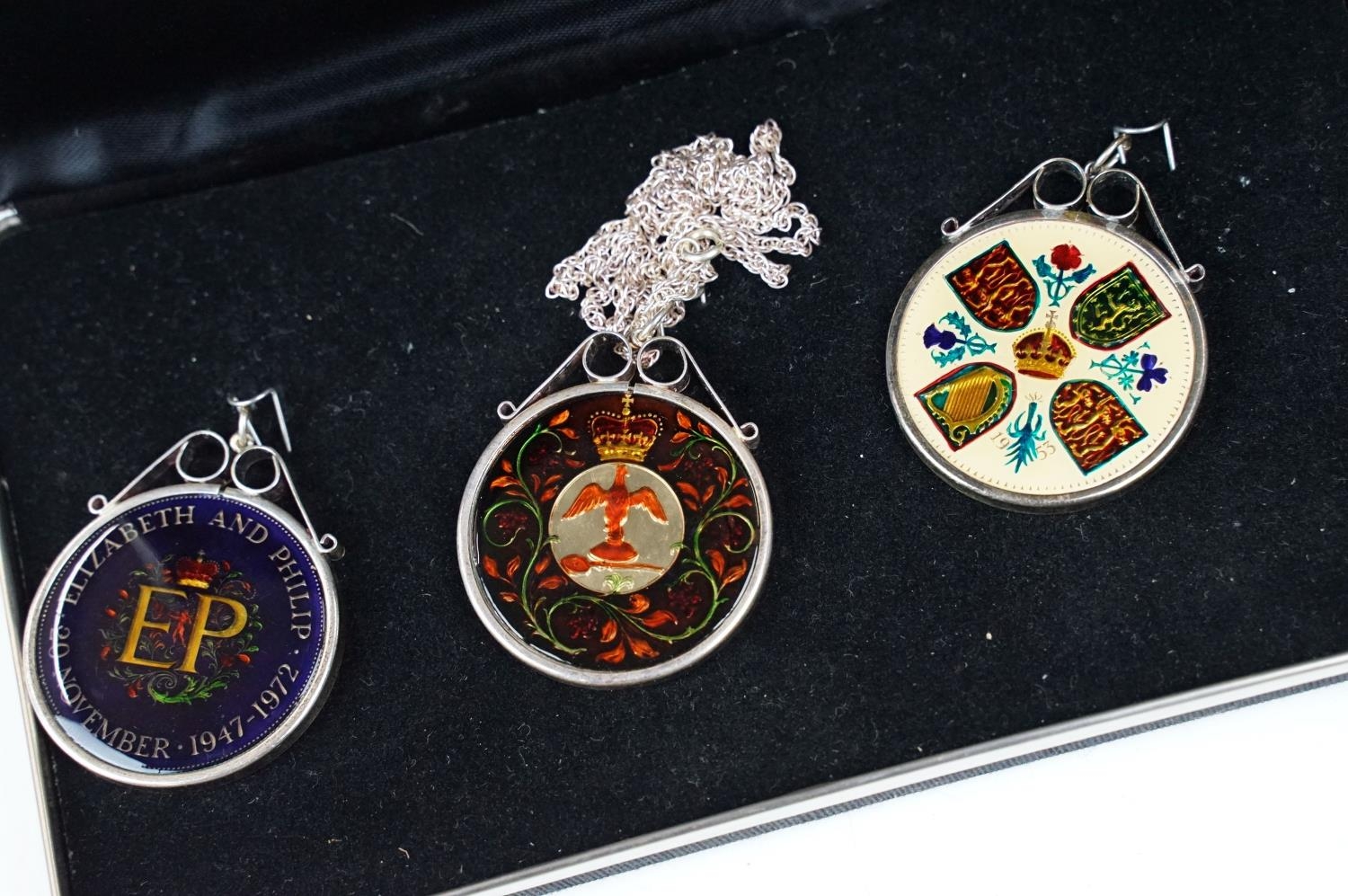 A small Georg Jensen stainless steel bread basket within original box together with three commemorative crown coin pendants.