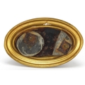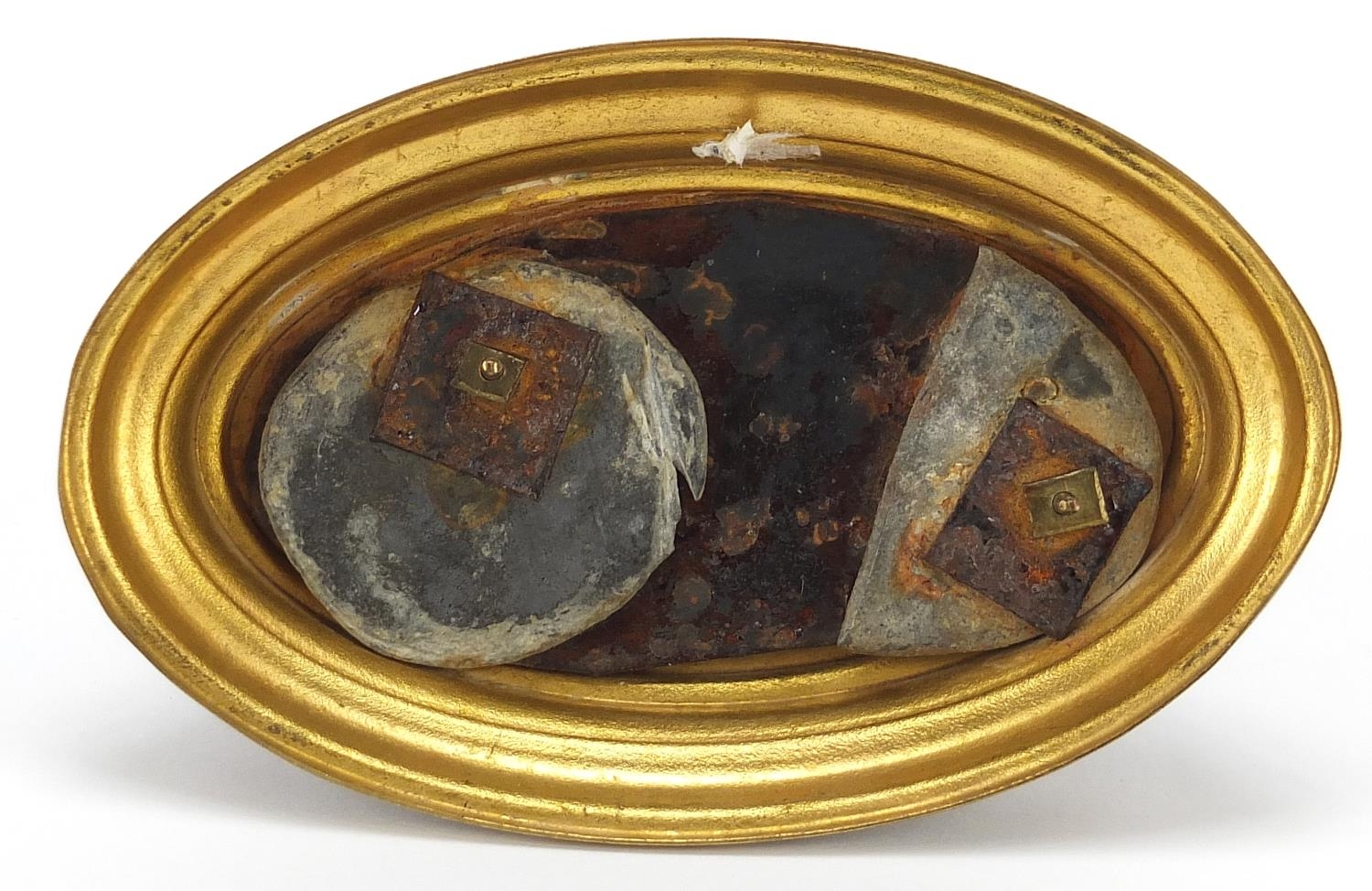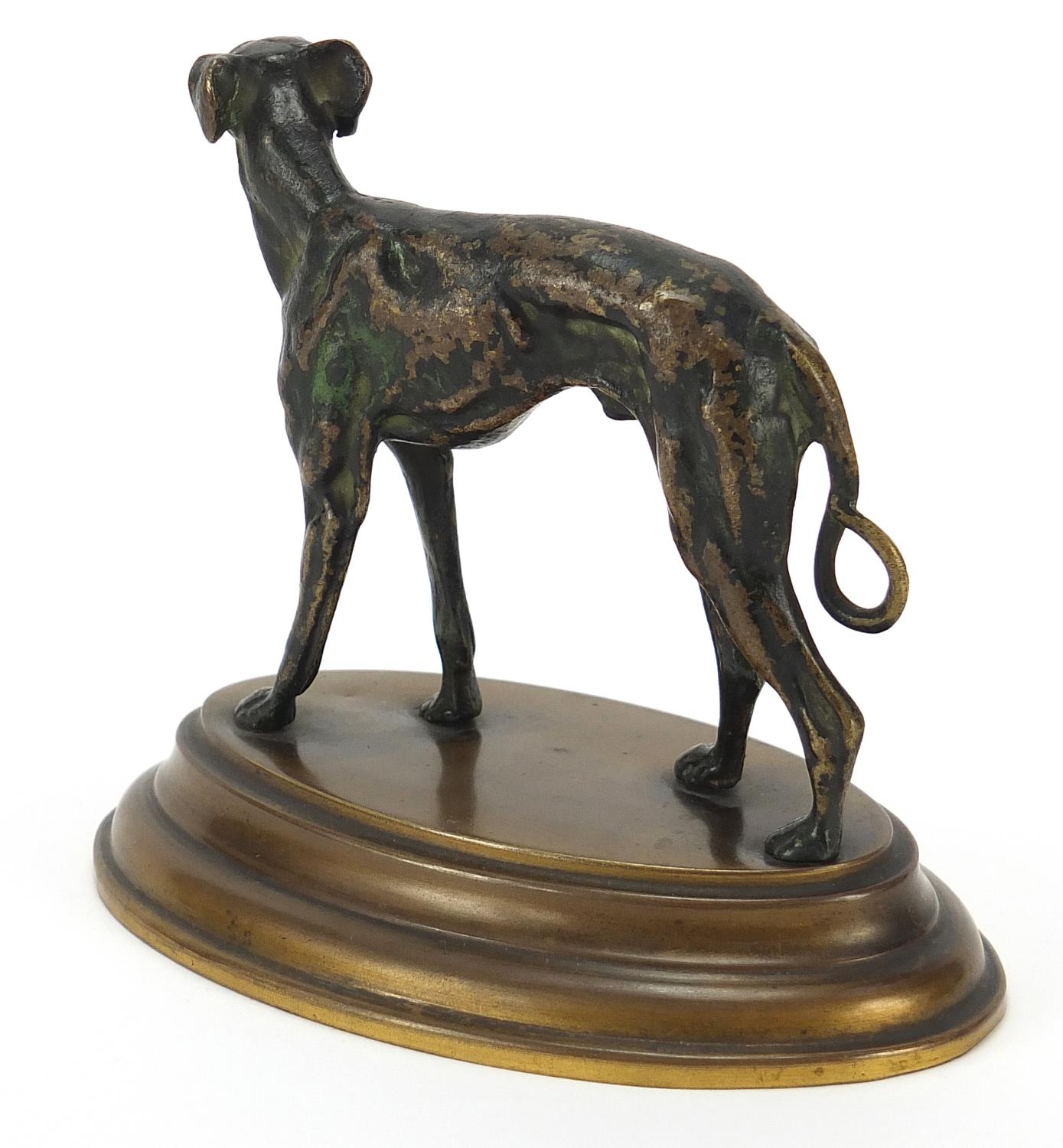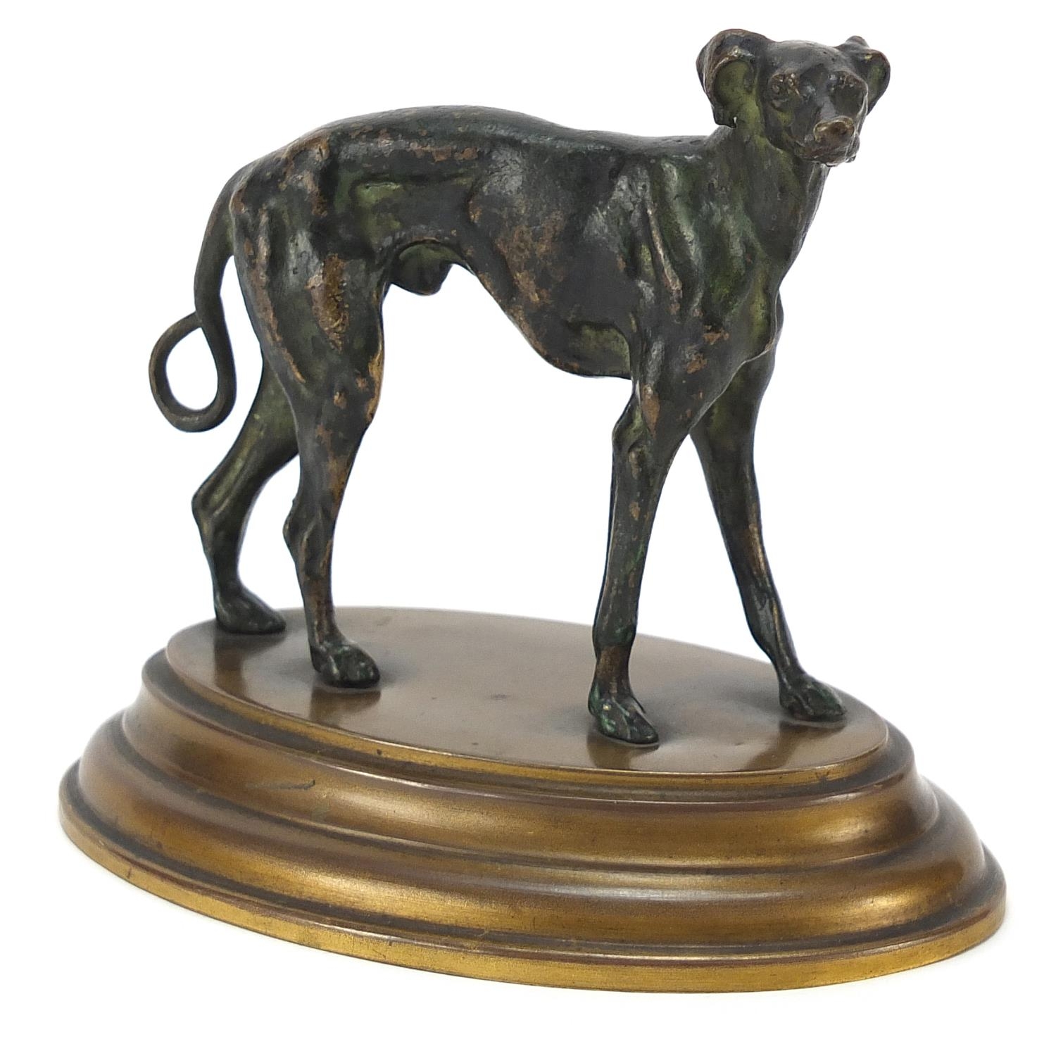19th century patinated bronze study of a greyhound raised on an oval brass base, 12cm wide