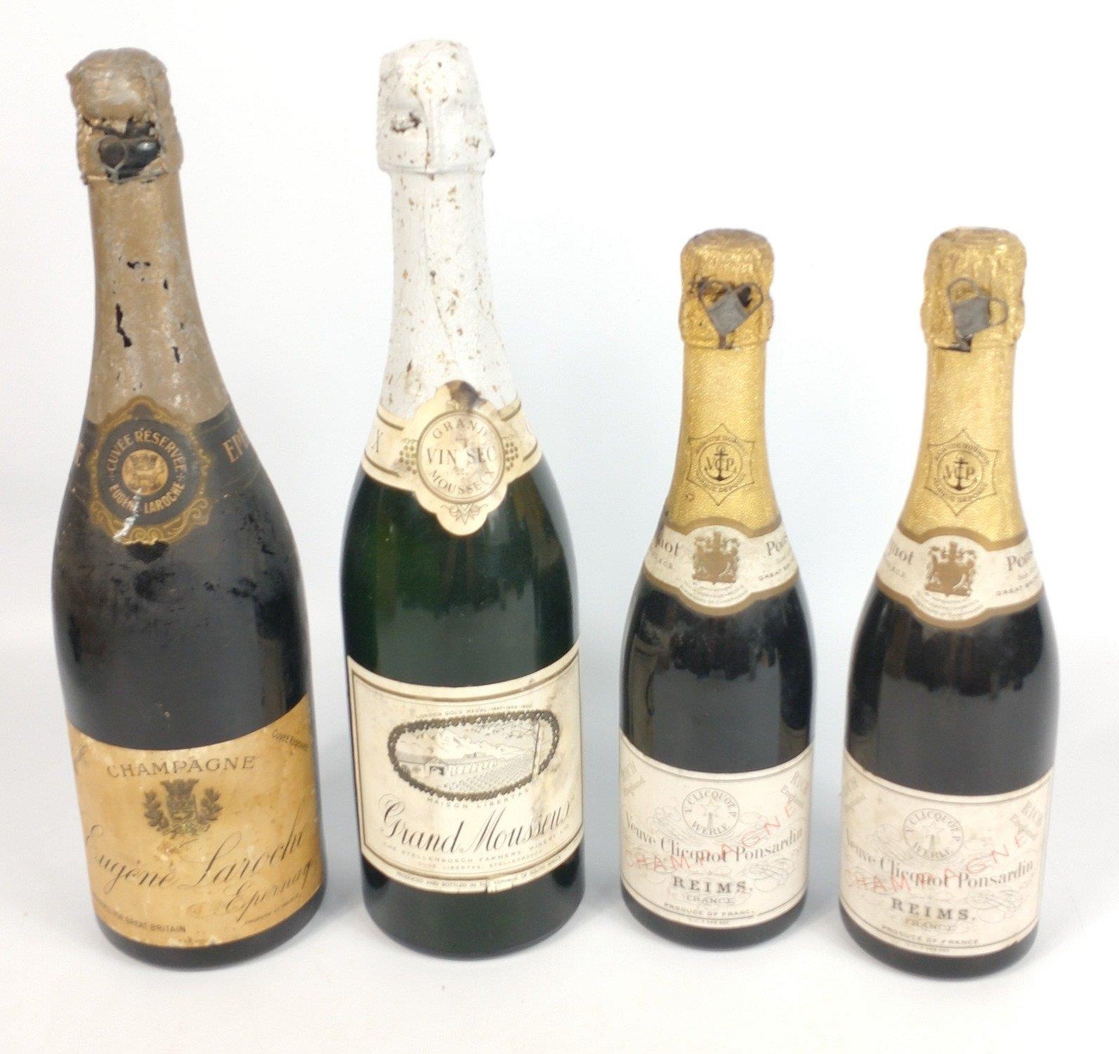 Two bottles of CHAMPAGNE one by Eugene Laroche Eugene also one South African Grand Mousseux and two half bottles of CHAMPAGNE by Veuve Clicquot Ponsardin. The item is sold as described and we do not accept liability for the state of the closure or the taste of the contents