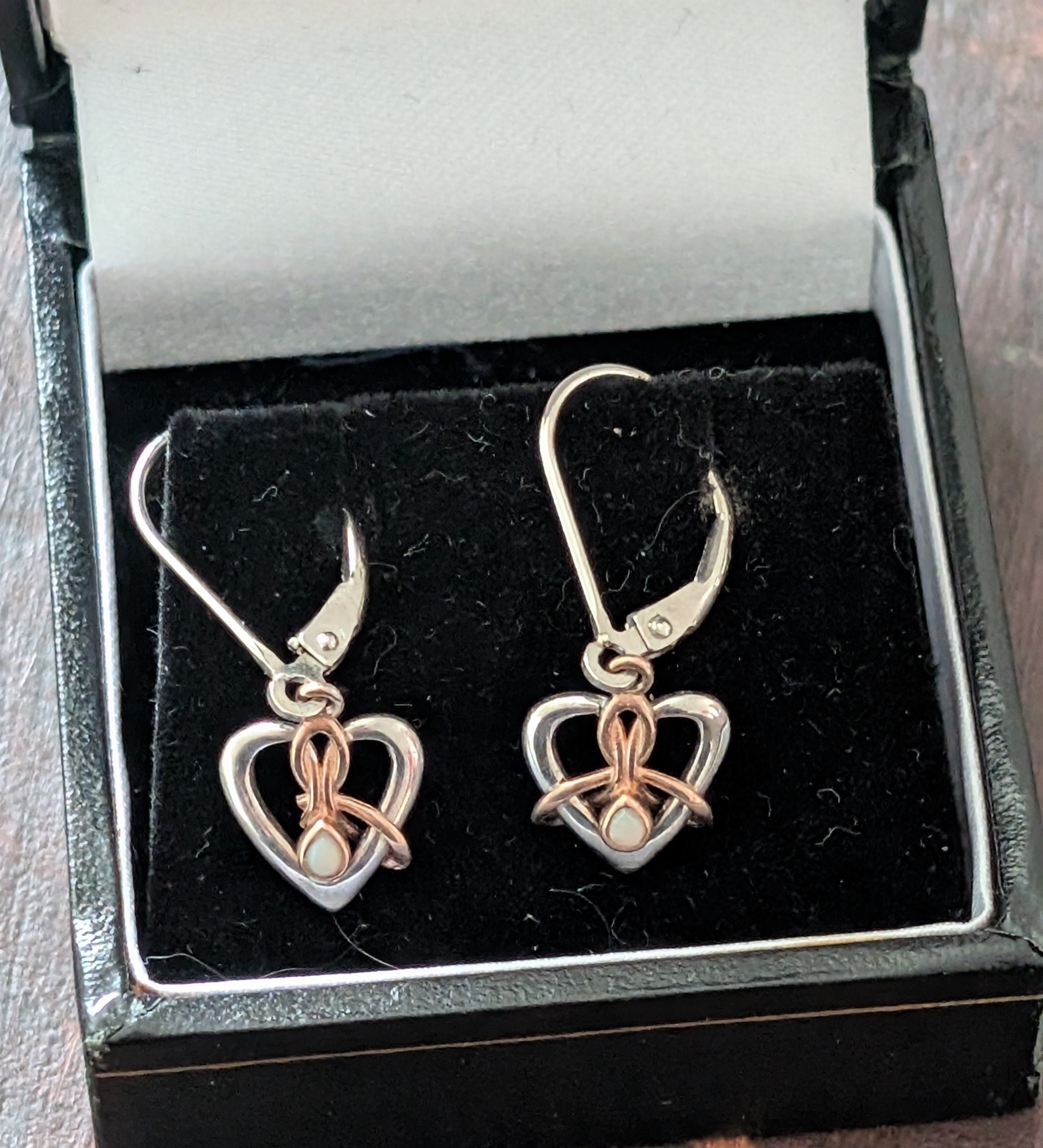 Clogau Dwynwen Sterling Silver and 9ct Rose Gold Diamond Drop Lever Back Earrings - At Fault - small piece of gold missing