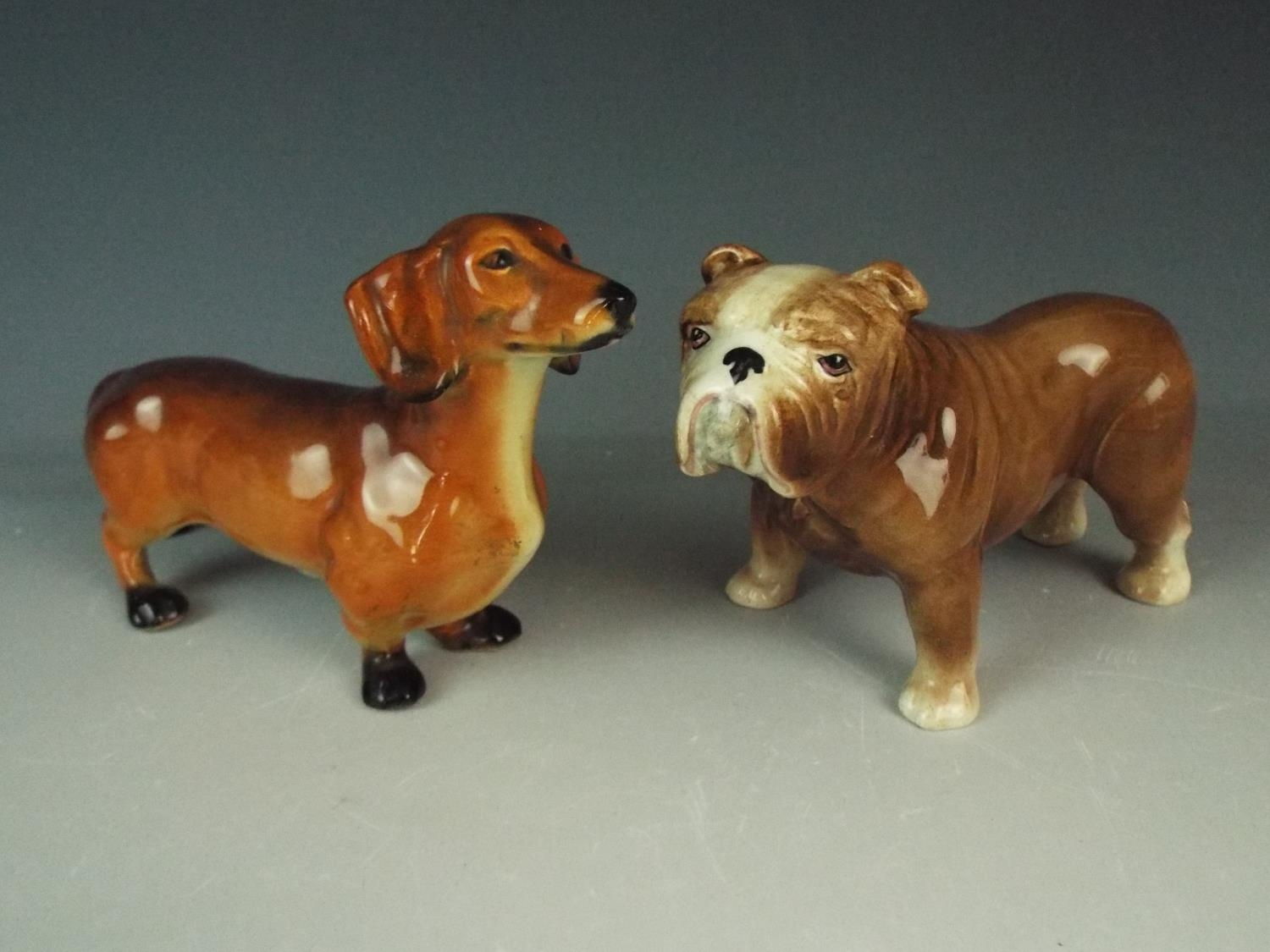 Sylvac Bulldog, model 155, 5 inches long plus West German made ceramic dachshund