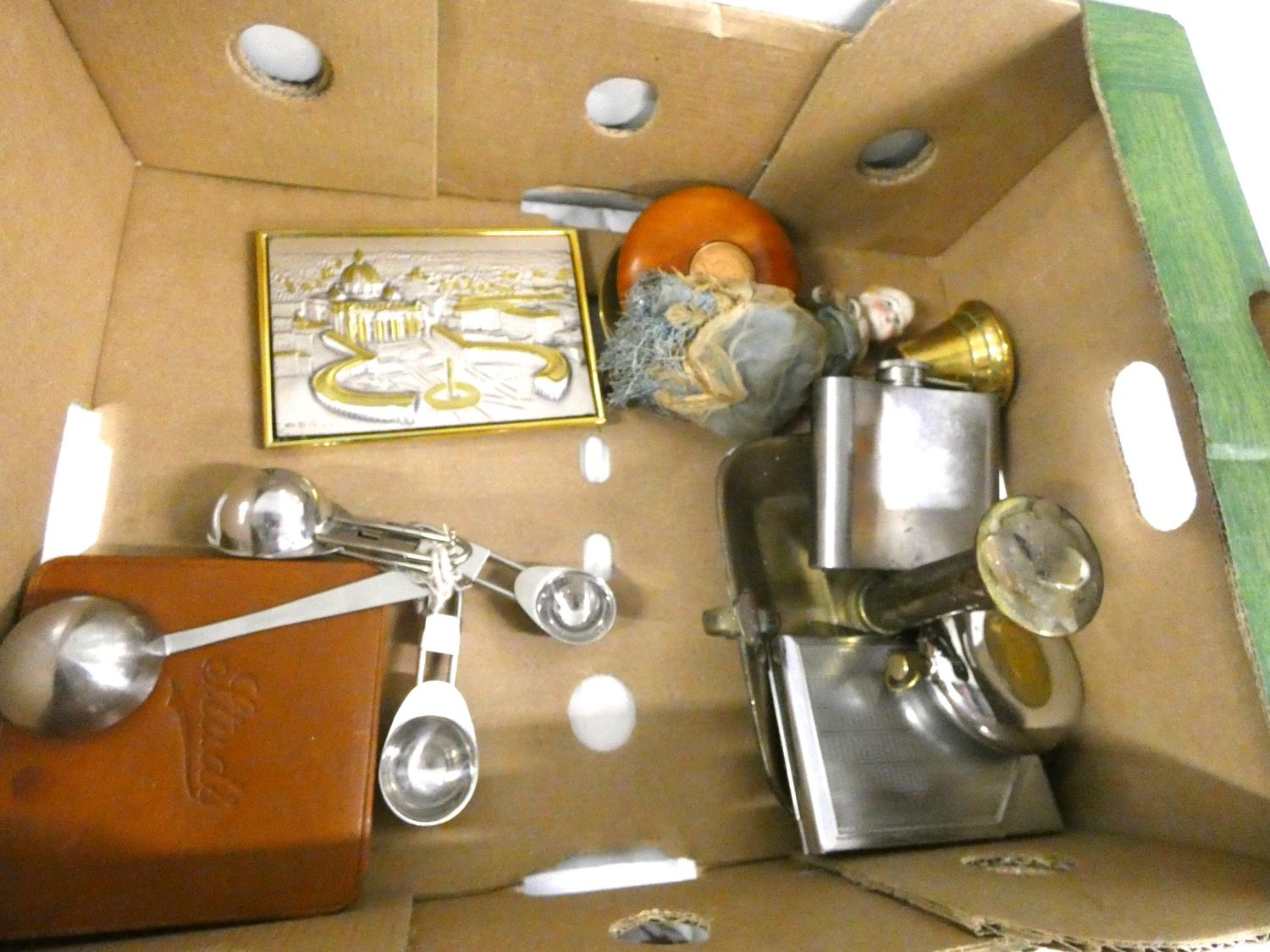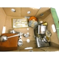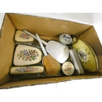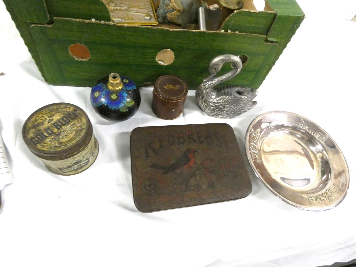 Box of vintage curios to include tins, clodonne scent bottle, chamber stick etc.