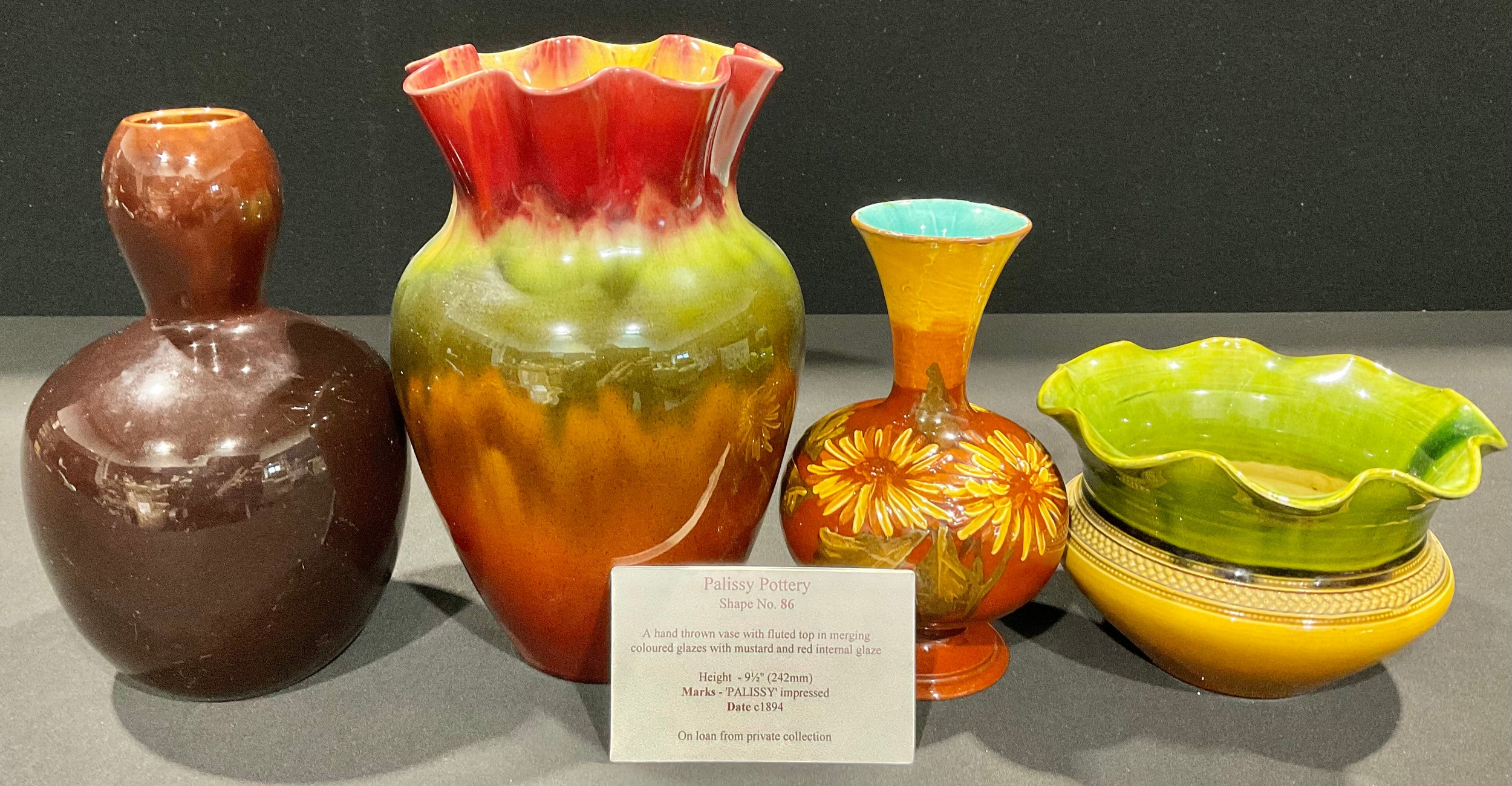 A pedestal ovoid vase, slender flared neck, impasto applied with chrysanthemum on a brown ground, turquoise interior glaze, 18cm, probaby Christopher Dresser for Linthorpe, unmarked, late 19th century; a Bretby Pottery stoneware jardiniere, 11cm, impressed sunburst mark, number 1723C, c.1900; a Bretby bottle vase, treacle glazed, 21.5cm, impressed mark; a Palissy majolica vase, drip glazed in shades of red, yellow, green and brown, 23.5cm, impressed mark, c,1890 (4)