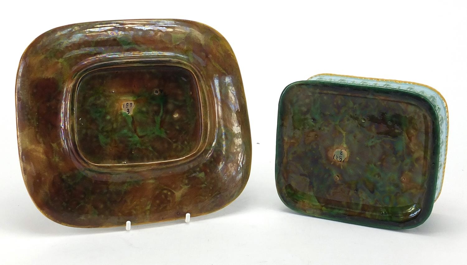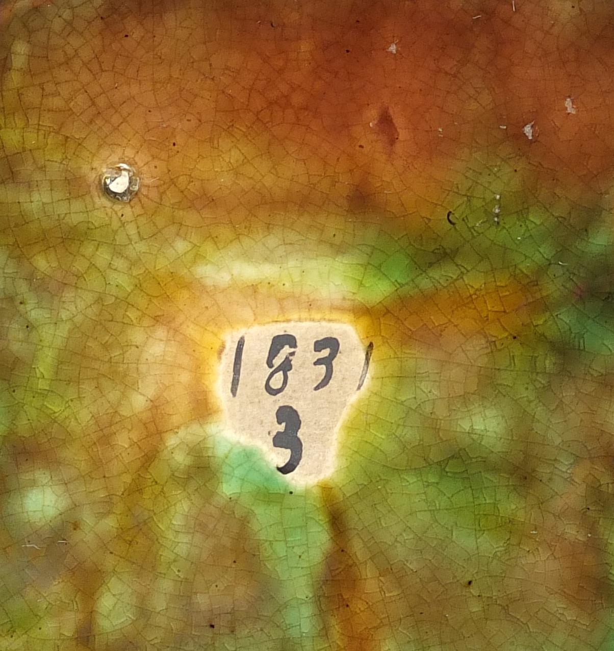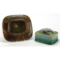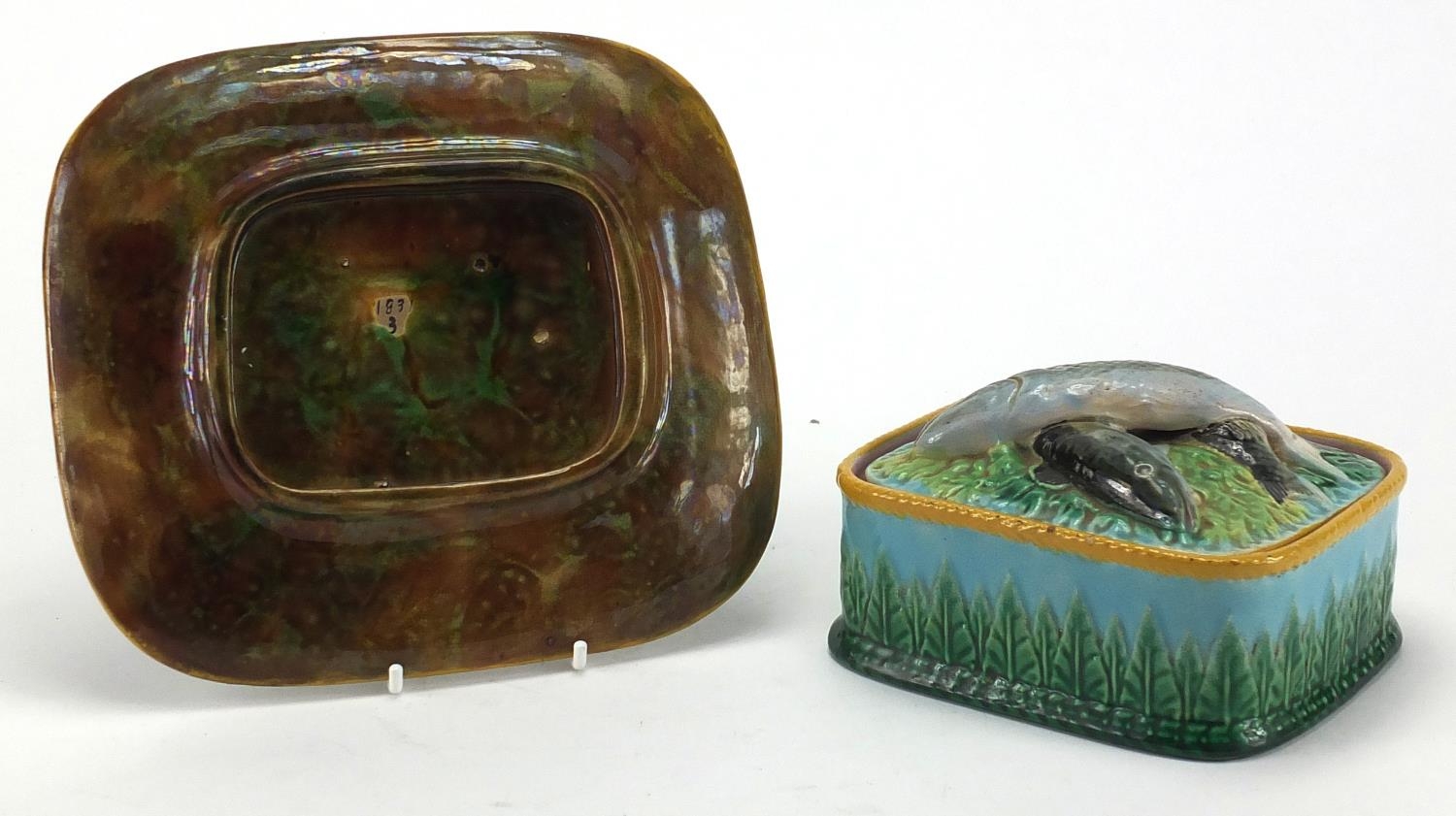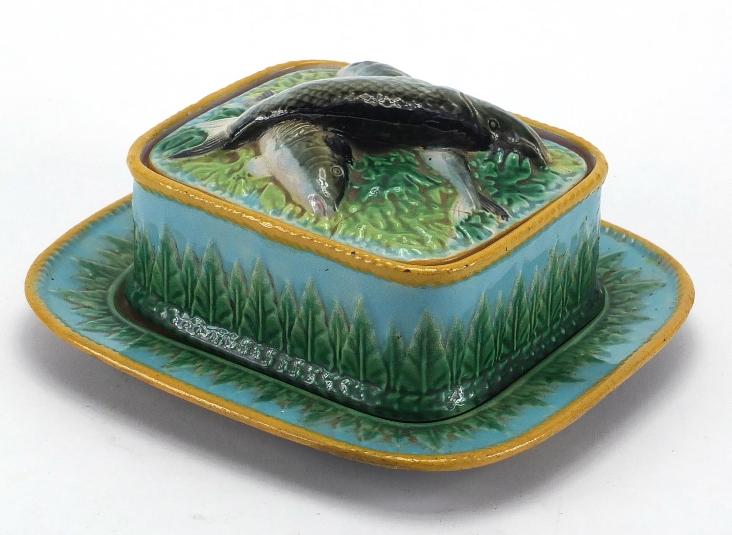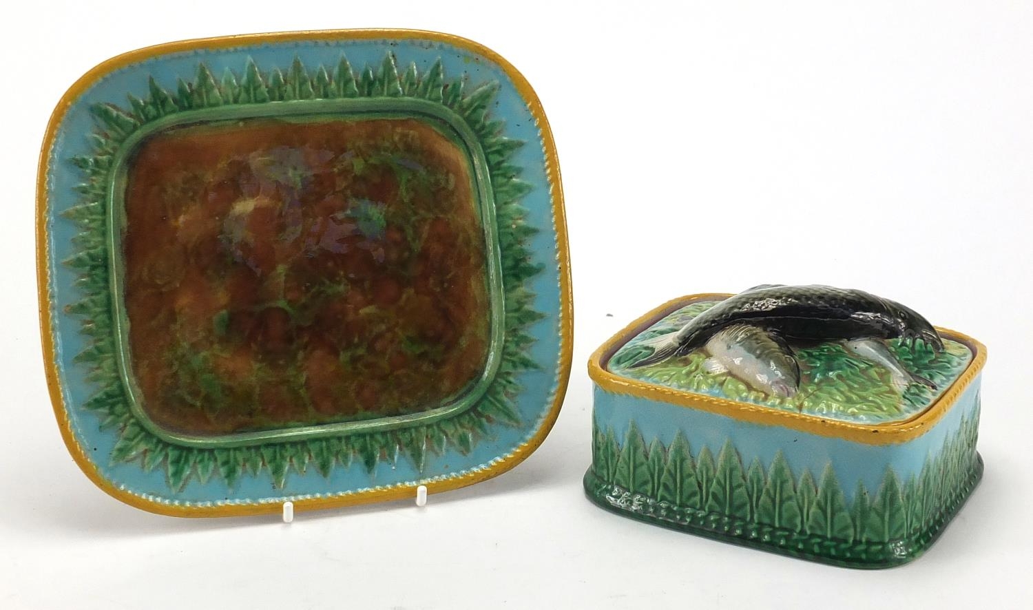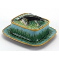 Victorian Majolica sardine dish and cover on stand, the lid hand painted and decorated in relief with three sardines, the stand 22cm wide