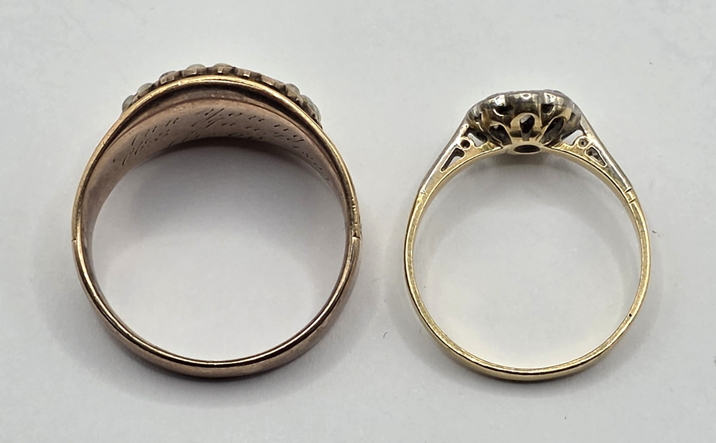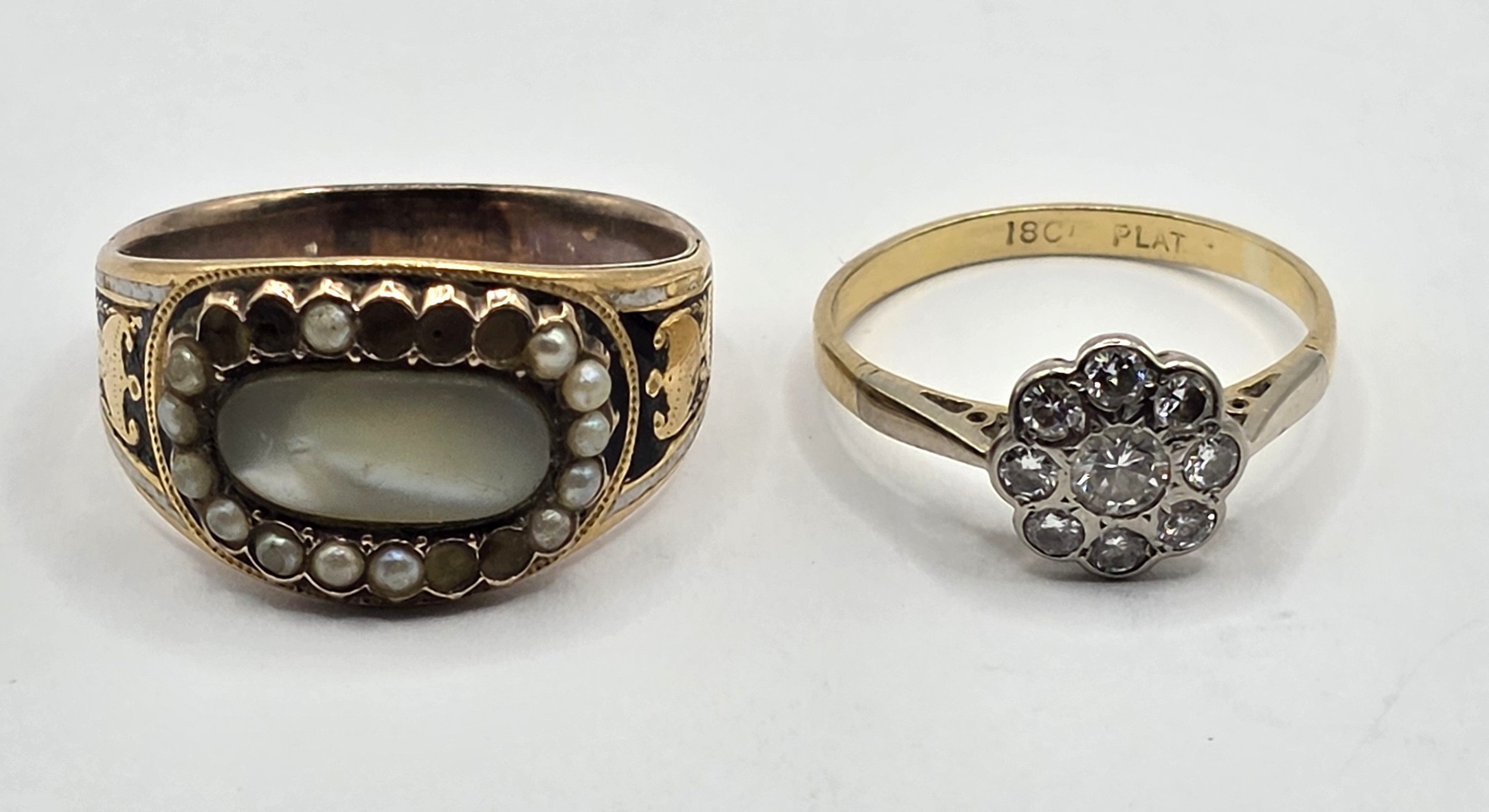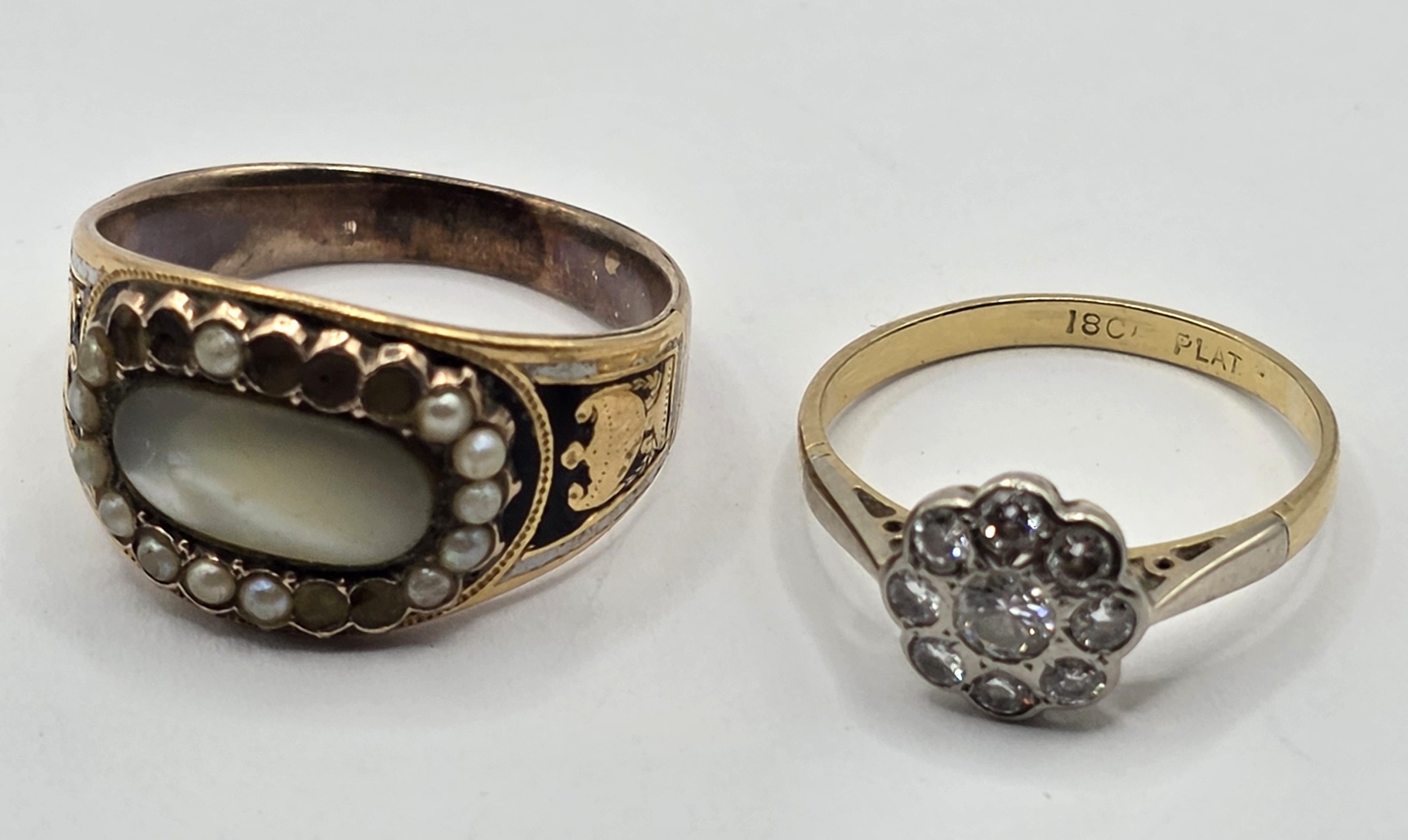 An early 20th century 18ct gold and diamond daisy ring, ring size K, and a 19th century yellow coloured metal and enamel, seed pearl and mother of pearl ring, ring size P (2)