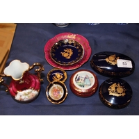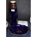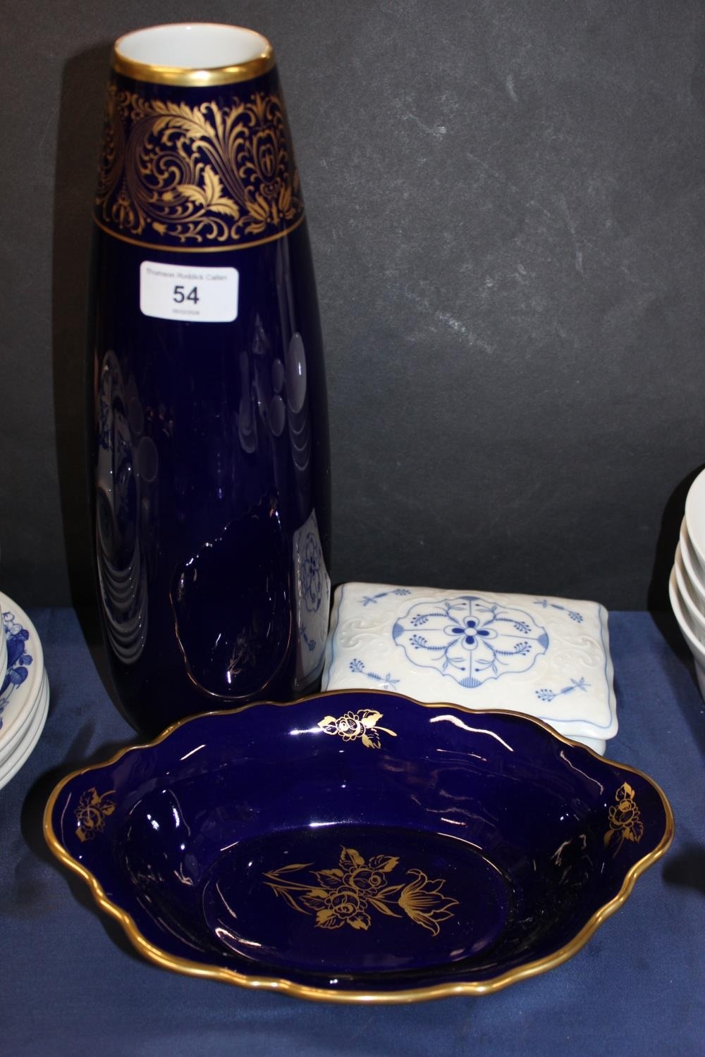 Hutschenreuther Selb Echt Kobalt, Bavaria, Germany cobalt and gilt vase, an Unter Weiss Bach GDR Echt Kobalt oval bowl, and a Schumann Arzberg blue and white candy box with lid.