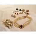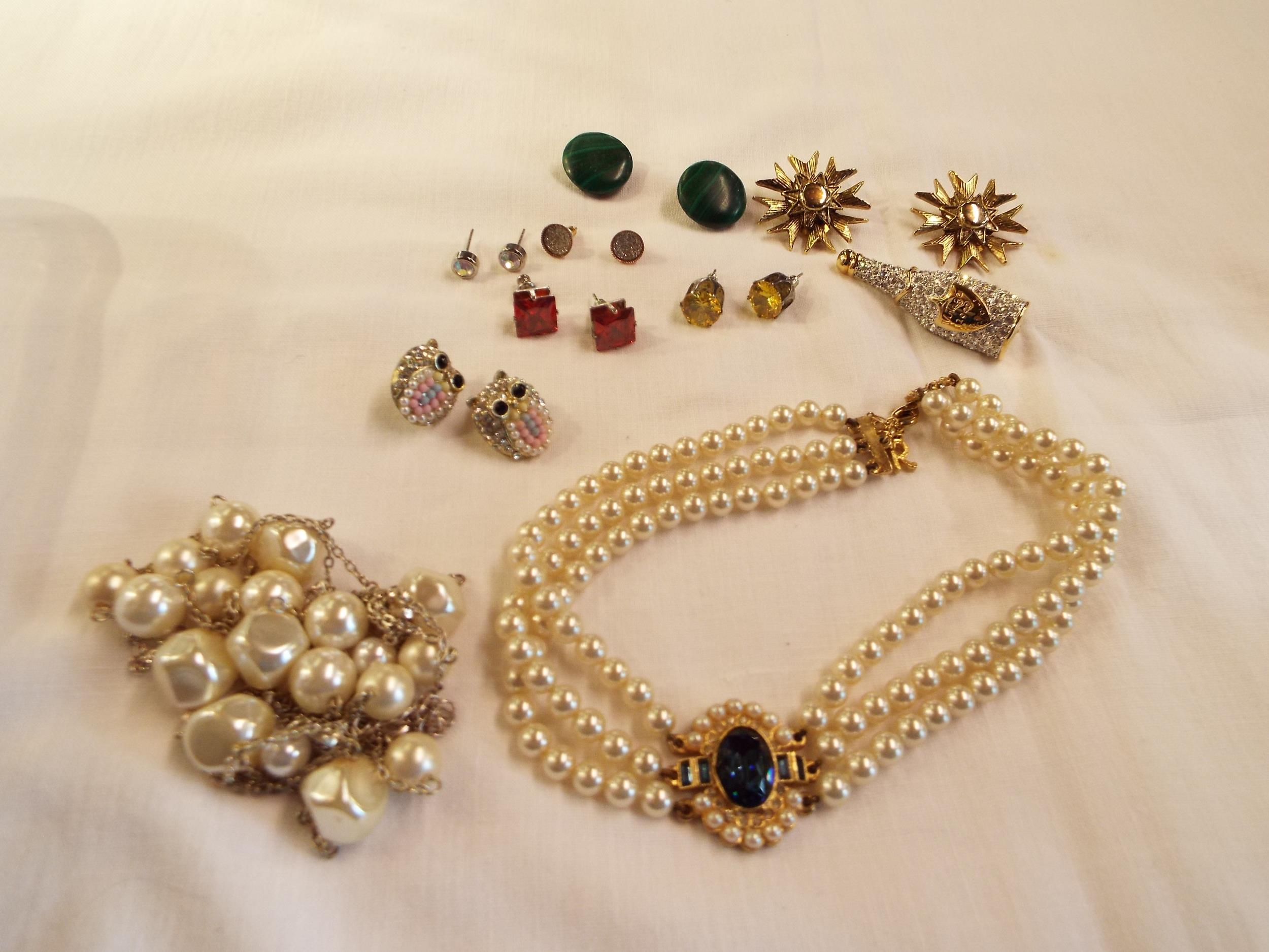 A mixed selection of assorted costume jewellery to include a vintage pearl and paste chocker, a pair of malachite clip on earrings, gold tone earring etc
